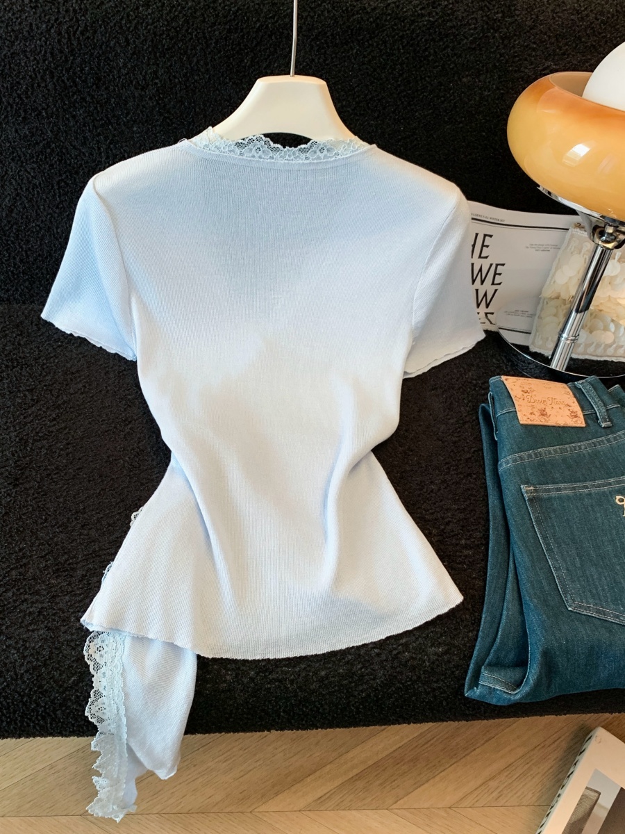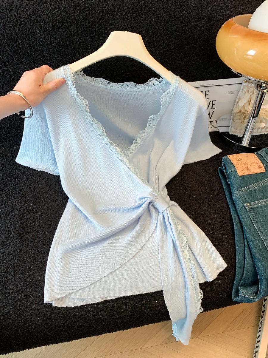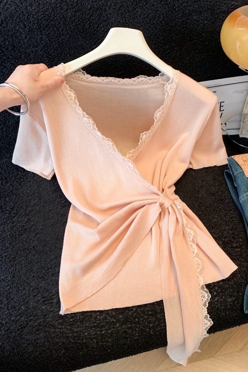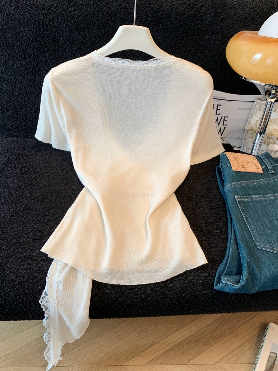 실사 한 부서 달콤함 불규칙 리본 슬림해 보이는 반팔 여성 여름 새로운 다용도 디자인 센스 주름 니트 스웨터