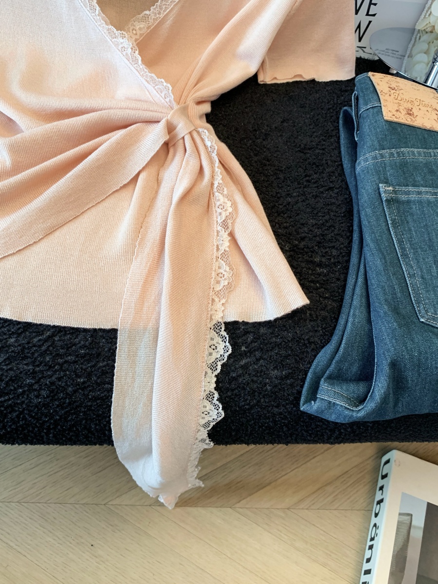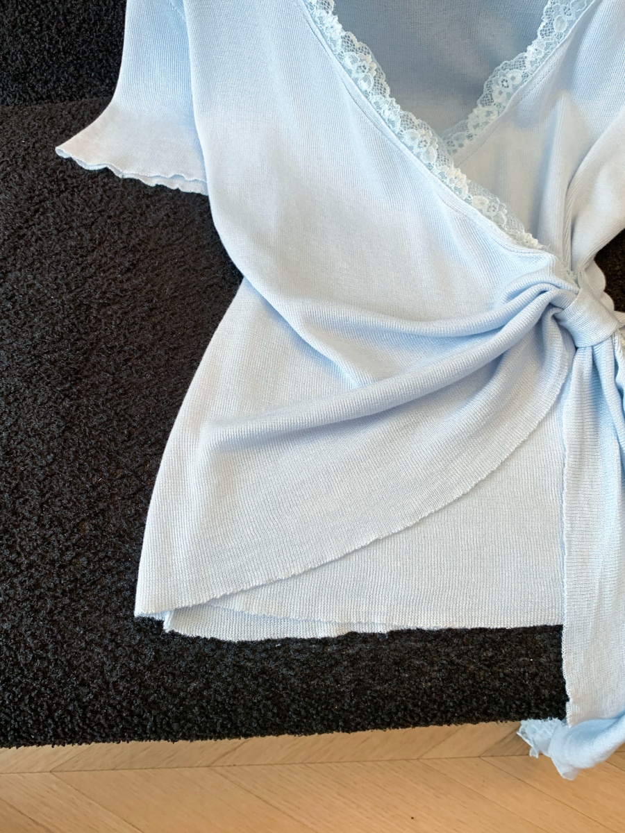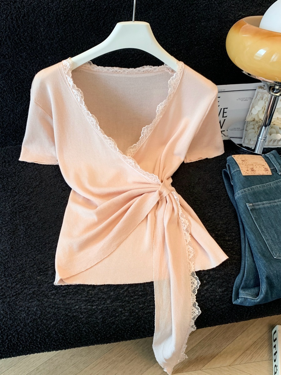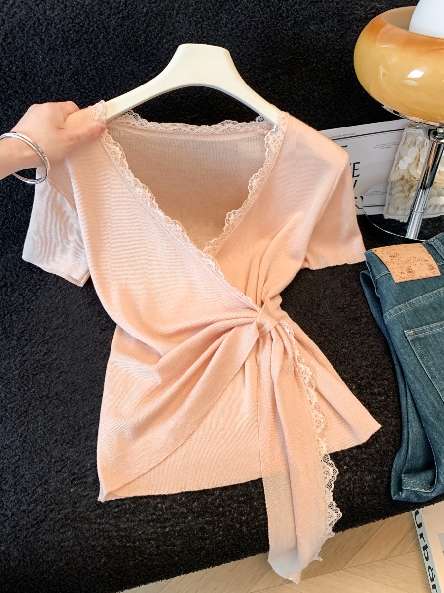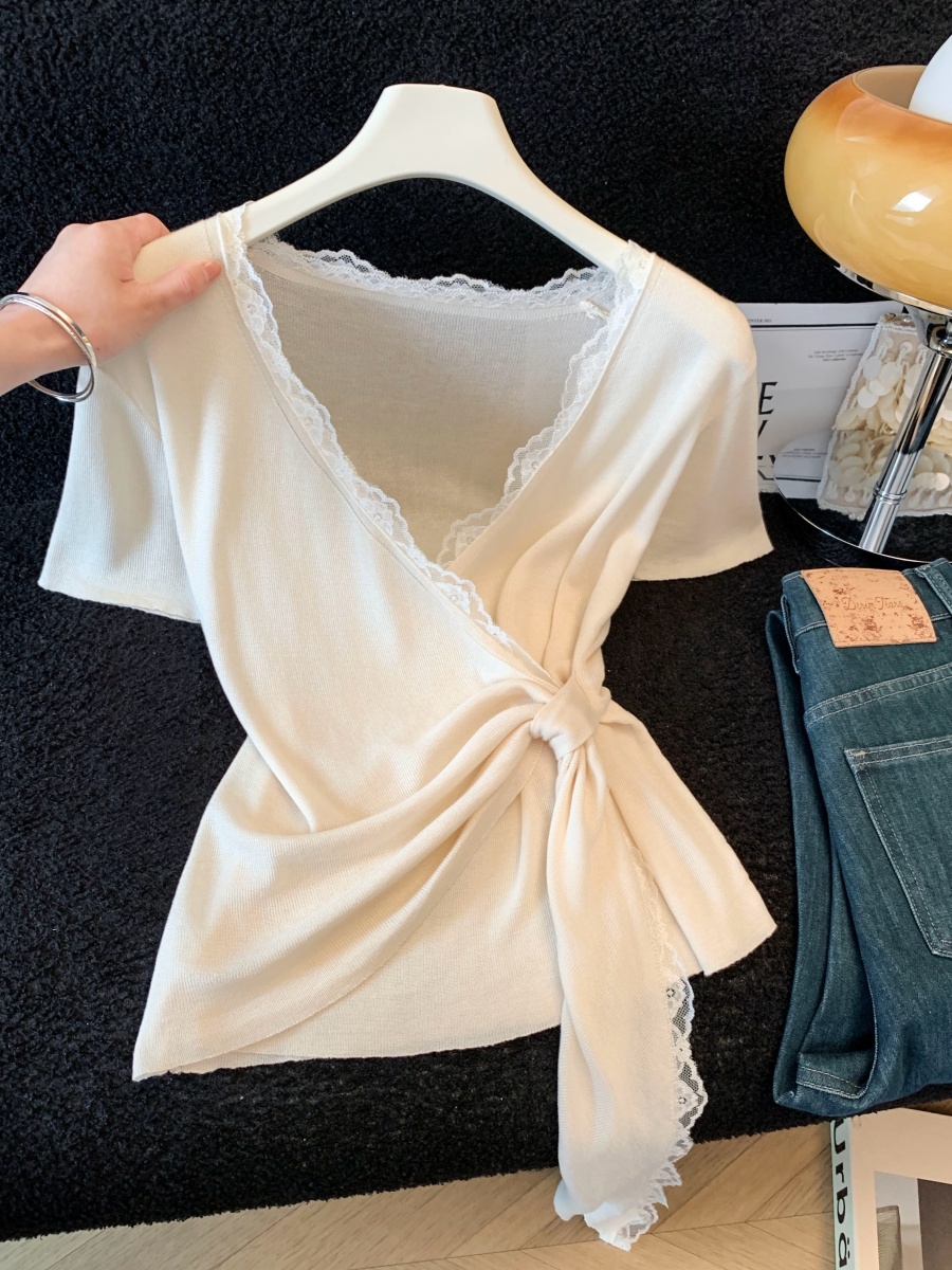 실사 한 부서 달콤함 불규칙 리본 슬림해 보이는 반팔 여성 여름 새로운 다용도 디자인 센스 주름 니트 스웨터