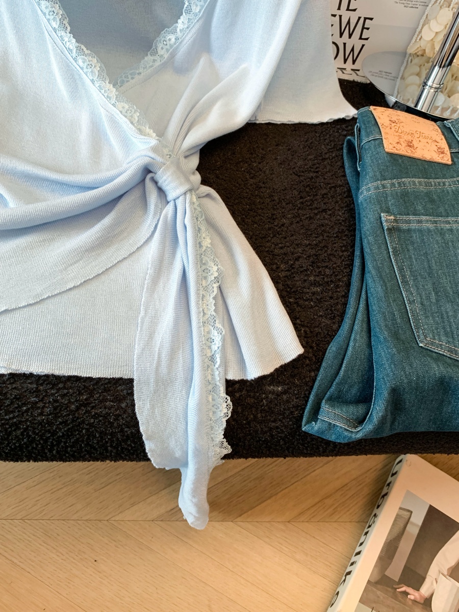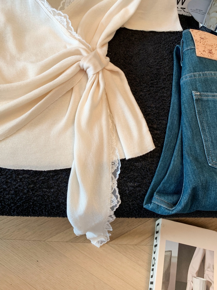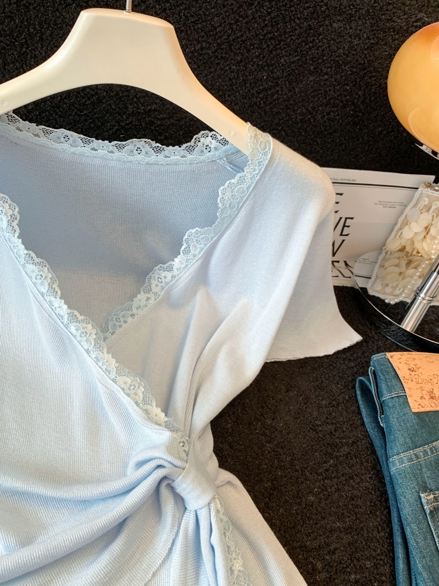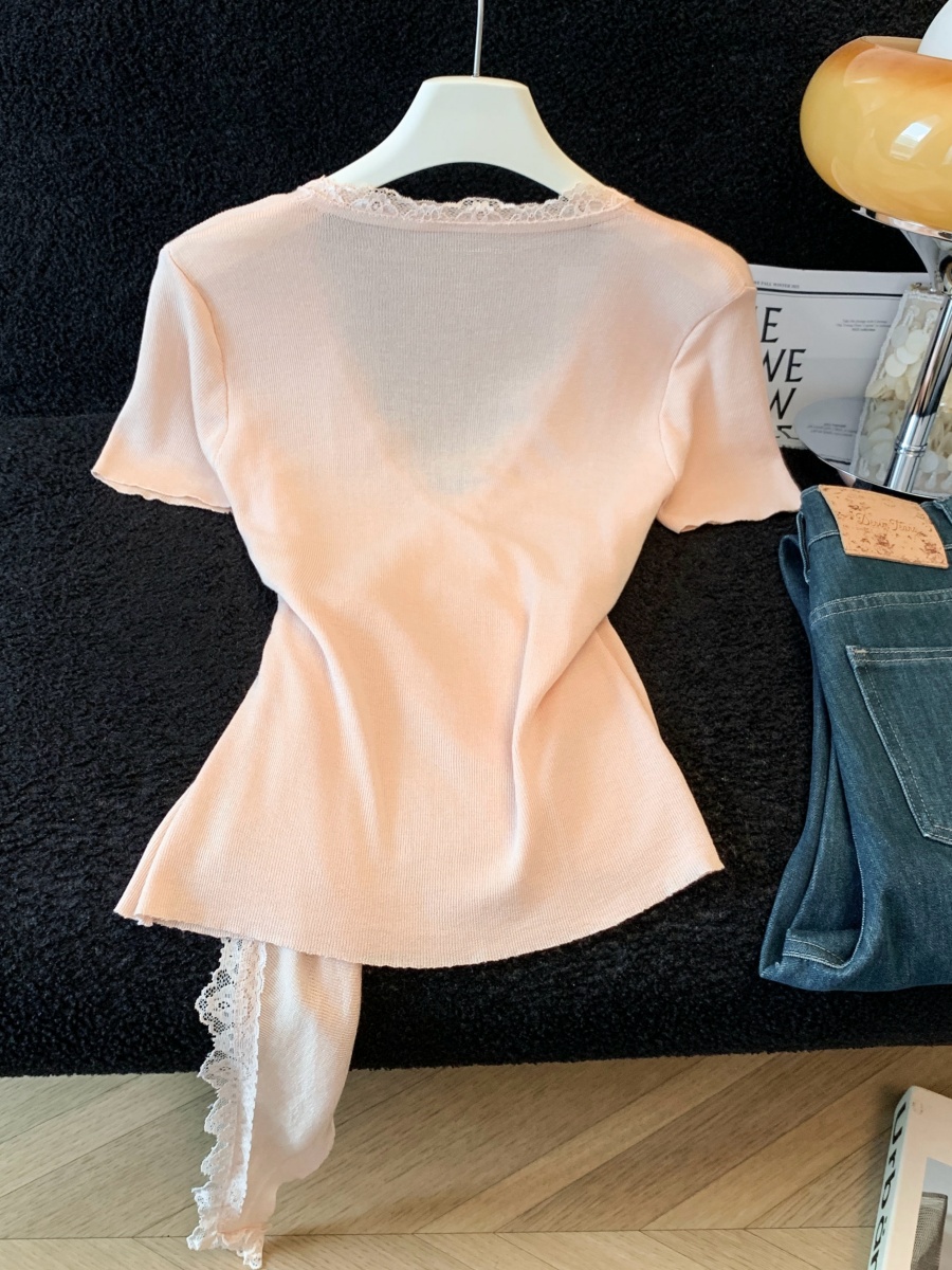 실사 한 부서 달콤함 불규칙 리본 슬림해 보이는 반팔 여성 여름 새로운 다용도 디자인 센스 주름 니트 스웨터