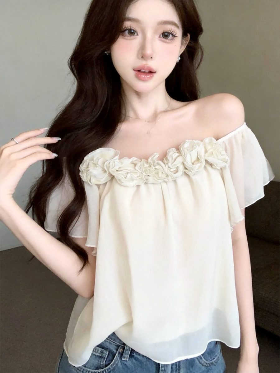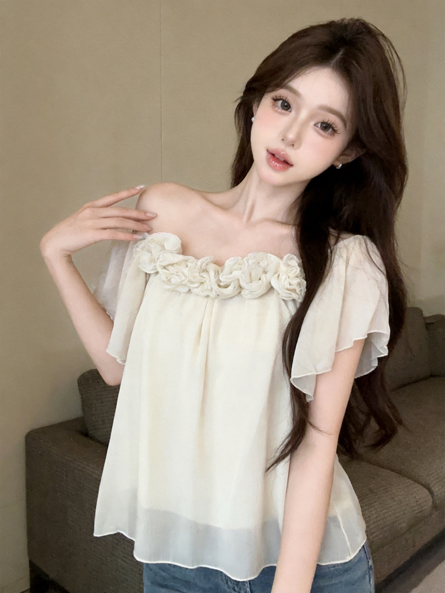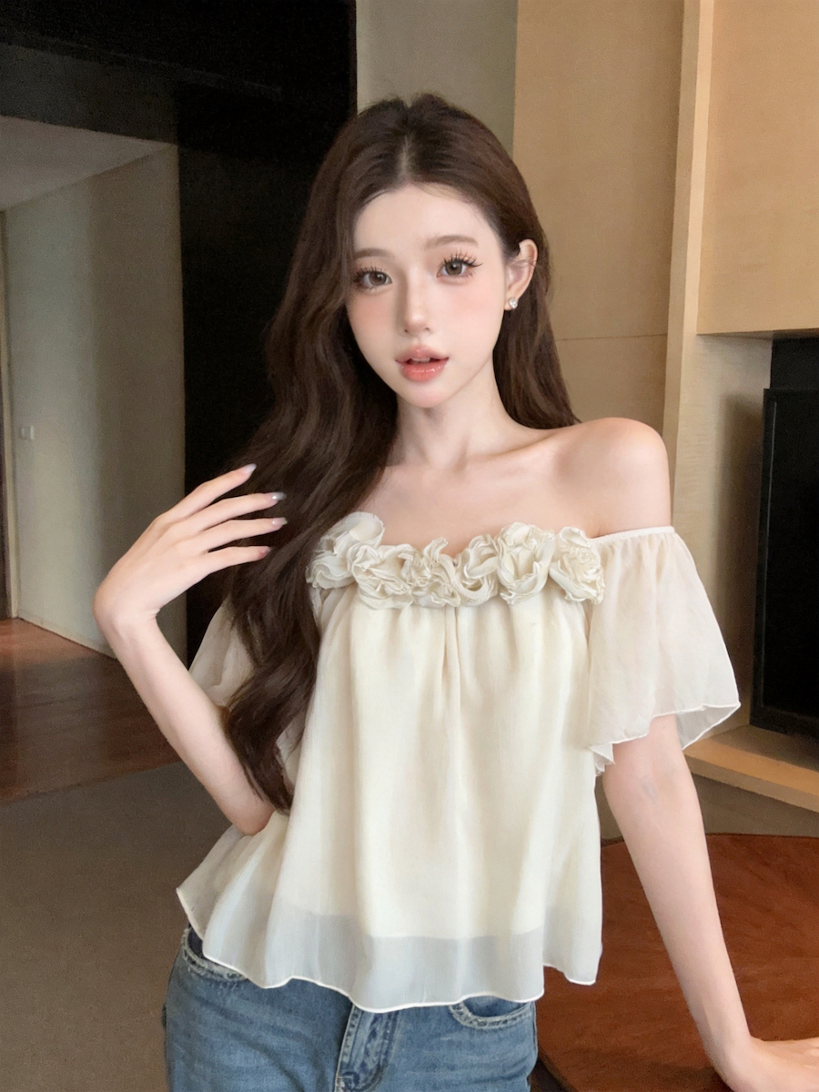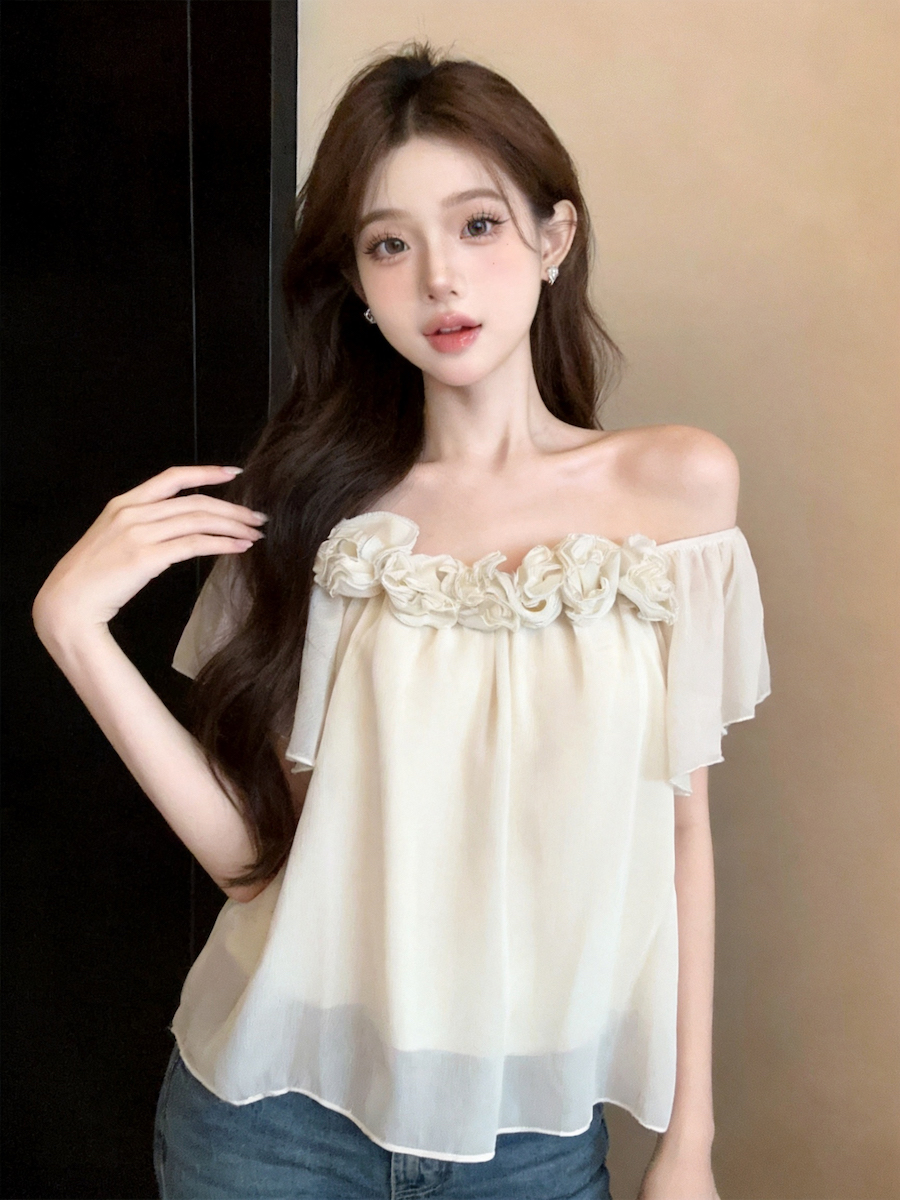 정가 있음 보호 낭만주의 3 차원 꽃 오프숄더 여성 셔츠 여름 새로운 루즈핏 슬림해 보이는 디자인 센스 맨위