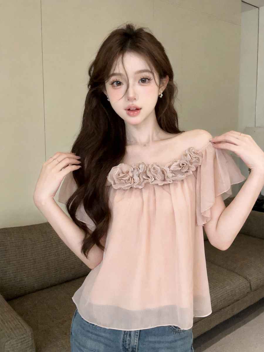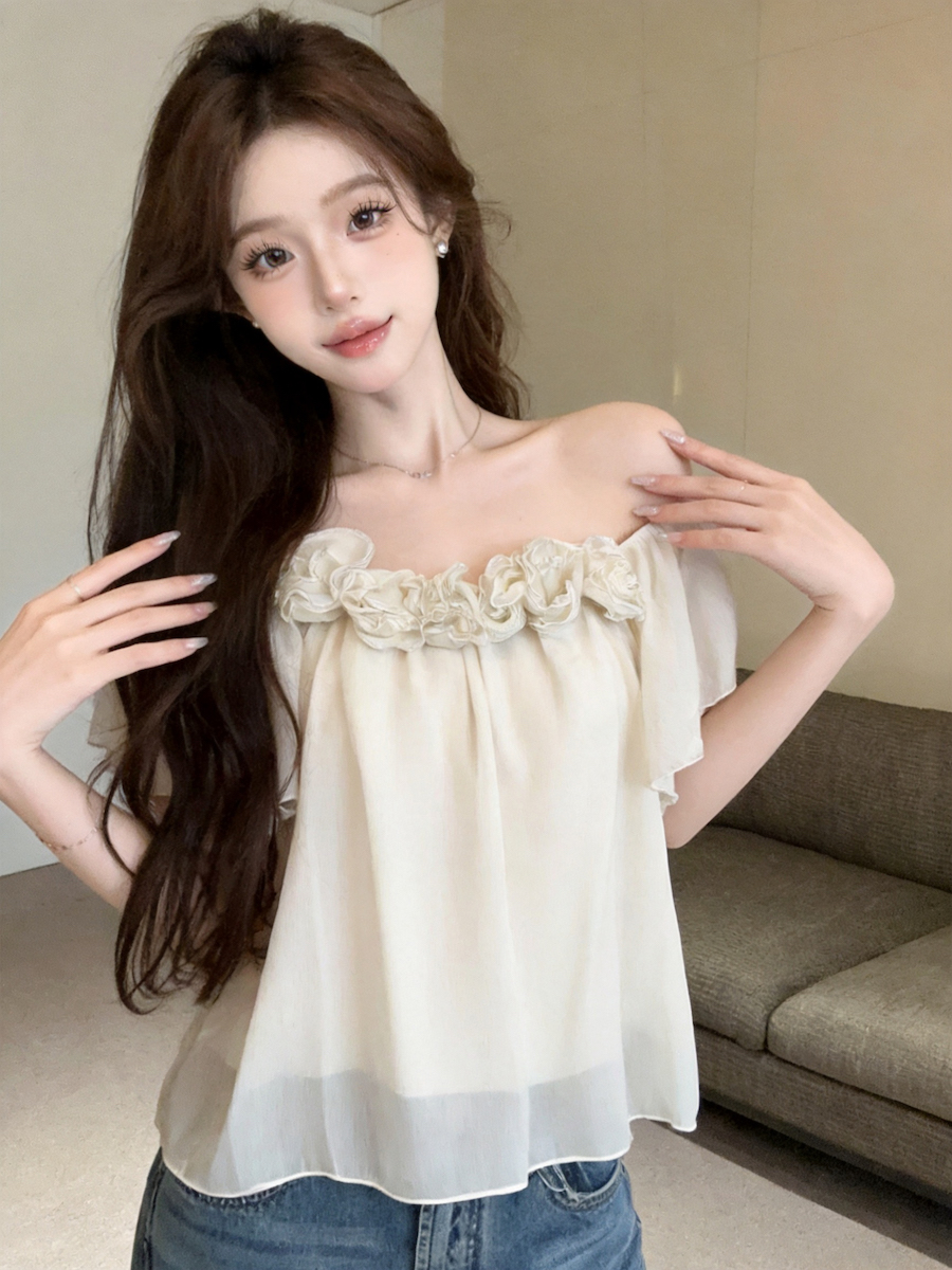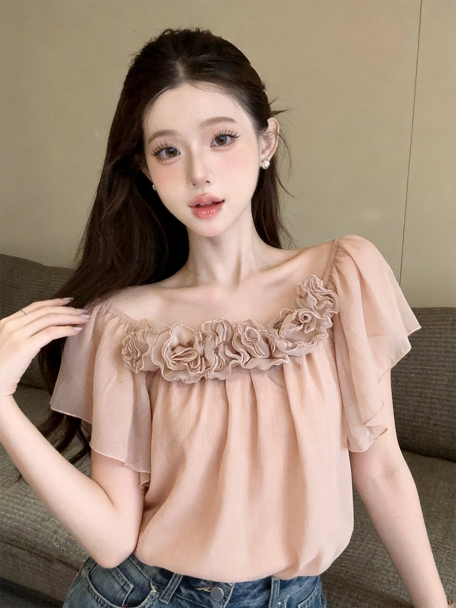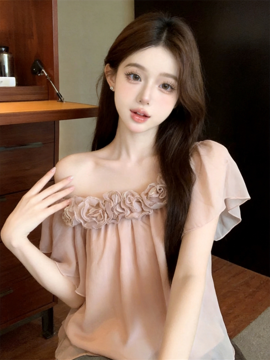 정가 있음 보호 낭만주의 3 차원 꽃 오프숄더 여성 셔츠 여름 새로운 루즈핏 슬림해 보이는 디자인 센스 맨위