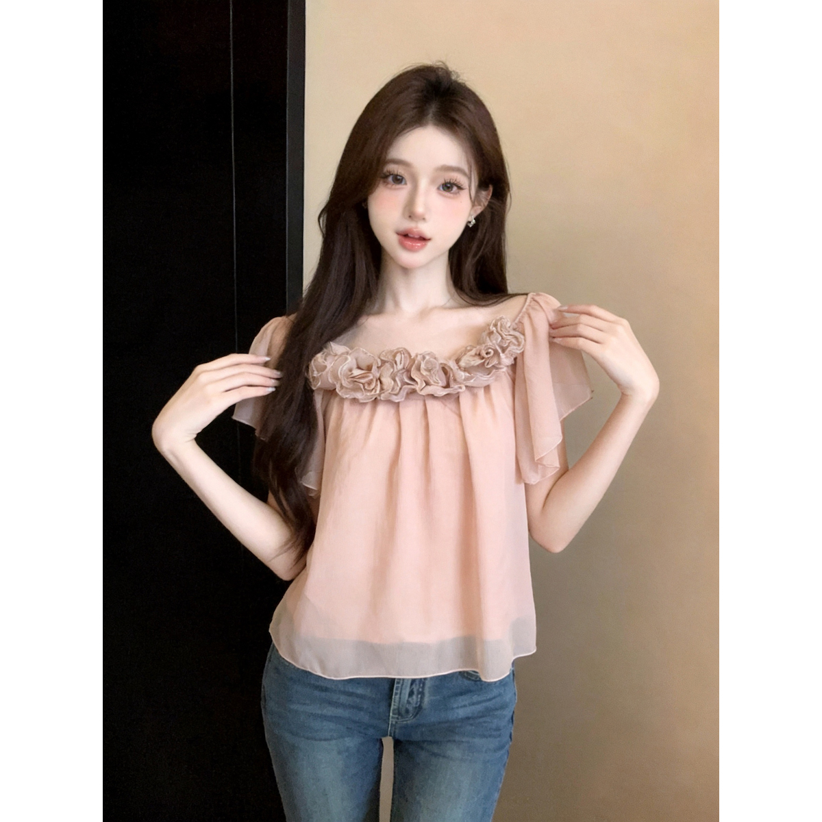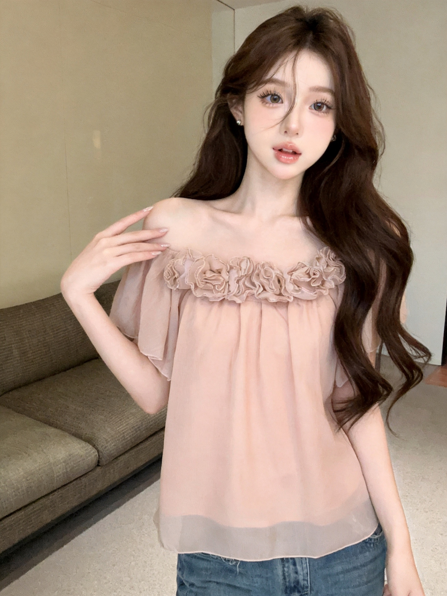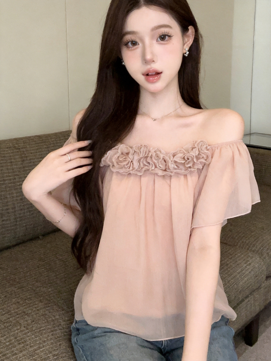 정가 있음 보호 도파민 프릴 꽃밭 오프숄더 쉬폰 여성 셔츠 여름 품격 반팔 맨위