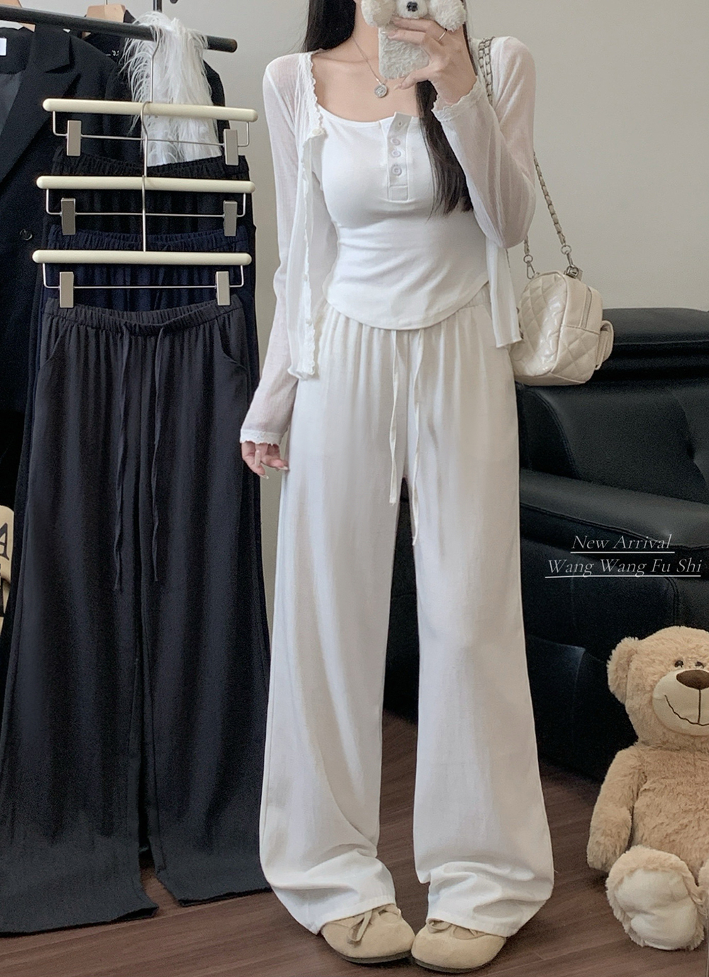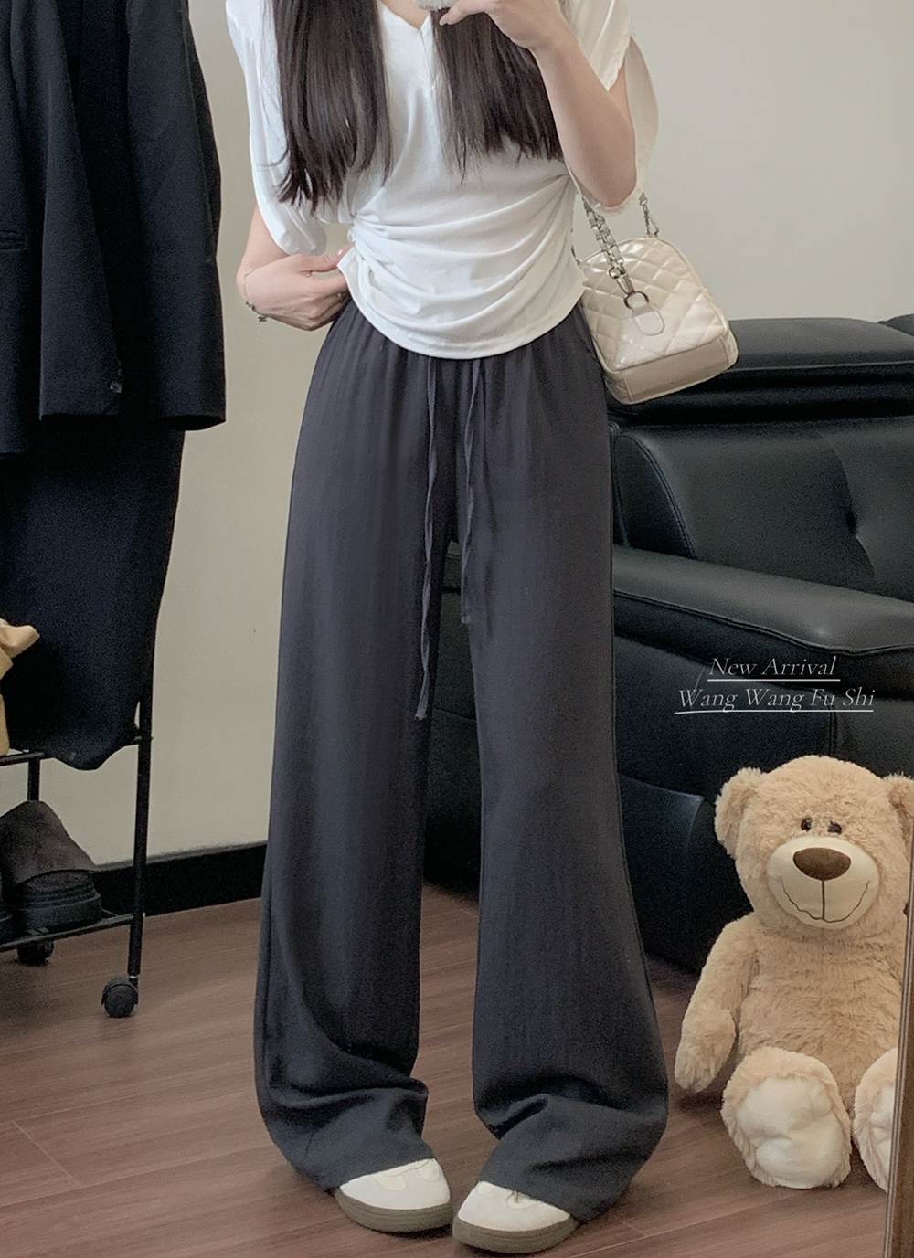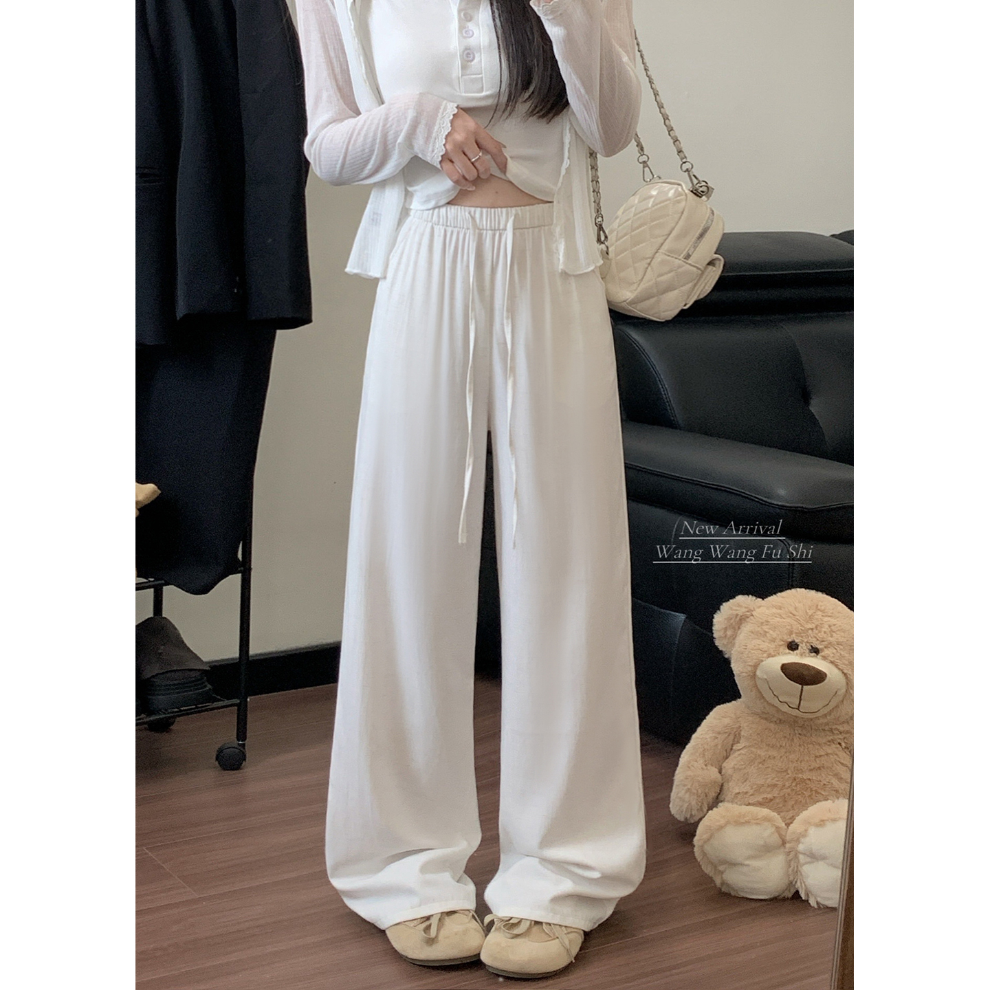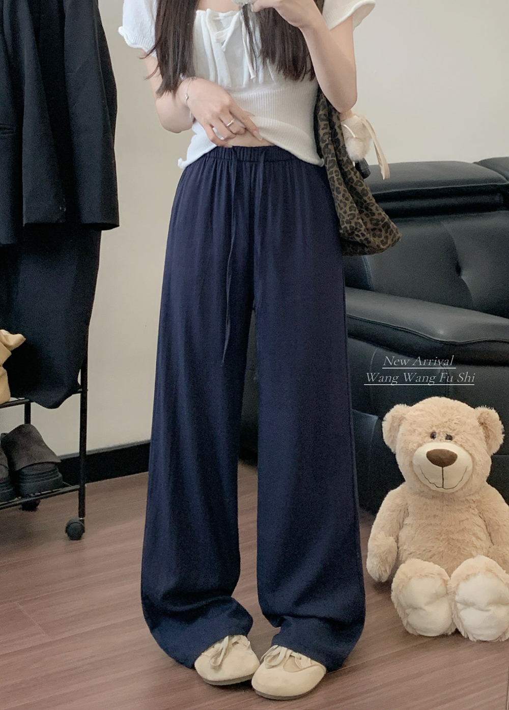 실사 2026 새로운 개성 펌프 로프 와이드 레그 팬츠 레이스업 허리밴드 캐주얼 루즈핏 바지 여성
