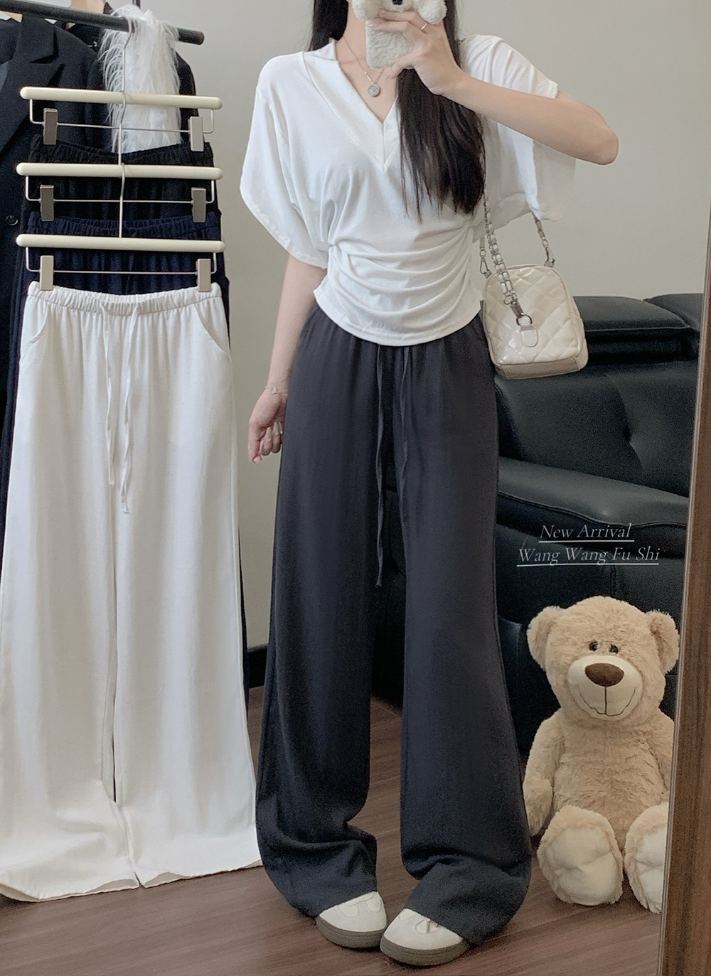 실사 2026 새로운 개성 허리 머리 디자인 센스 와이드 레깅스 바지 도루 센스 루즈핏 캐주얼 바닥 청소 바지