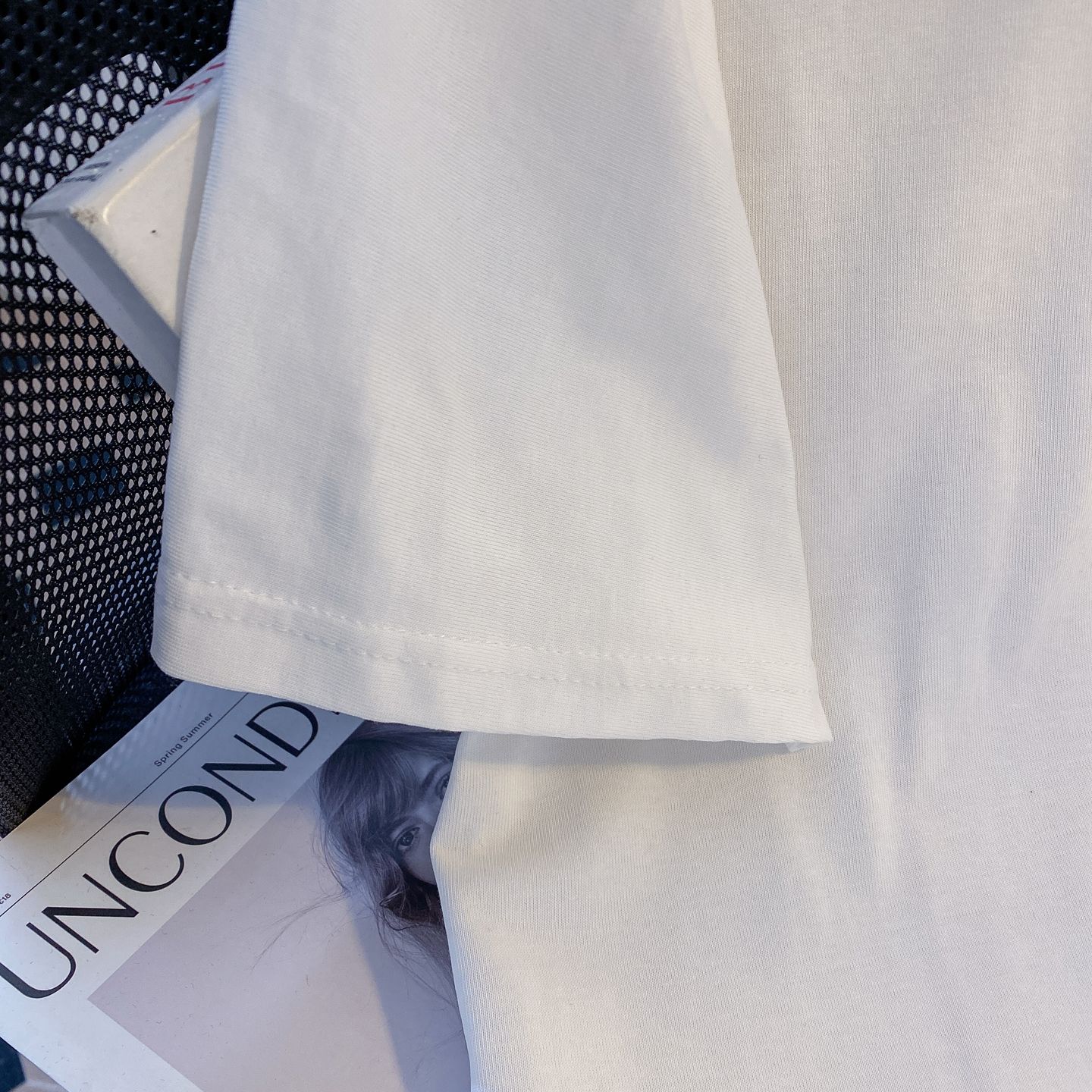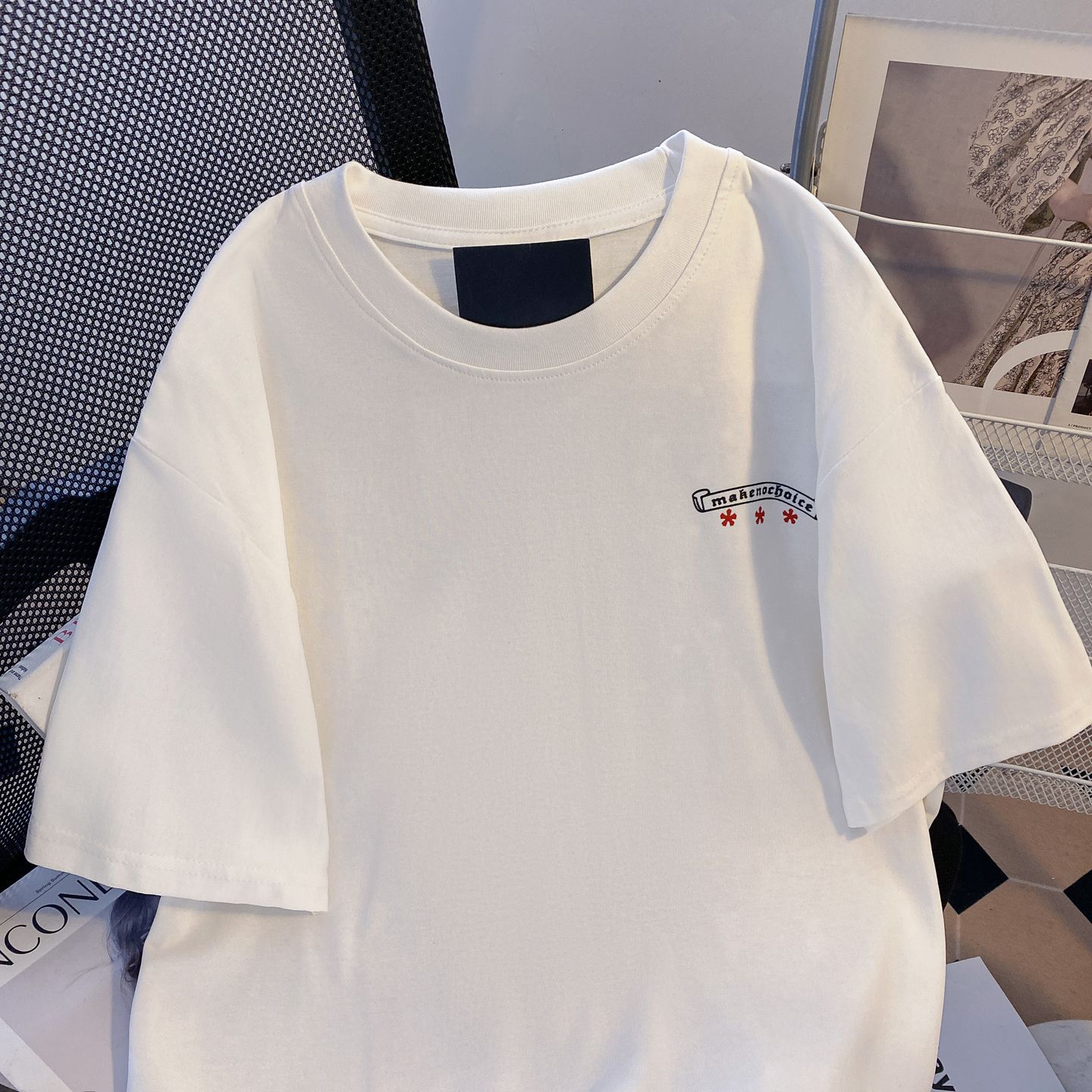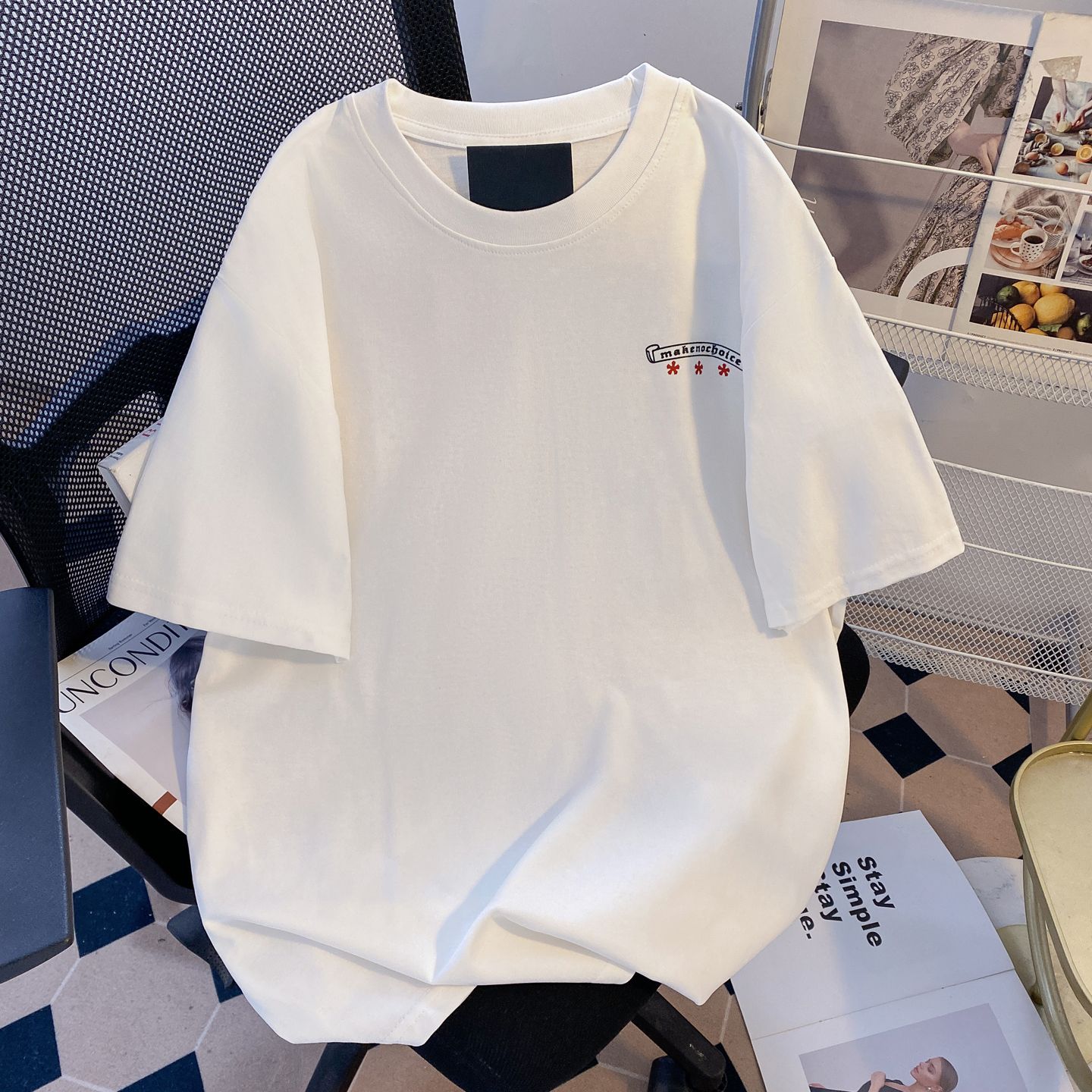 실사 더블 실 240 그램 순면 반팔 티셔츠 여성 여름 새로운 루즈핏 긍정적 인 어깨 알파벳 자수 라운드 넥 맨위