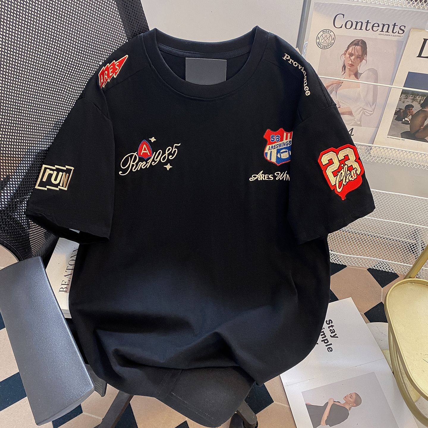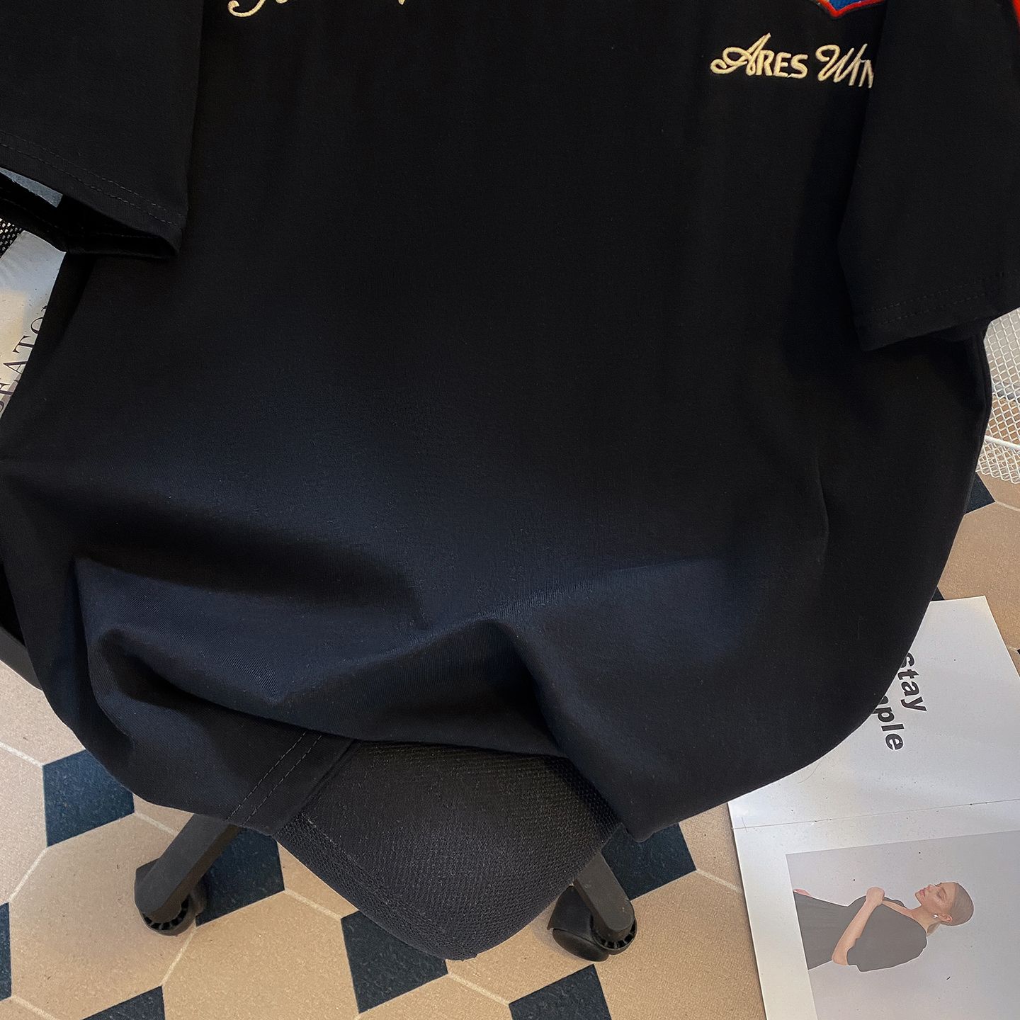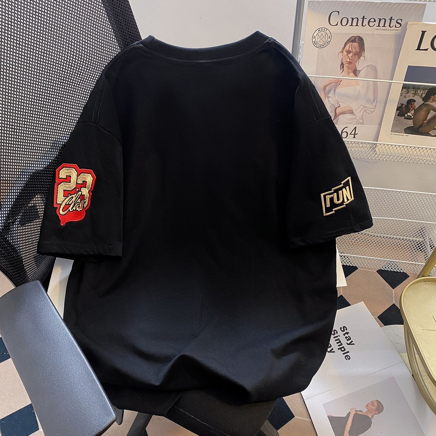 실사 더블 실 240 그램 순면 반팔 티셔츠 여성 여름 새로운 루즈핏 긍정적 인 어깨 알파벳 자수 라운드 넥 맨위