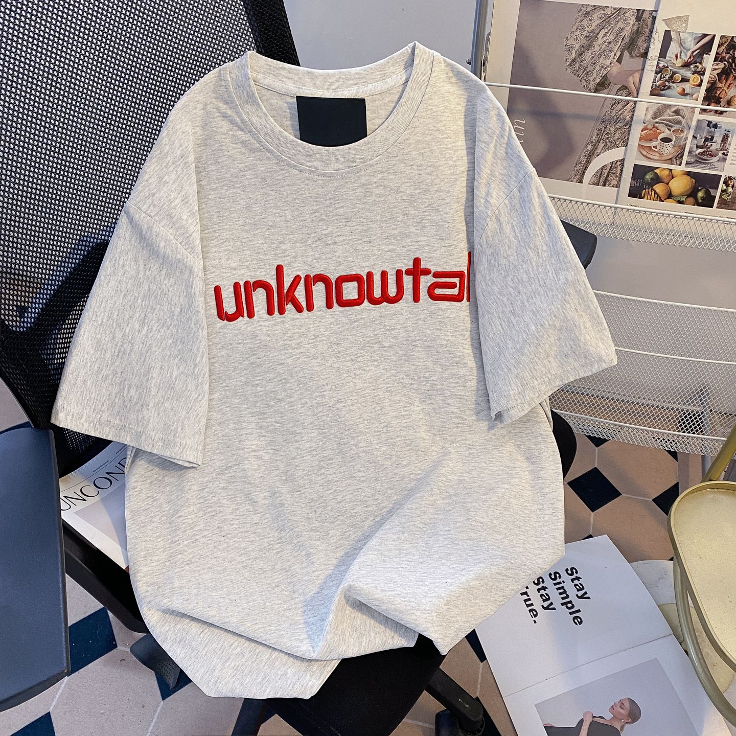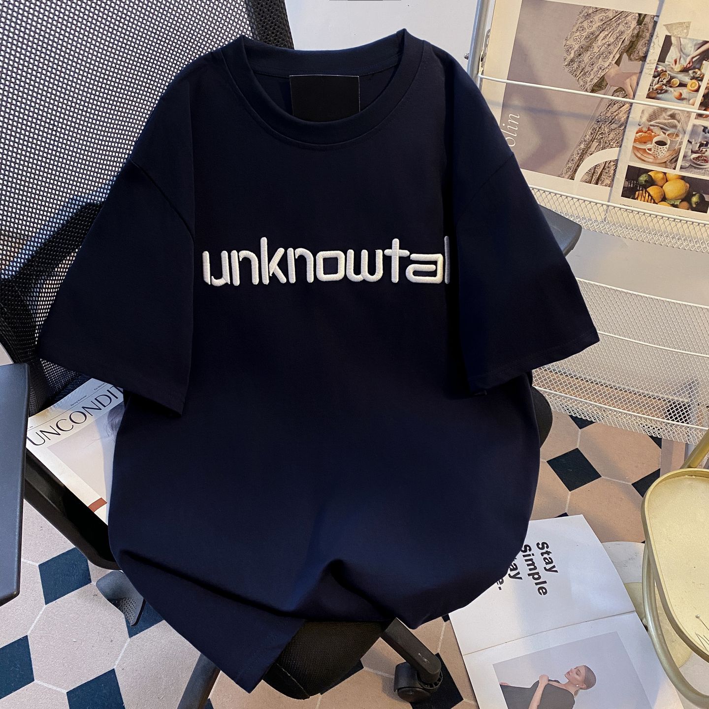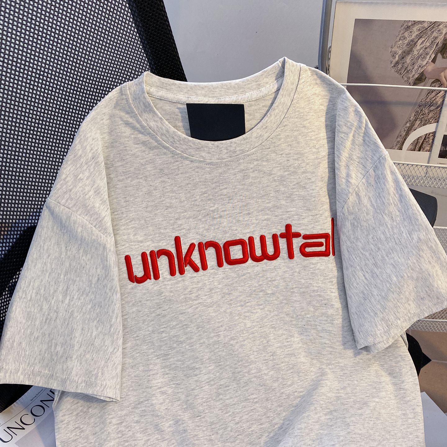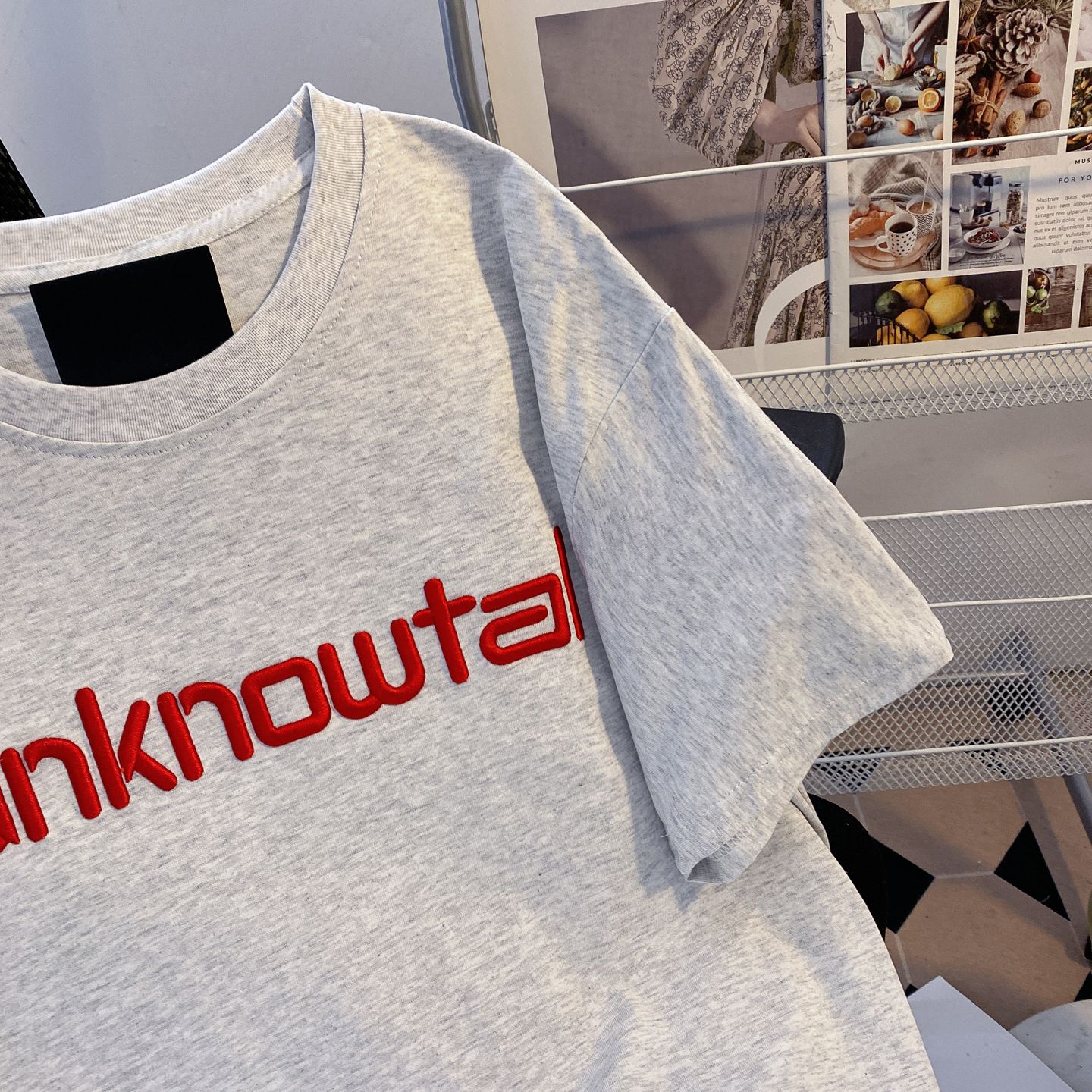실사 더블 실 240 그램 순면 반팔 티셔츠 여성 여름 새로운 루즈핏 긍정적 인 어깨 알파벳 자수 라운드 넥 맨위