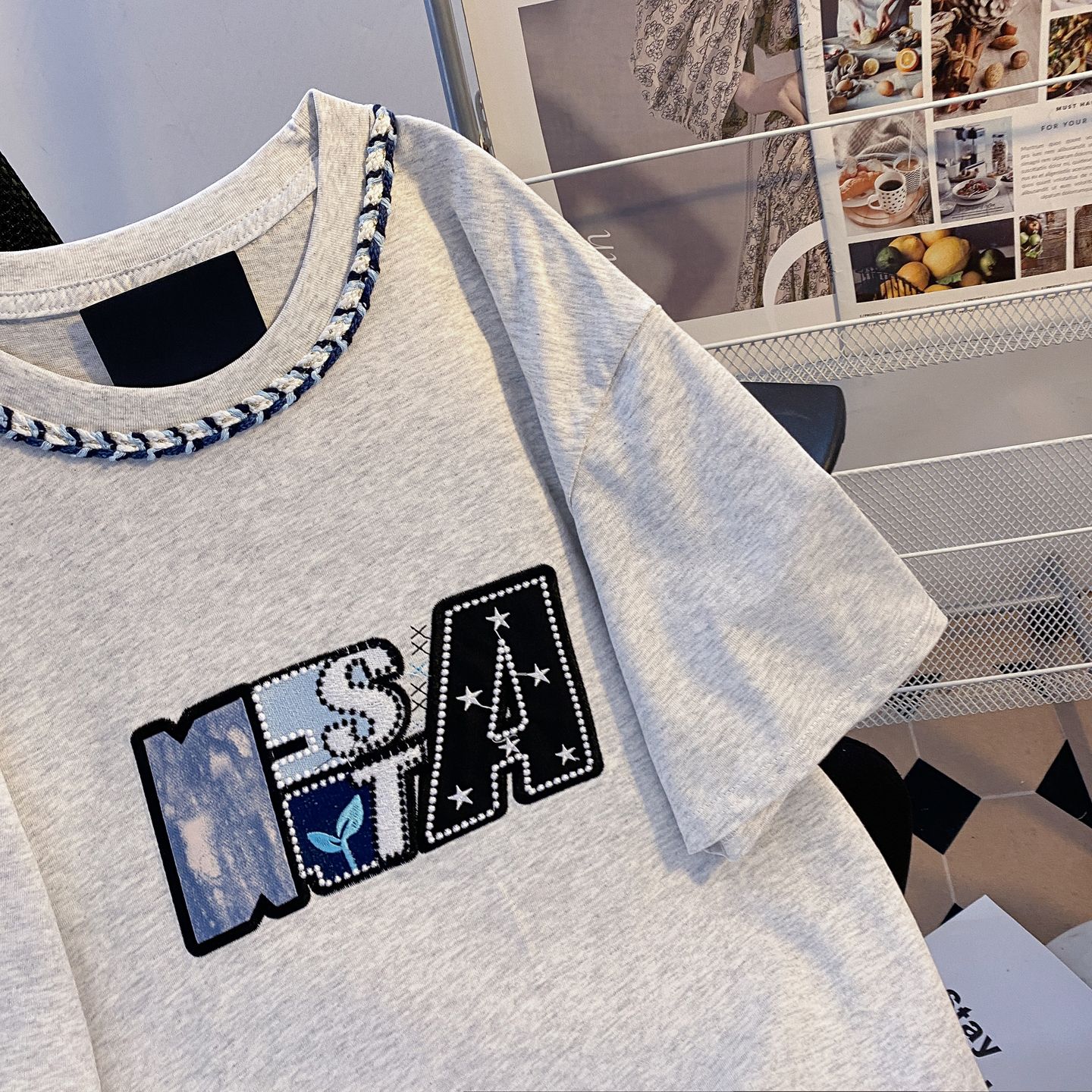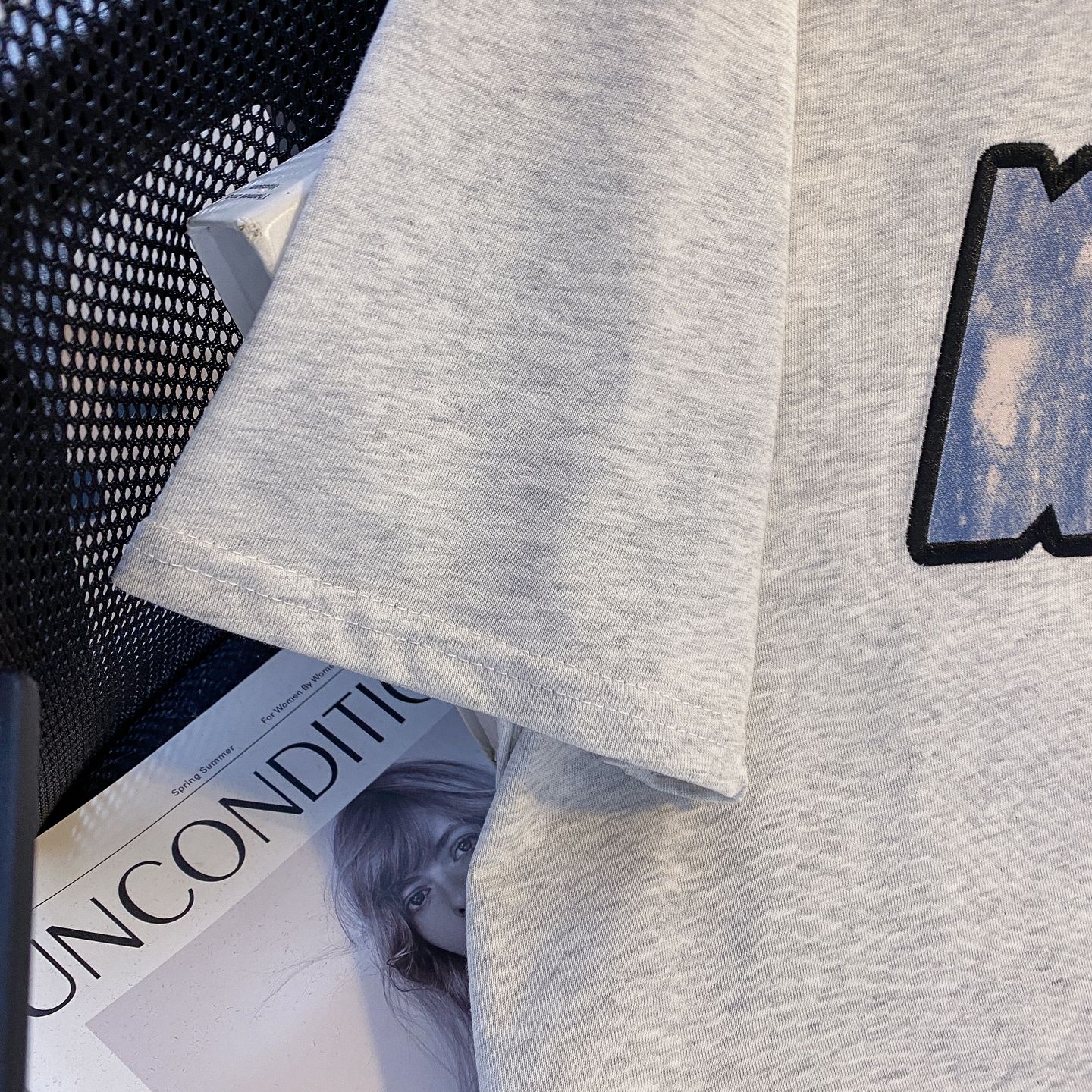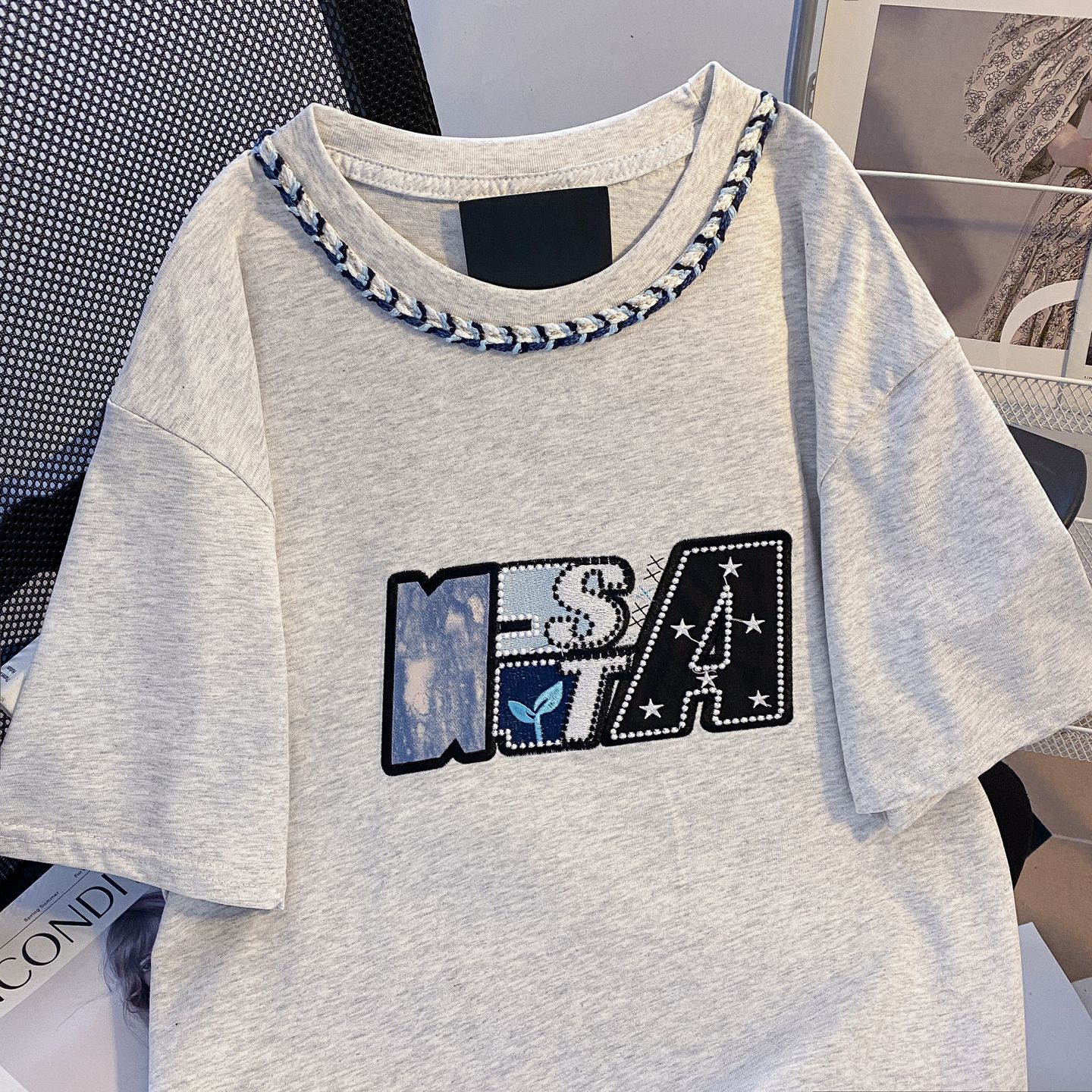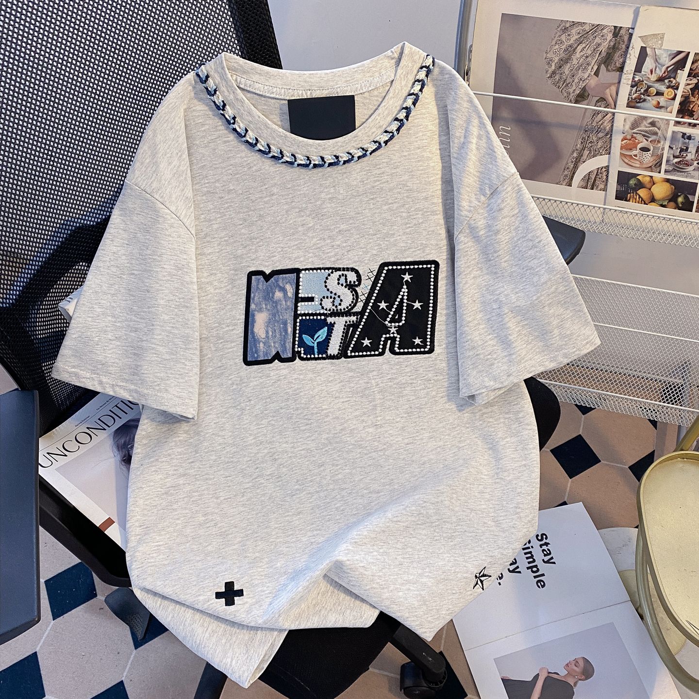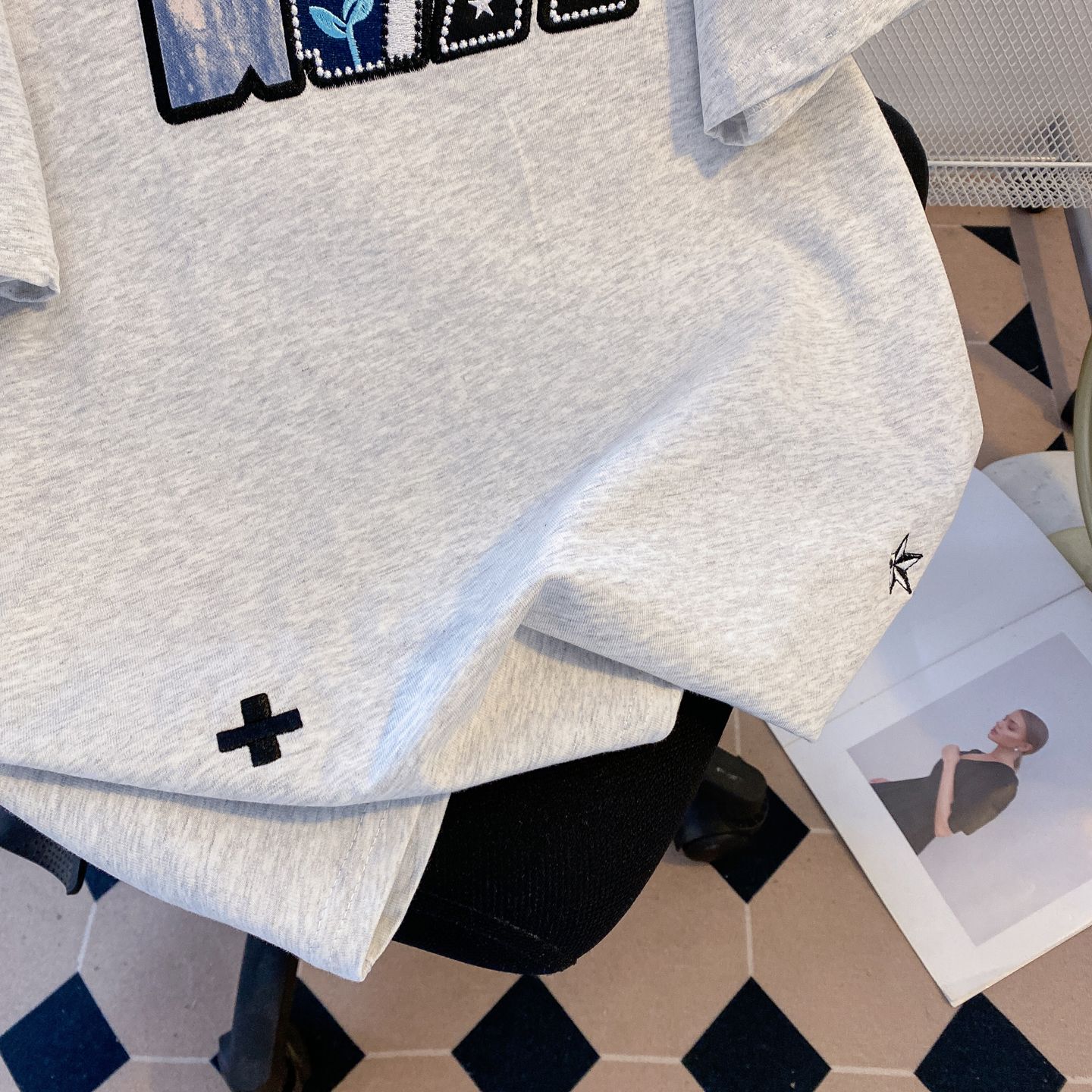 실사 더블 실 240 그램 순면 반팔 티셔츠 여성 여름 새로운 루즈핏 긍정적 인 어깨 알파벳 자수 라운드 넥 맨위