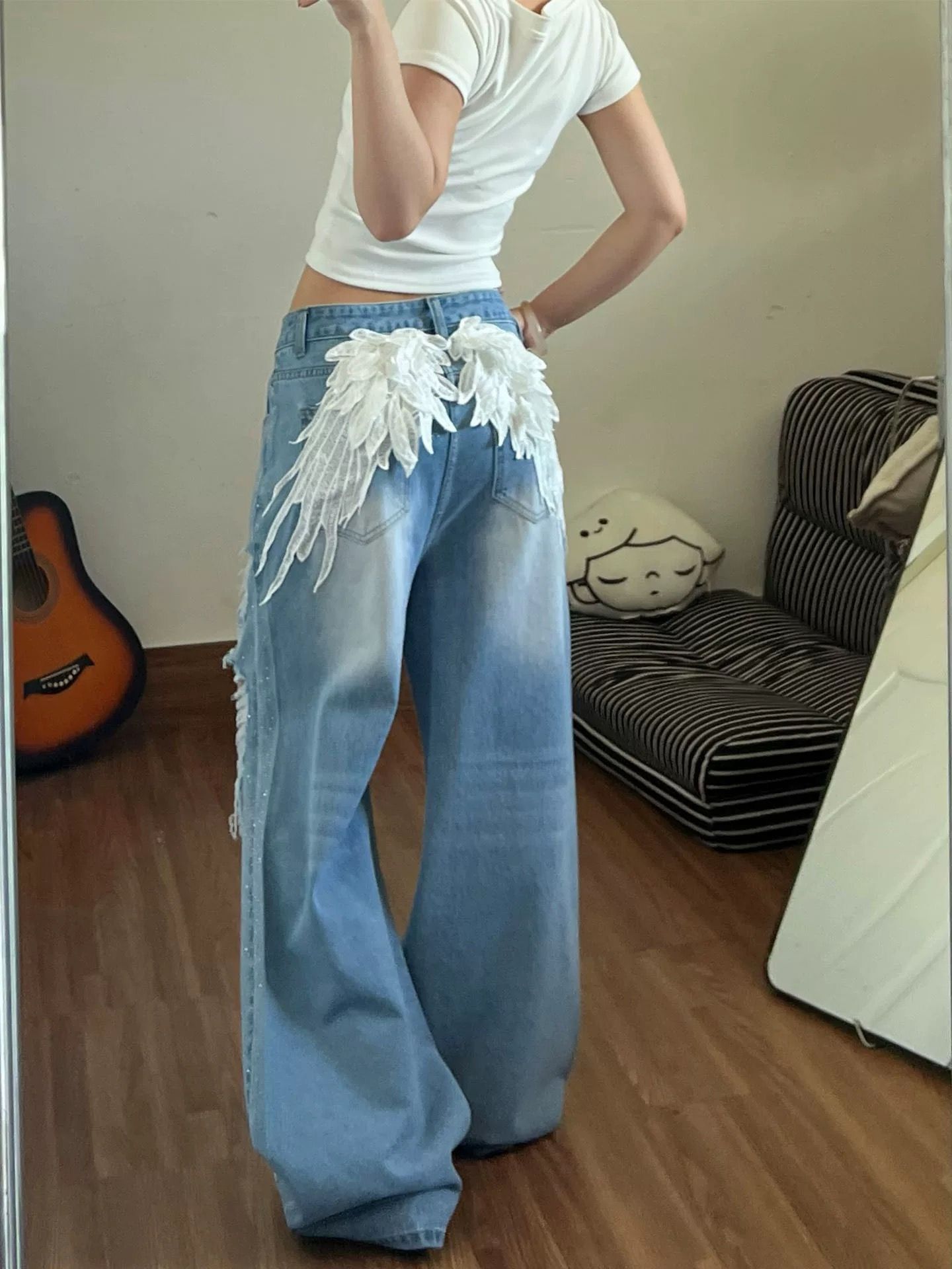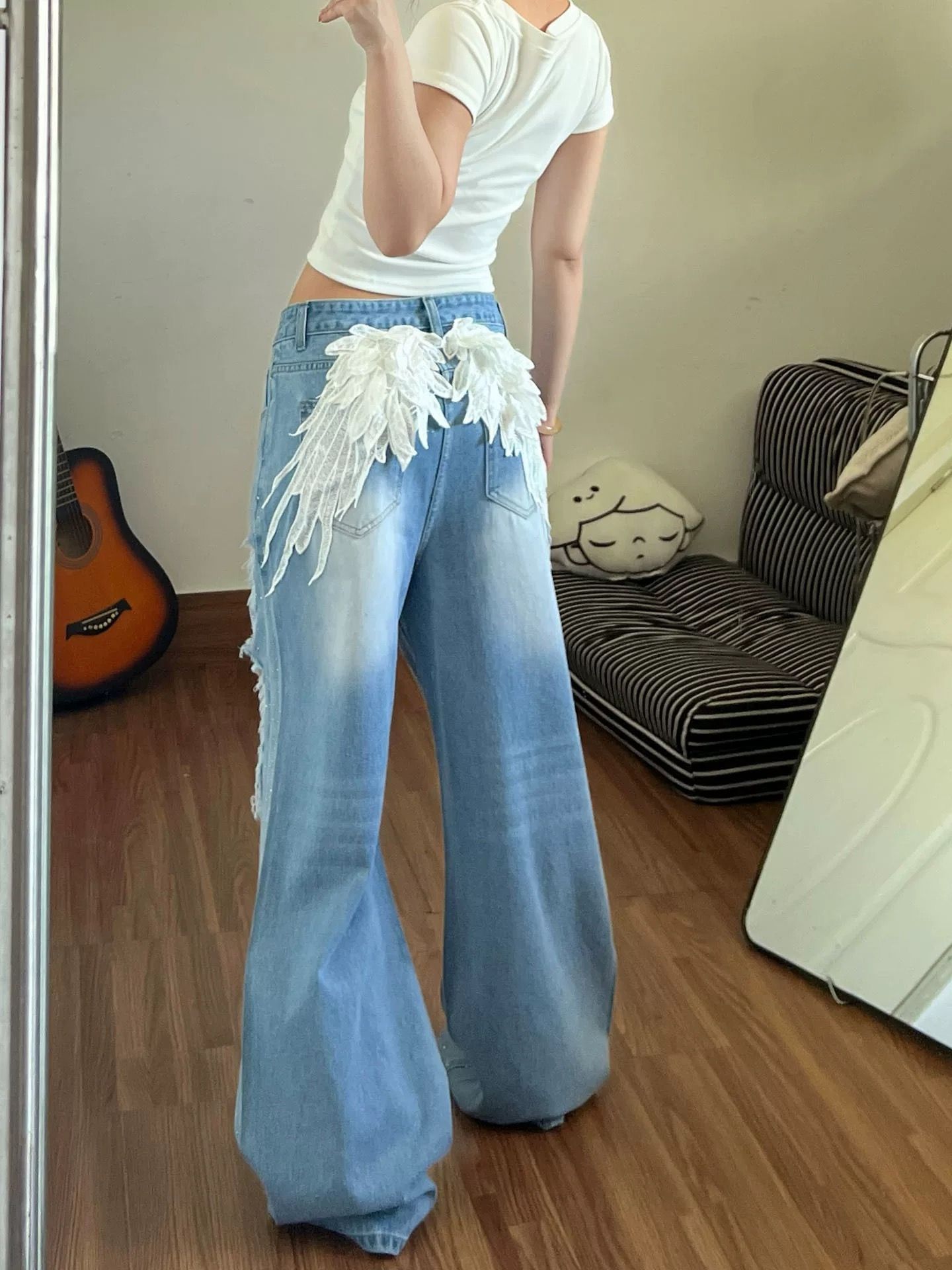 거리 더러운 염색 마 오래된 찢어진 부분 모통이 칼 청바지 바지 여자 2026 여름 새로운 작은 말 프린트 와이드 레그 팬츠