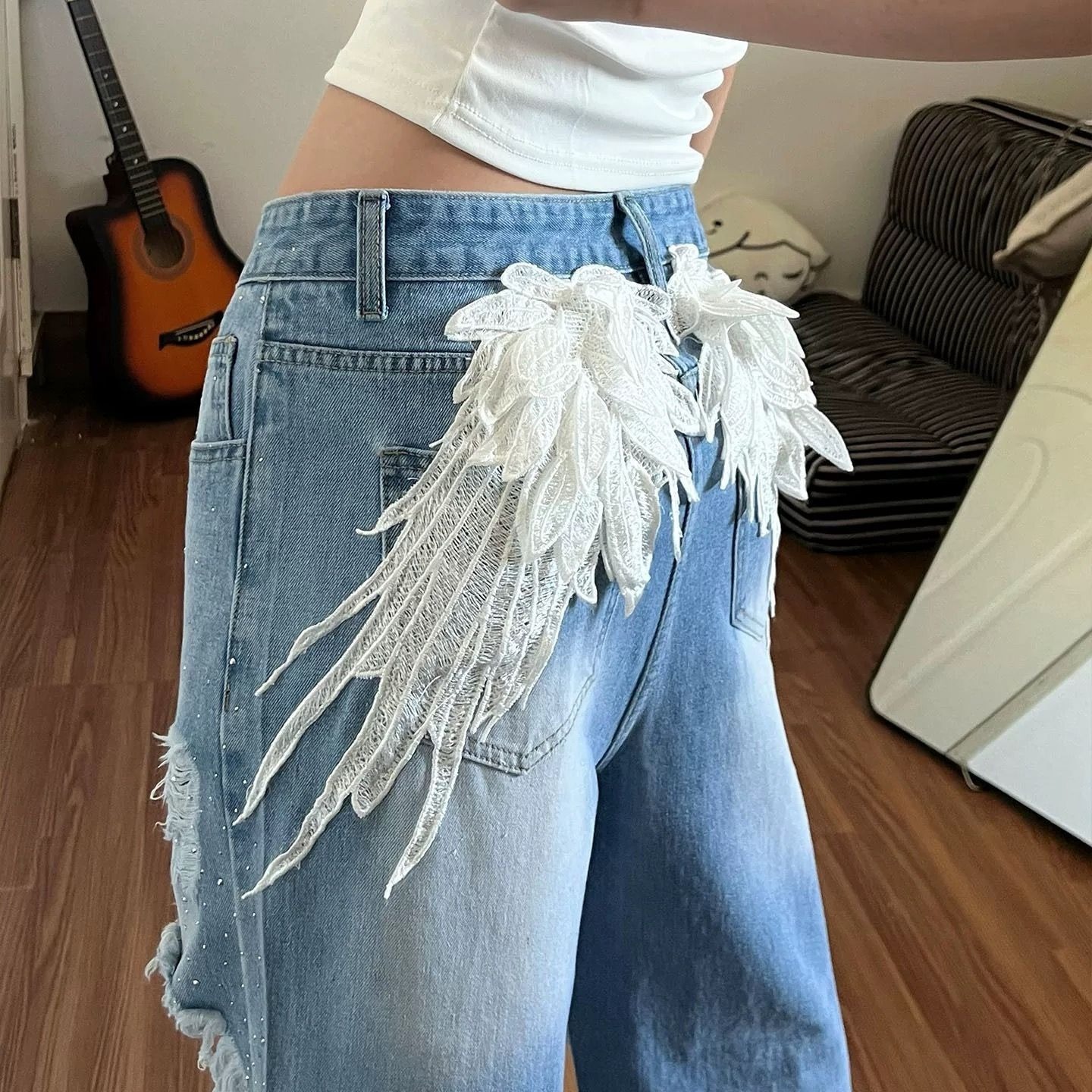 아메리칸 레트로 날개 자수 허리 머리 수 있습니다. 조정 청바지 아이들 여름 새로운 핫걸 핫픽스 찢어진 부분 바닥 청소 바지