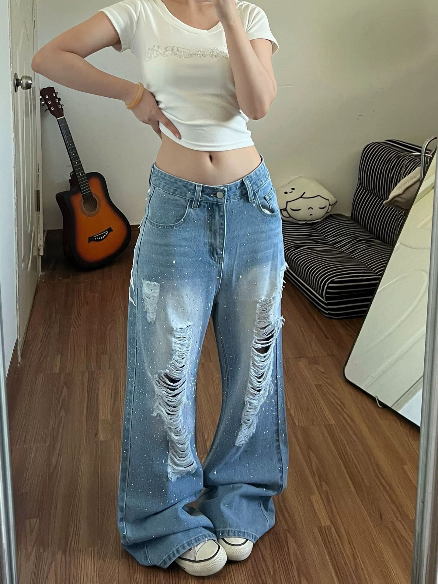 아메리칸 루즈핏 느긋한 느슨함 센스 청바지 아이들 여름 새로운 핫걸 마 오래된 워싱 찢어진 부분 바닥 청소 긴 바지