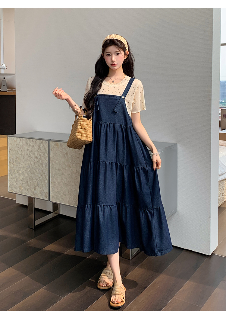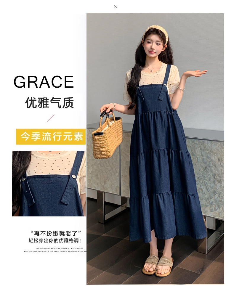 실사 지금 2026 여름 새로운 품격 도트 무늬 반팔 레트로 데님 멜빵 치마 세트