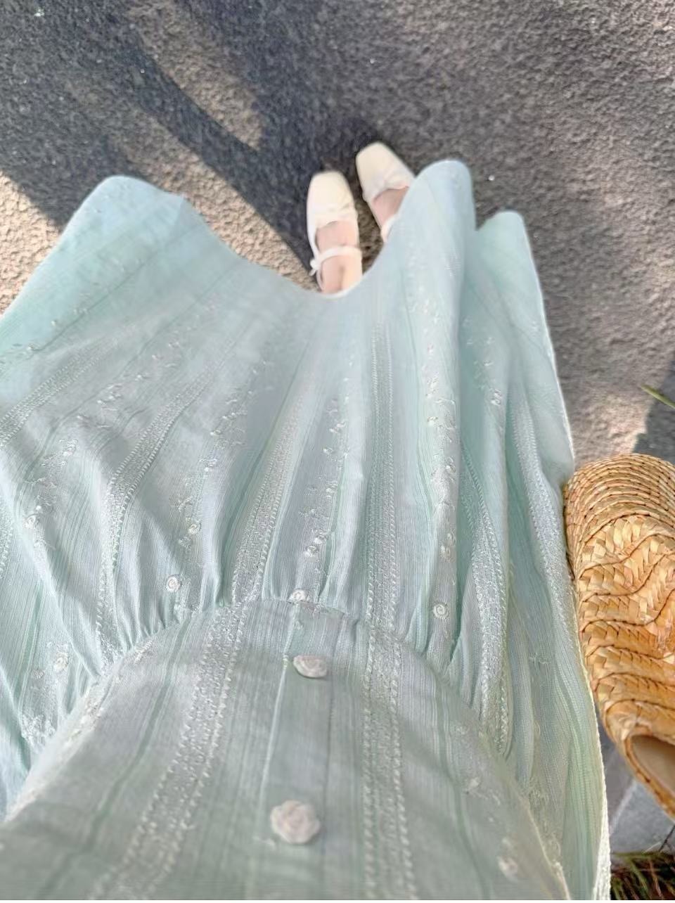 callmeear 화이트 티 첫사랑 레이스 조각 허리 수축 드레스 자카드 프릴 맨위 여름