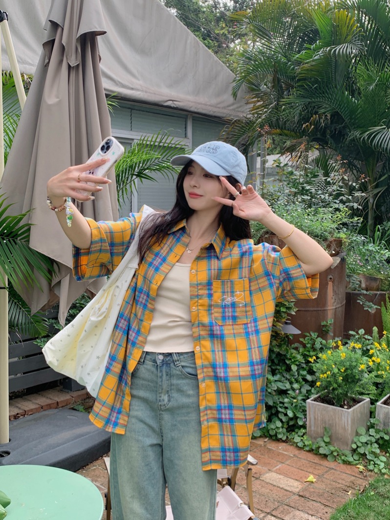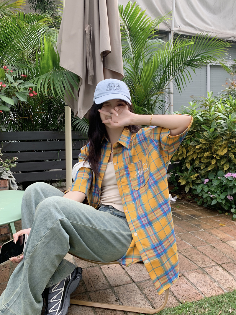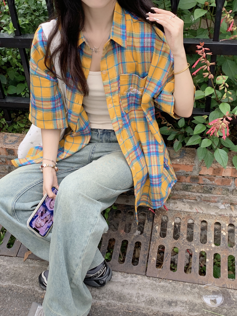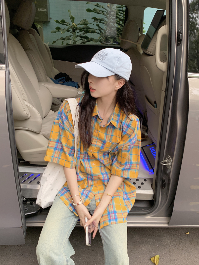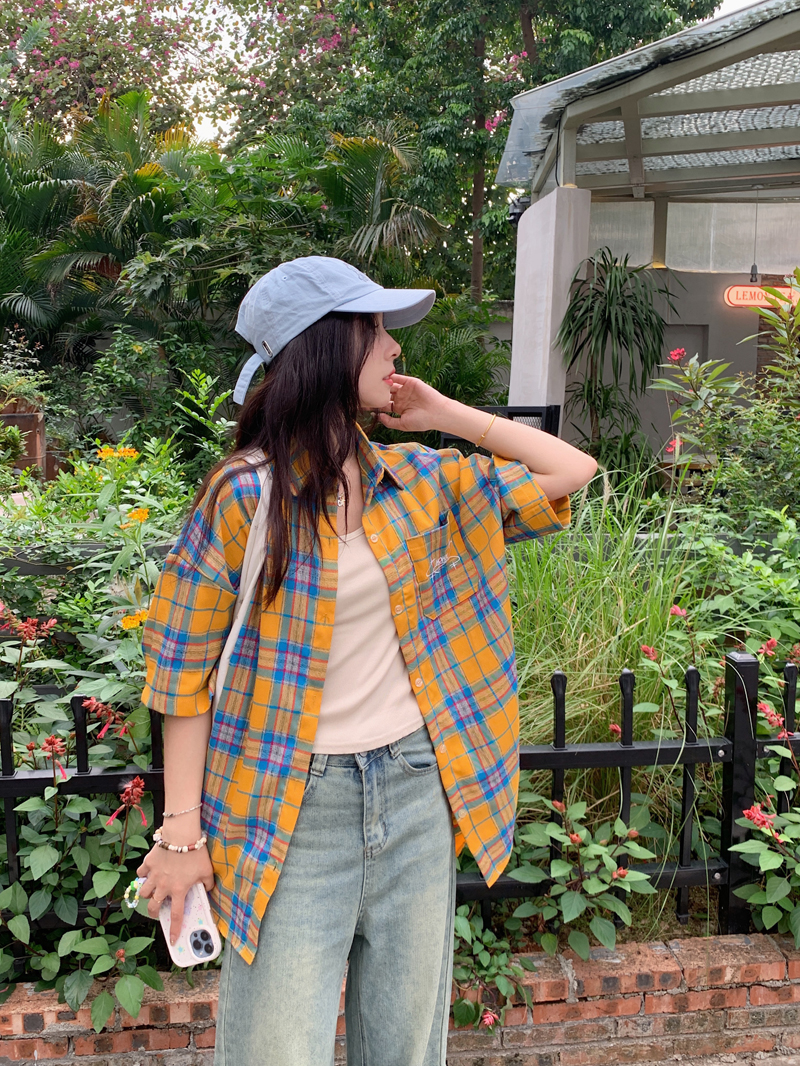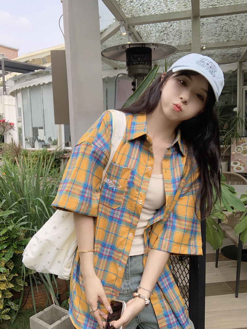 실사 정가 레트로 높음 거리 밝은 황색 체크무늬 반팔 여성 셔츠 2026 여름 체크무늬 POLO 칼라 맨위