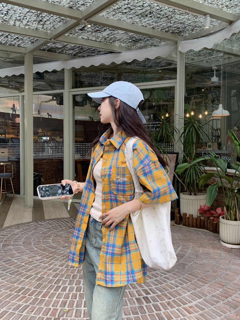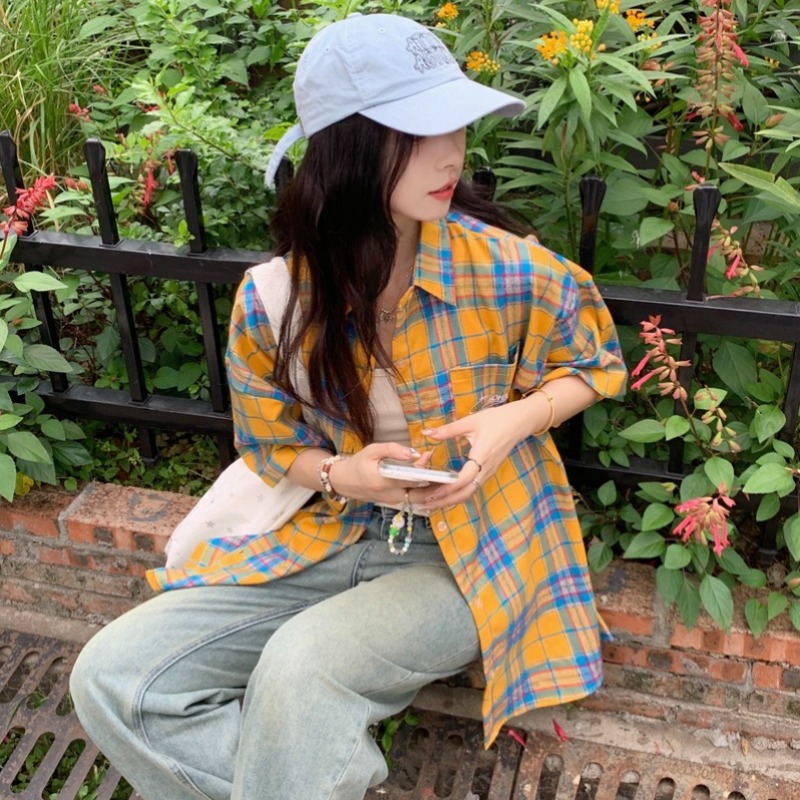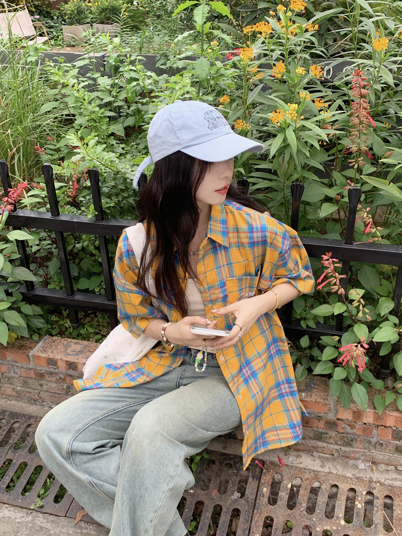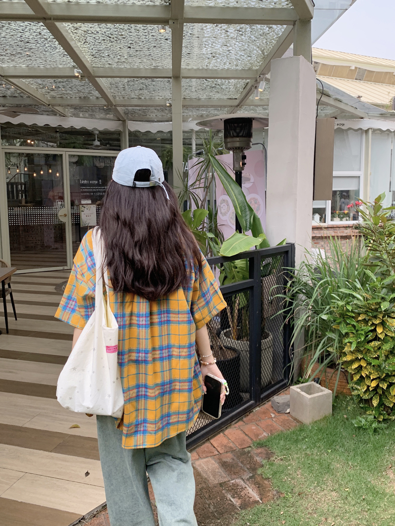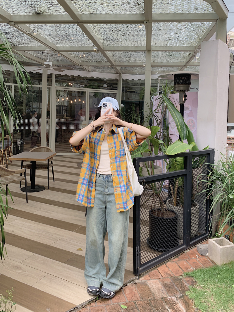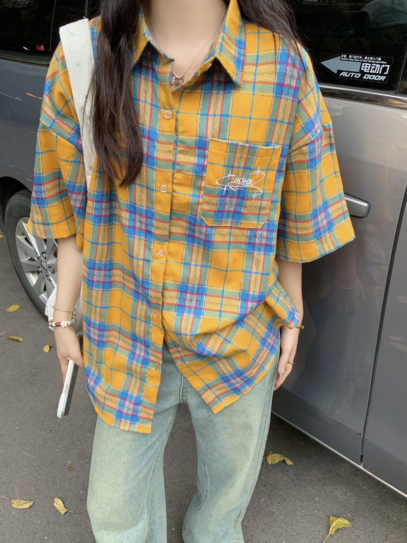 실사 정가 레트로 높음 거리 밝은 황색 체크무늬 반팔 여성 셔츠 2026 여름 체크무늬 POLO 칼라 맨위