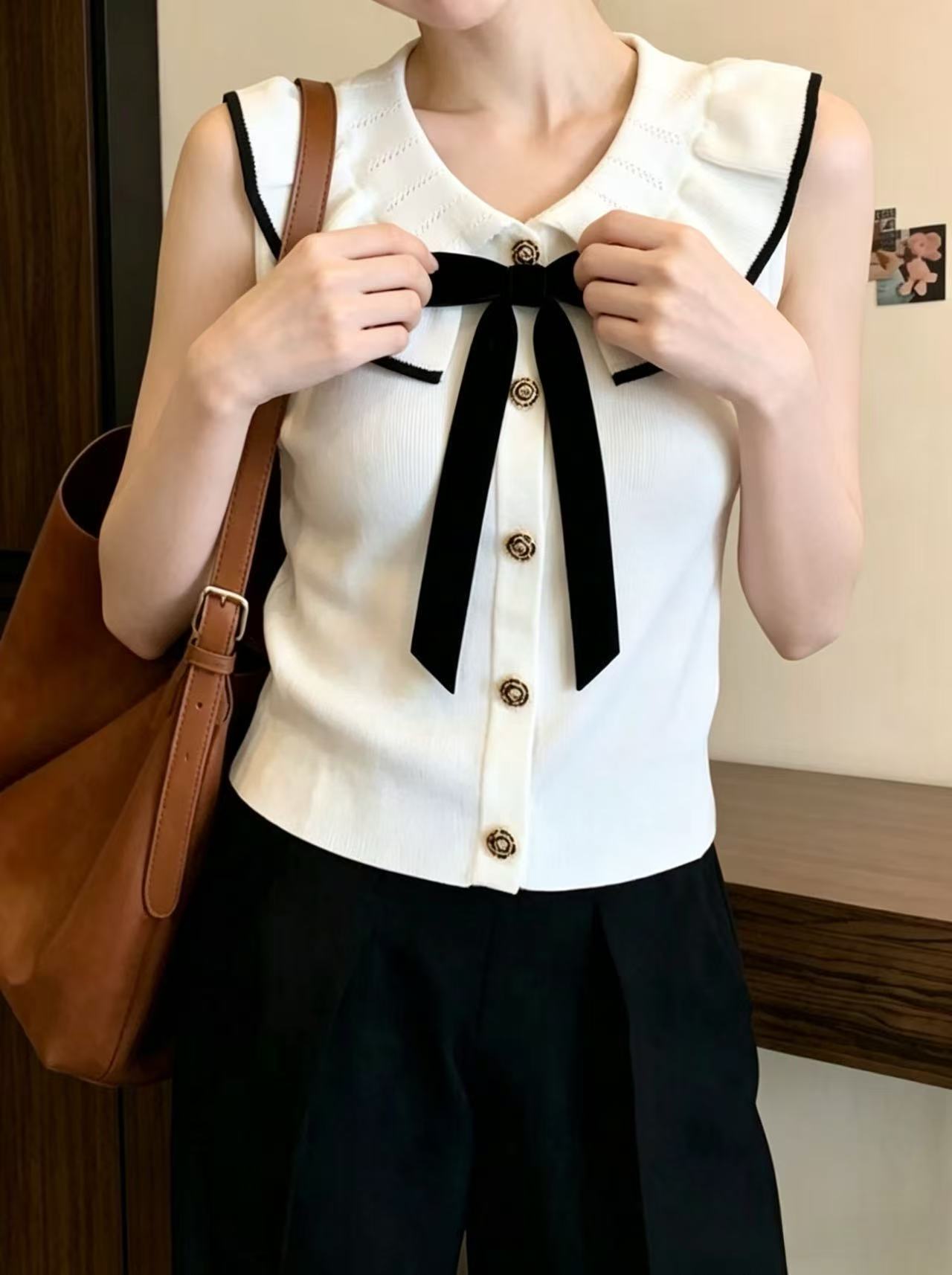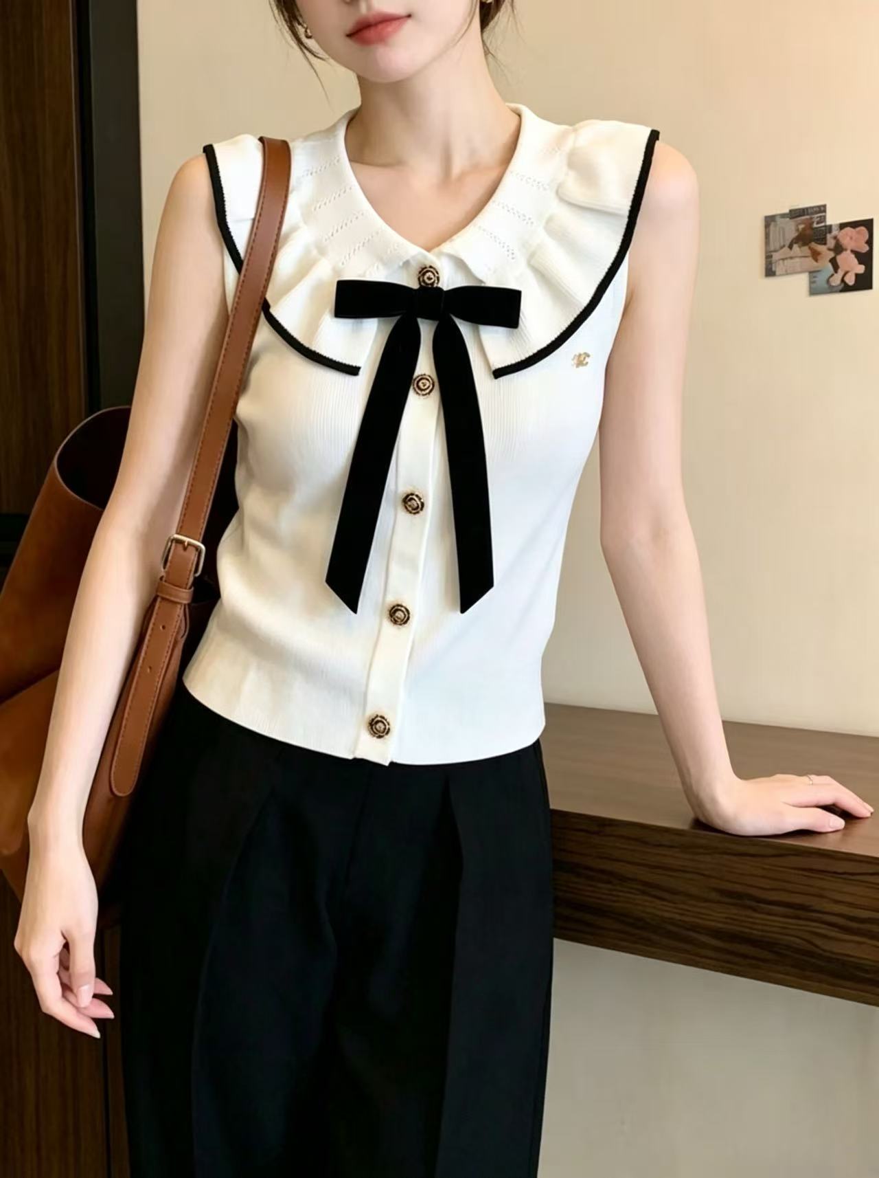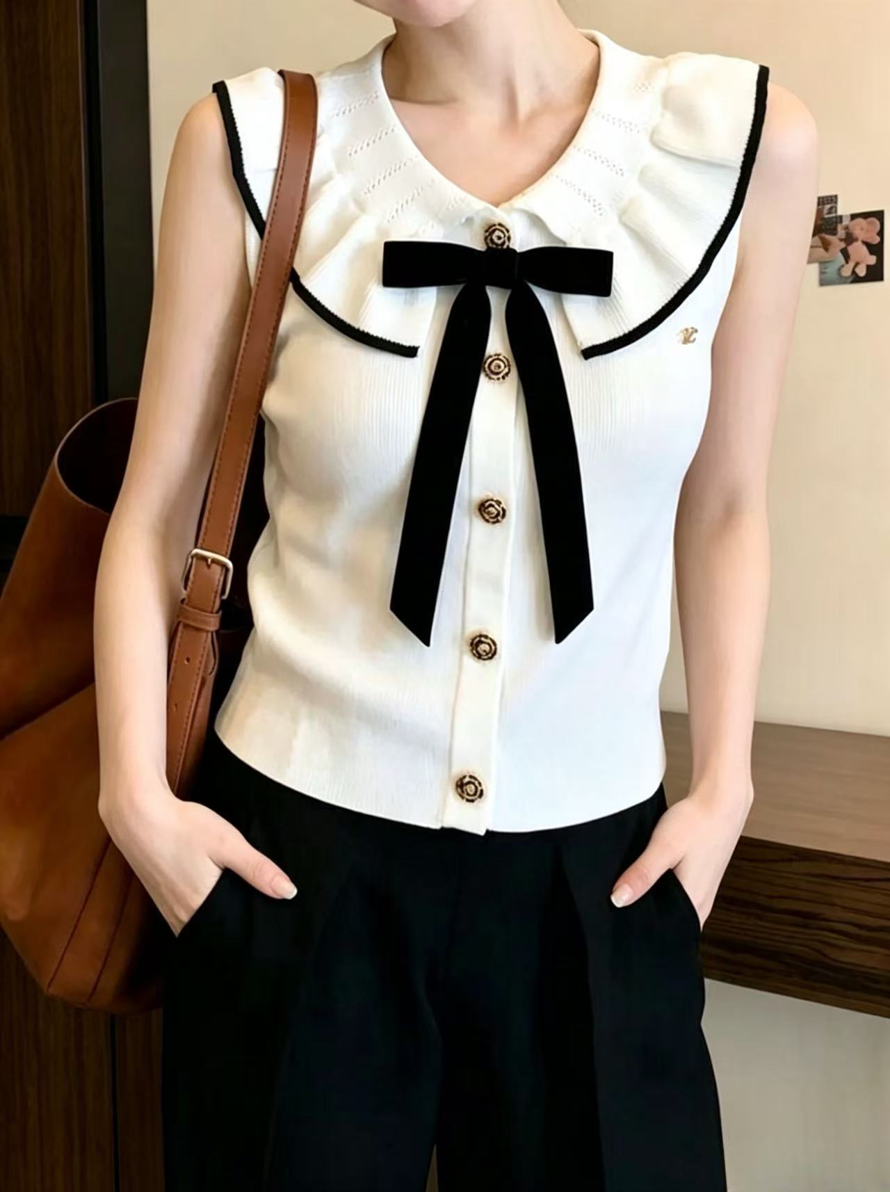 프랑스식 화이트 3 차원 나비 매듭 프릴 니트 스웨터 조끼 여성 여름 새로운 다용도 외국 가스 연령 감소 맨위