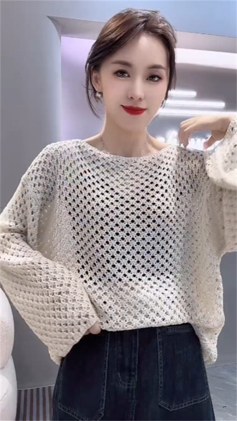 2026 벨트 로프 얇은 스타일 느긋한 바람 도루 센스 에어컨 외부 가져 가라. 블라우스 여성 라운드 넥 불규칙 홀로우 아웃 니트 스웨터