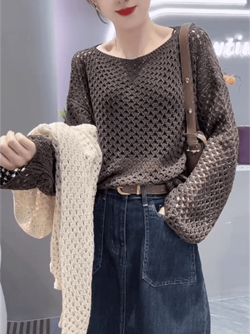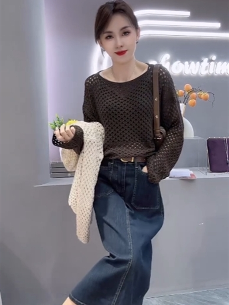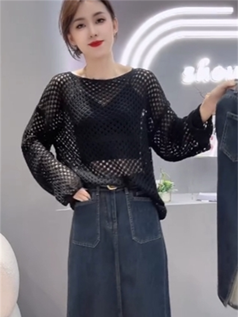 한 부서 다용도 디자인 센스 홀로우 아웃 라운드 넥 긴팔 니트 스웨터 여성 가을 Chic 얇고 가벼운 에어컨 블라우스 맨위 트렌디