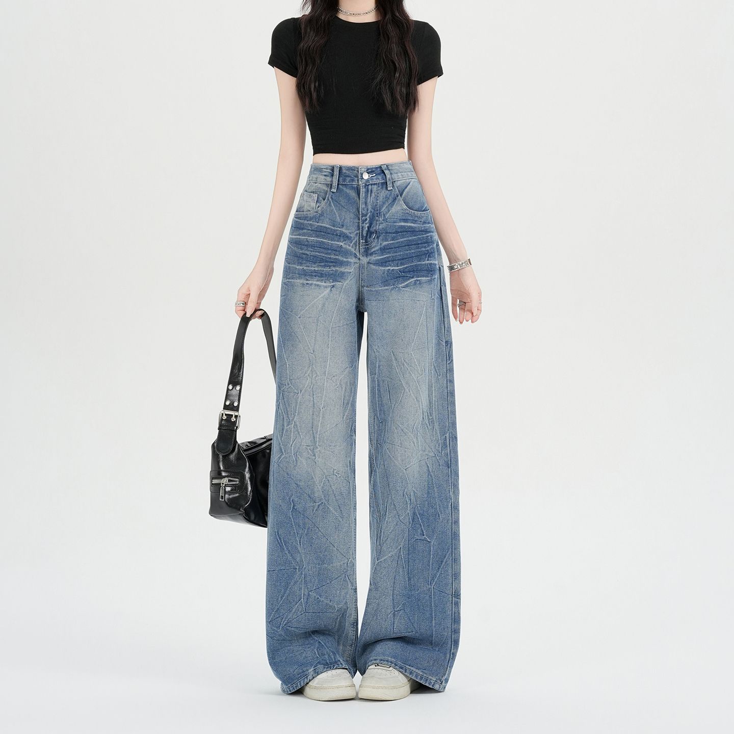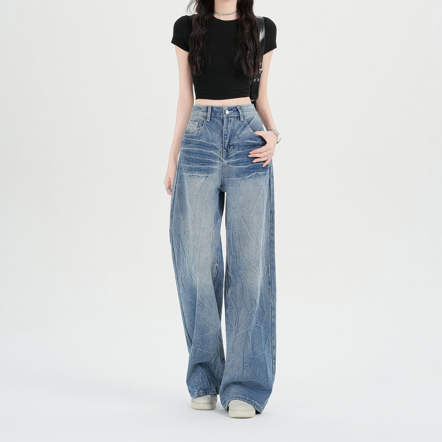 실사 아메리칸 노스탤지어 블루 넓은 다리 청바지 여성 봄 가을 하이웨이스트 슬림해 보이는 스크래치 디자인 센스 스트레이트 바닥 청소 바지