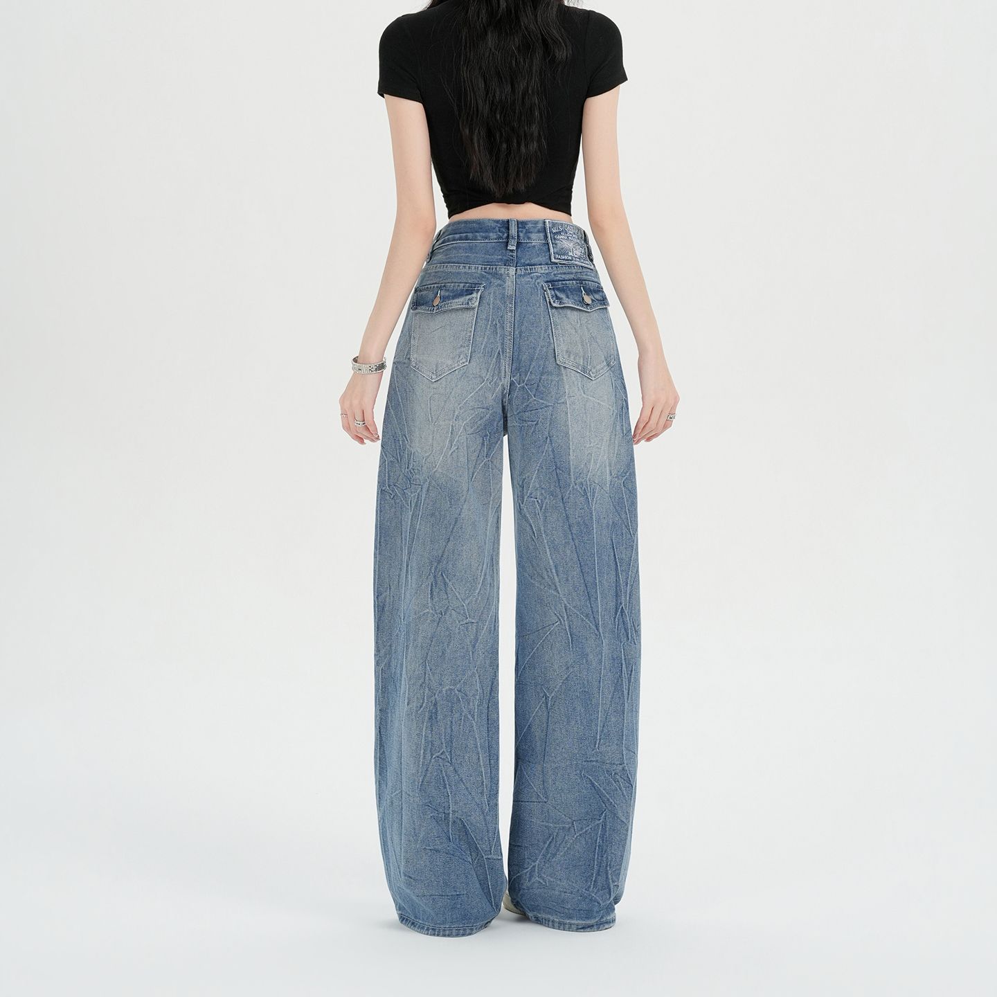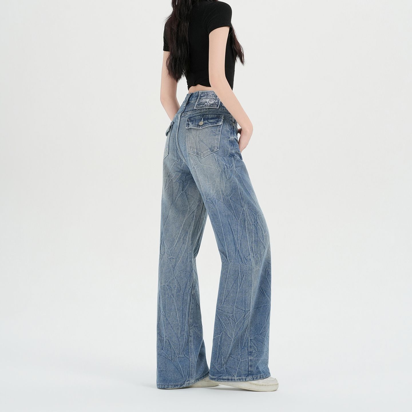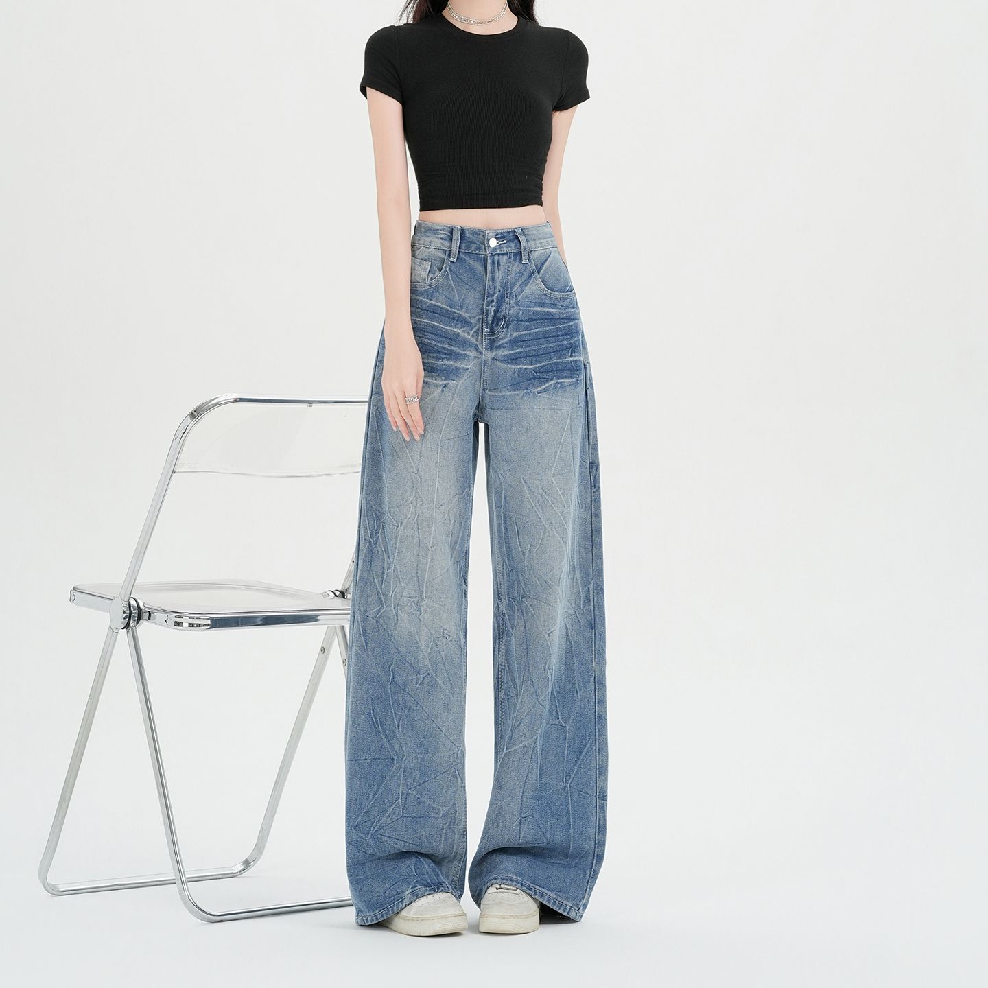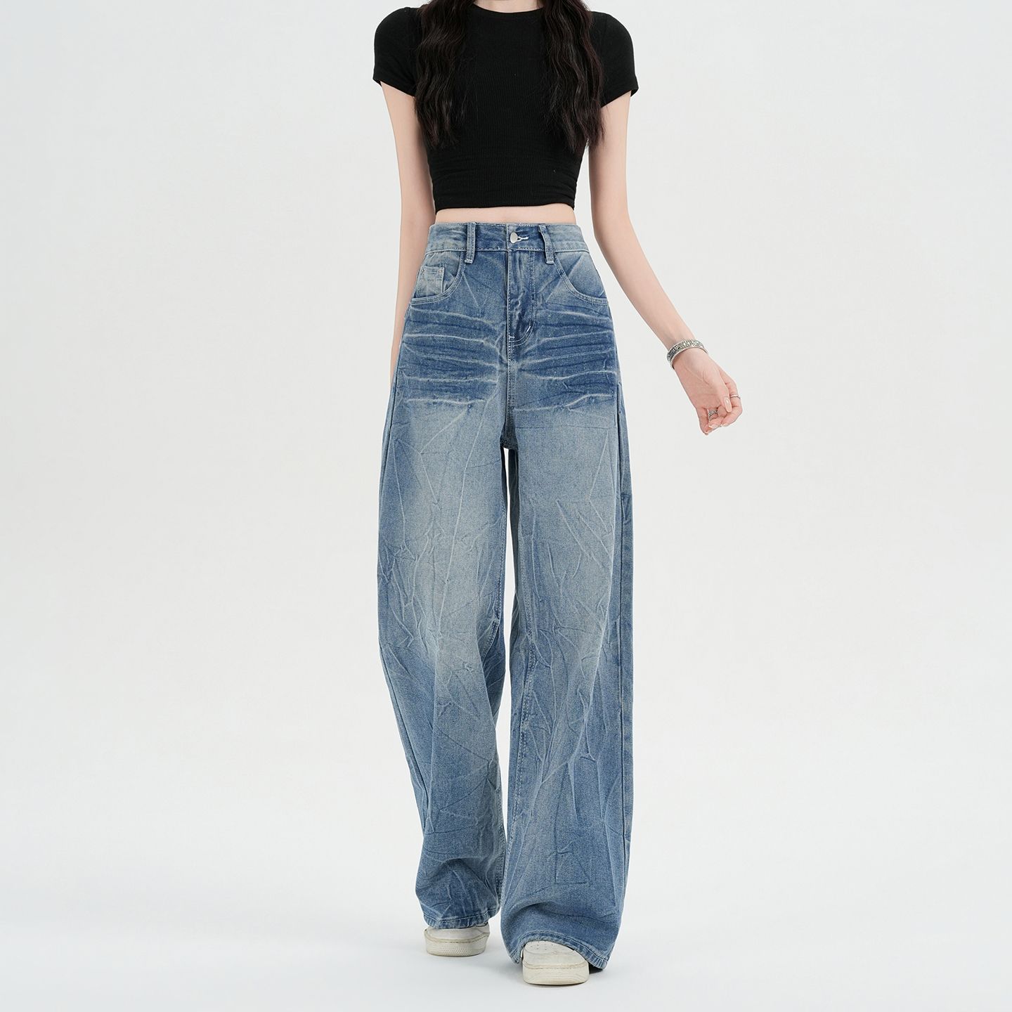 실사 아메리칸 레트로 워싱 고양이 반드시 넓은 다리 청바지 여성 봄 여름 루즈핏 슬림해 보이는 cleanfit 바닥 청소 바지