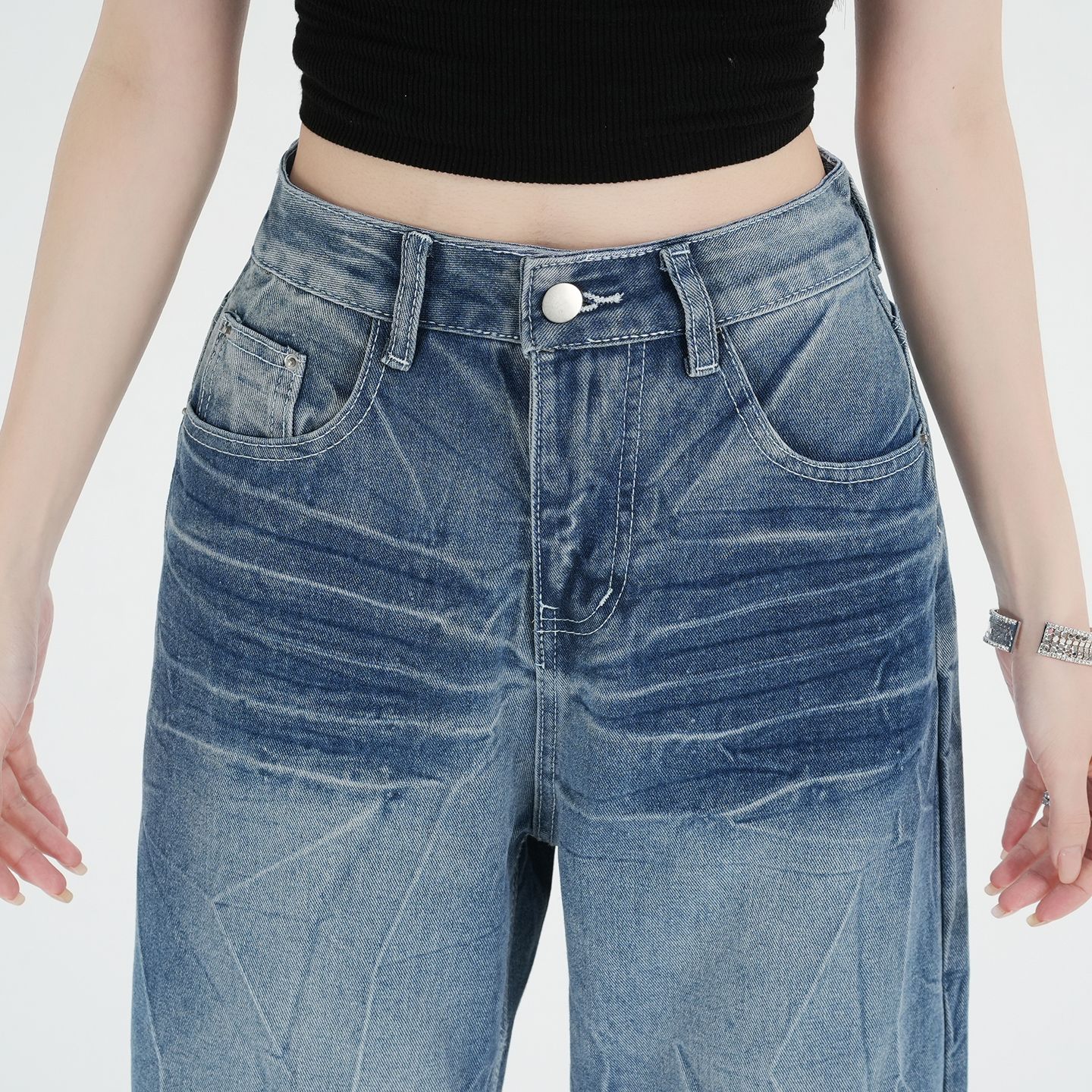 실사 정가 칙칙한 흰색 아메리칸 레트로 모통이 칼 청바지 여성 여름 새로운 하이웨이스트 루즈핏 와이드 레그 팬츠 어린이