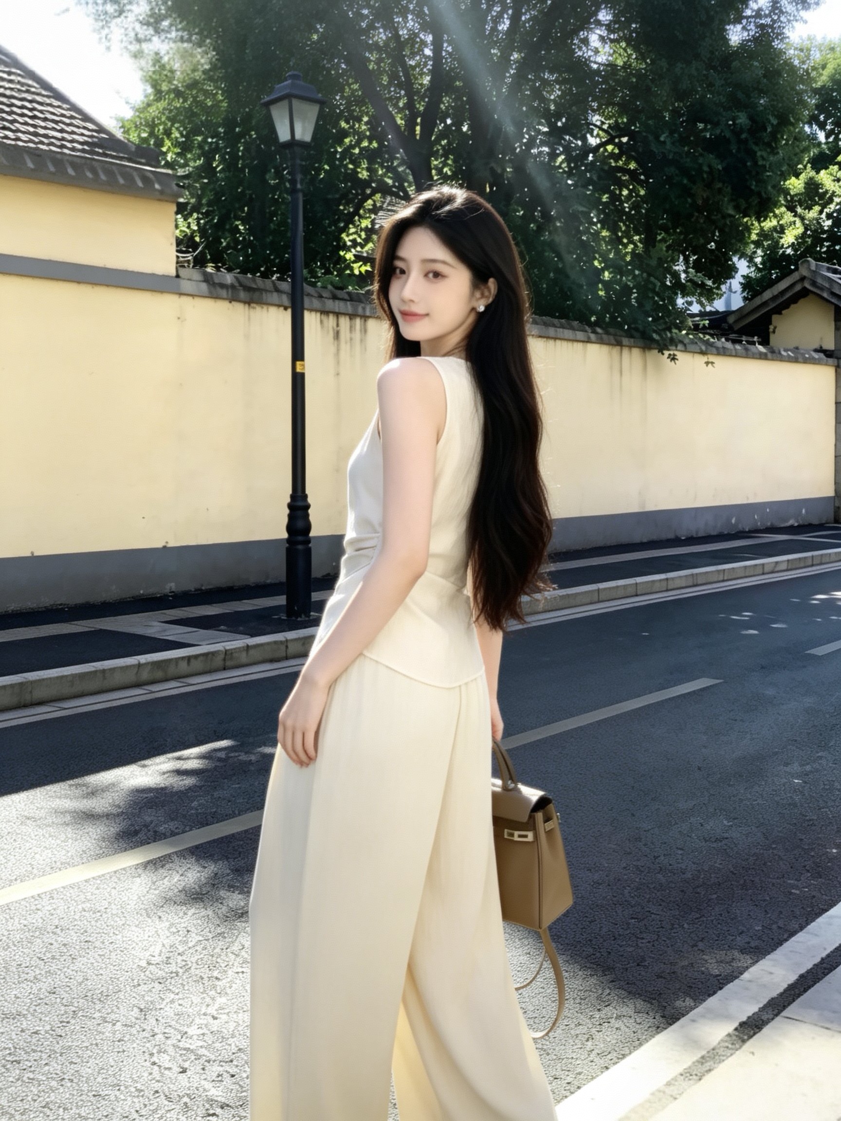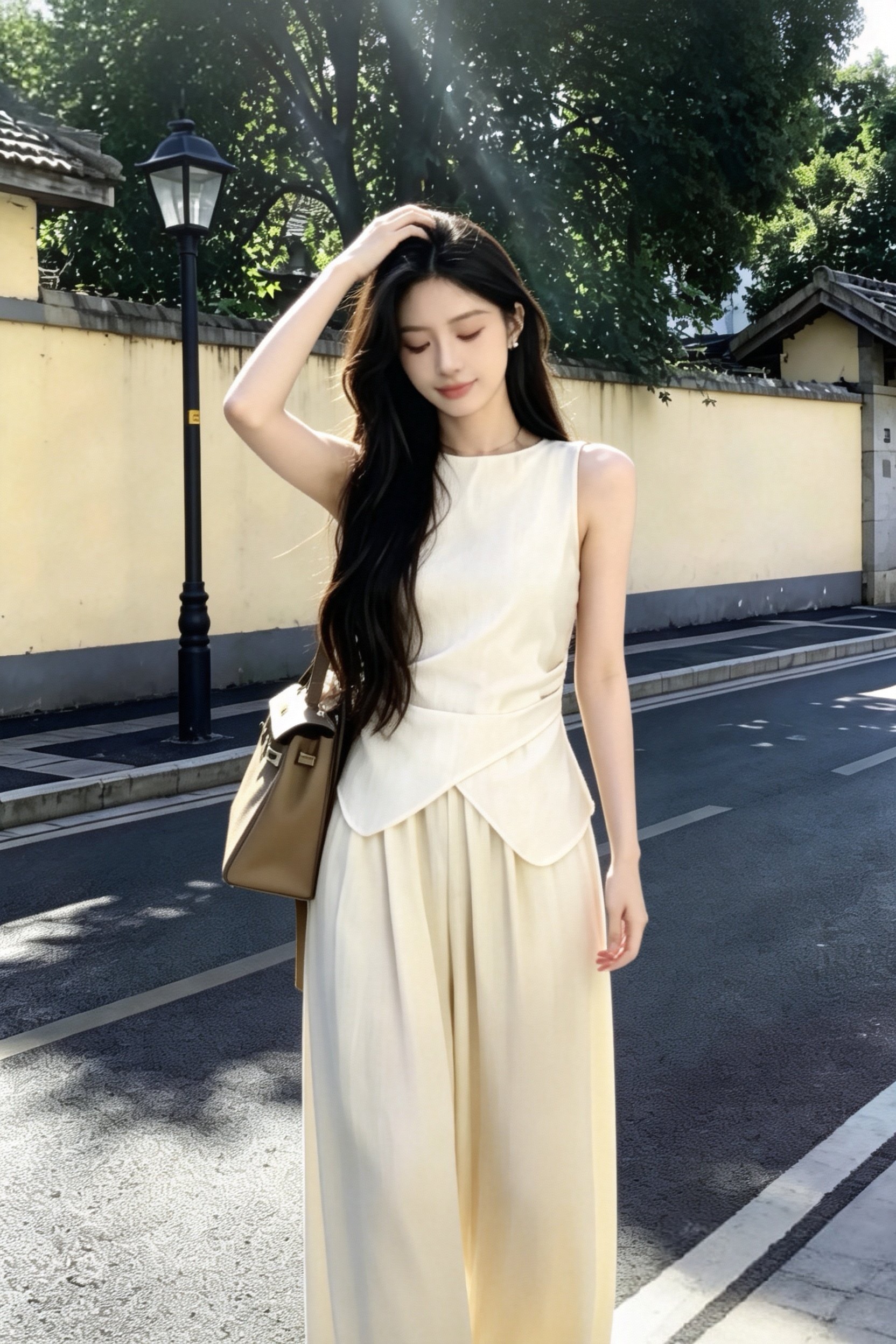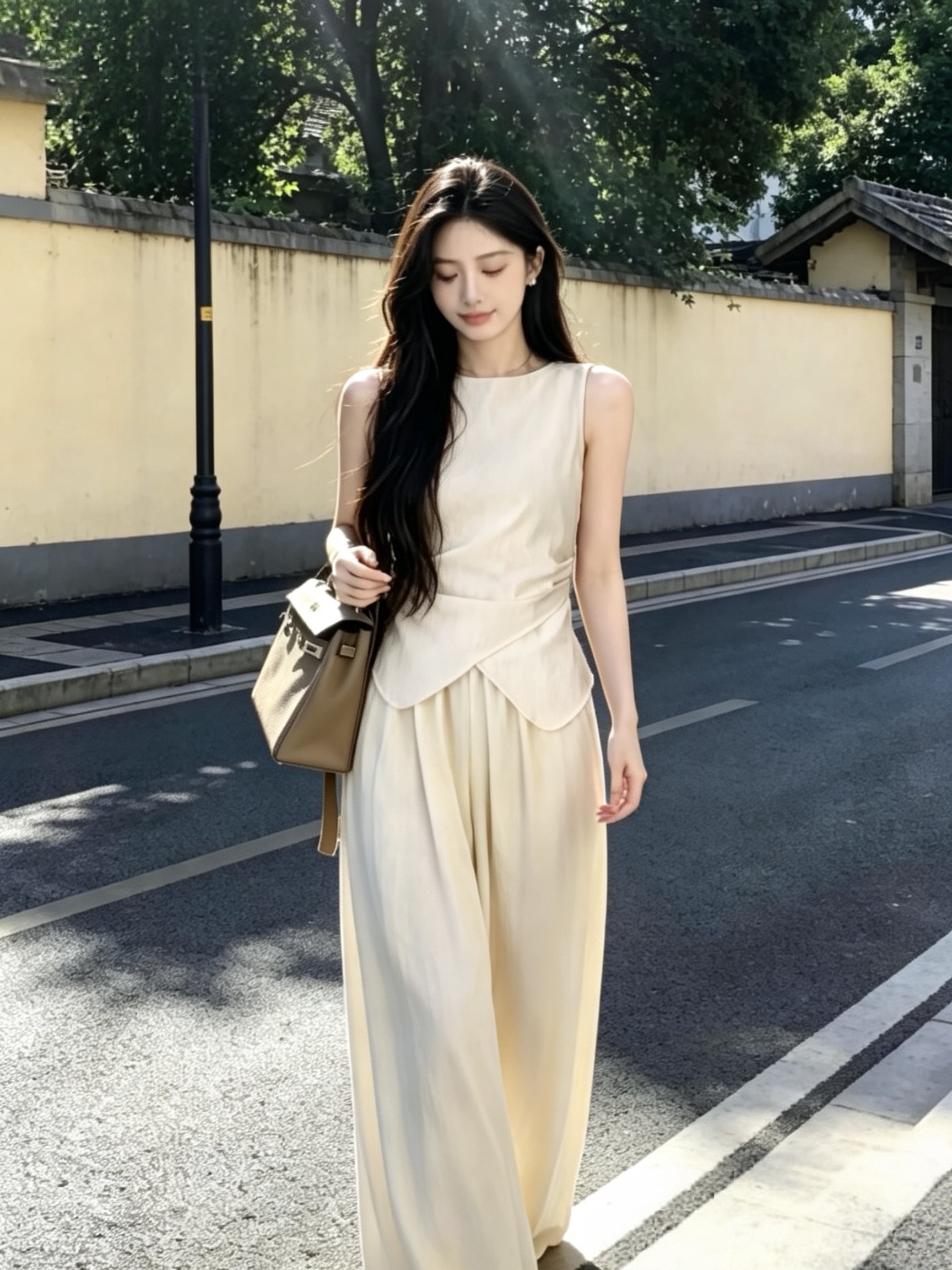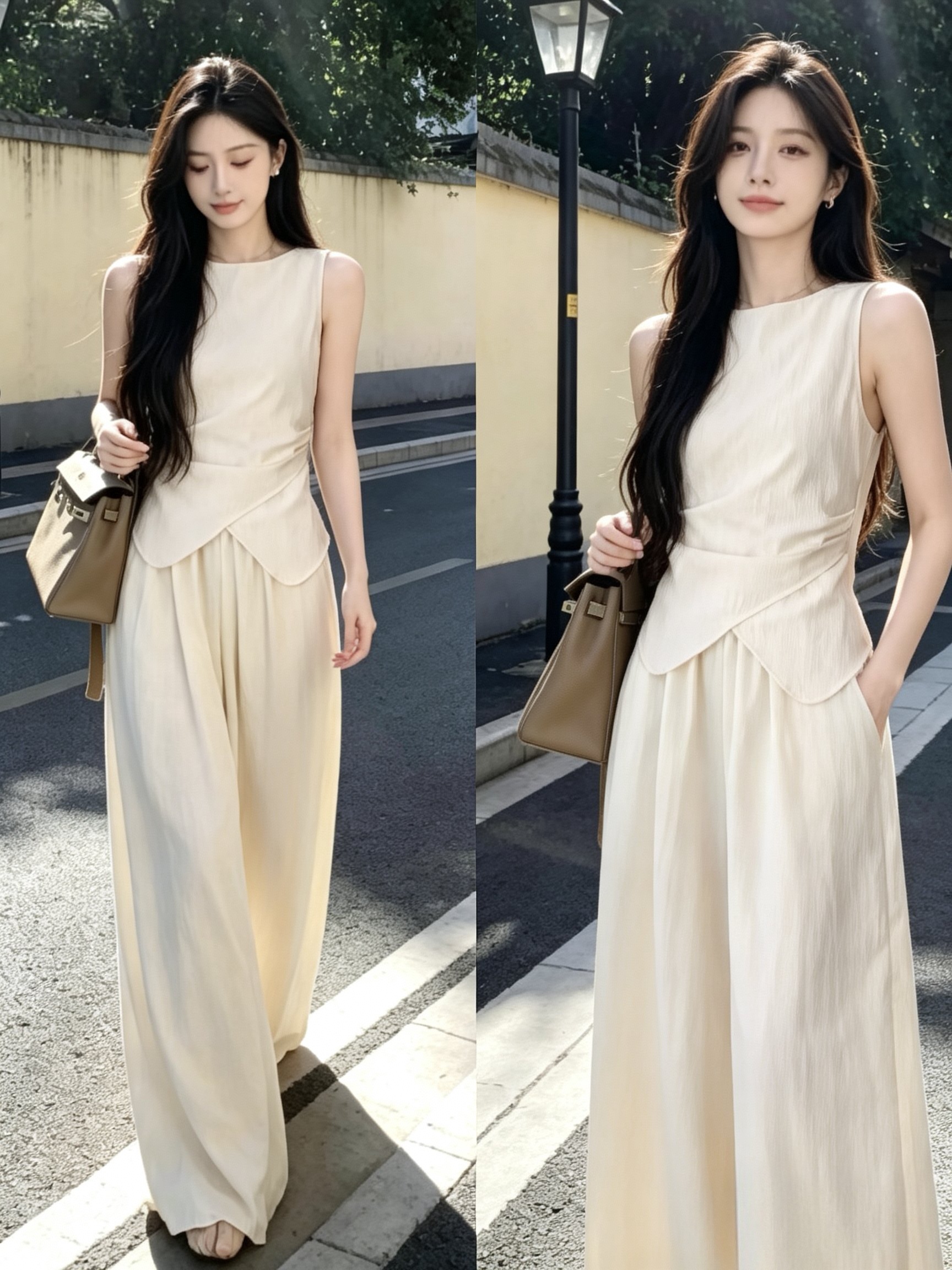 프랑스식 느긋한 오래된 돈 바람 품격 착용 가져 가라. 전체 집합 여름 디자인 센스 리본 조끼 와이드 레그 팬츠 투피스 슈트