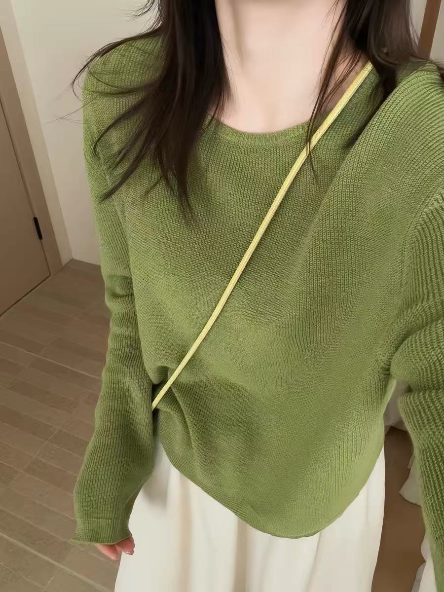 2026 벨트 로프 얇은 스타일 느긋한 바람 도루 센스 에어컨 외부 가져 가라. 블라우스 여성 라운드 넥 불규칙 홀로우 아웃 니트 스웨터