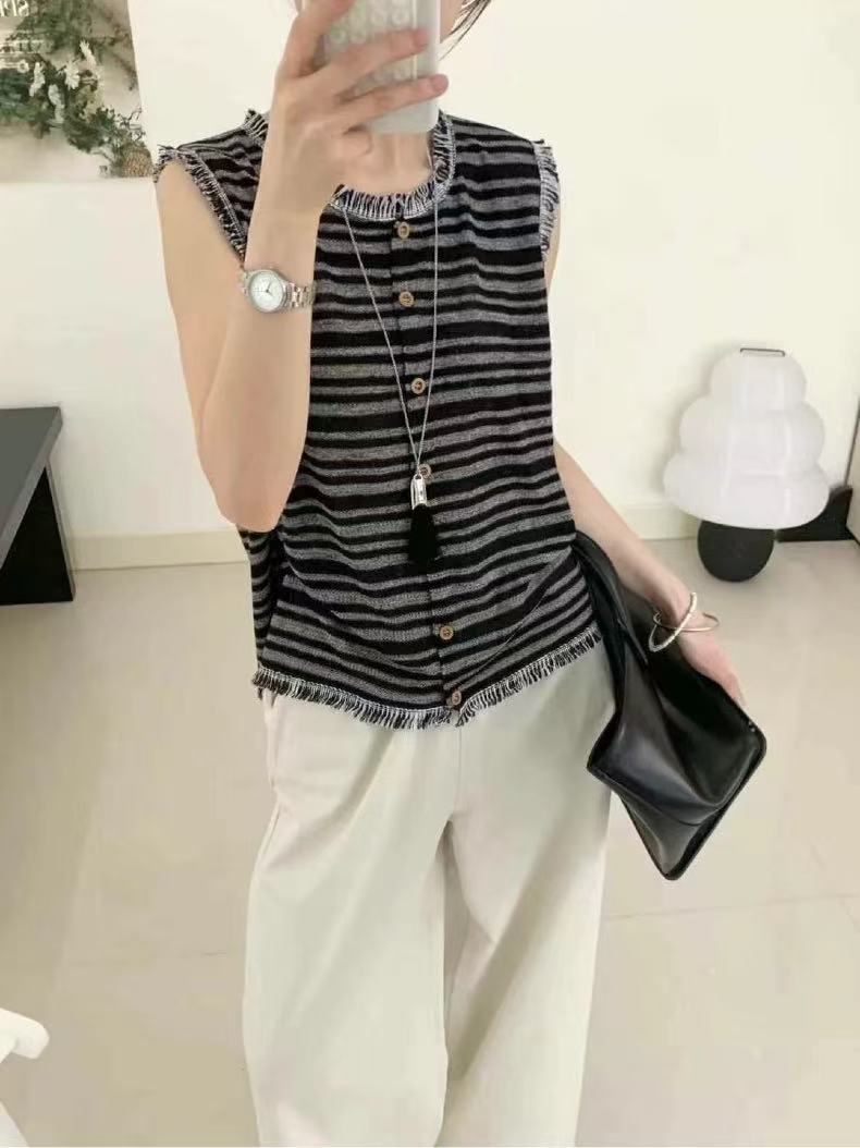 작은 샤넬 스타일 스트라이프 술 거친 가장자리 캐미솔 배색 라운드 넥 주간 실크 라이 경기 서울 민소매 인사이드 가져 가라. 여름 외출용