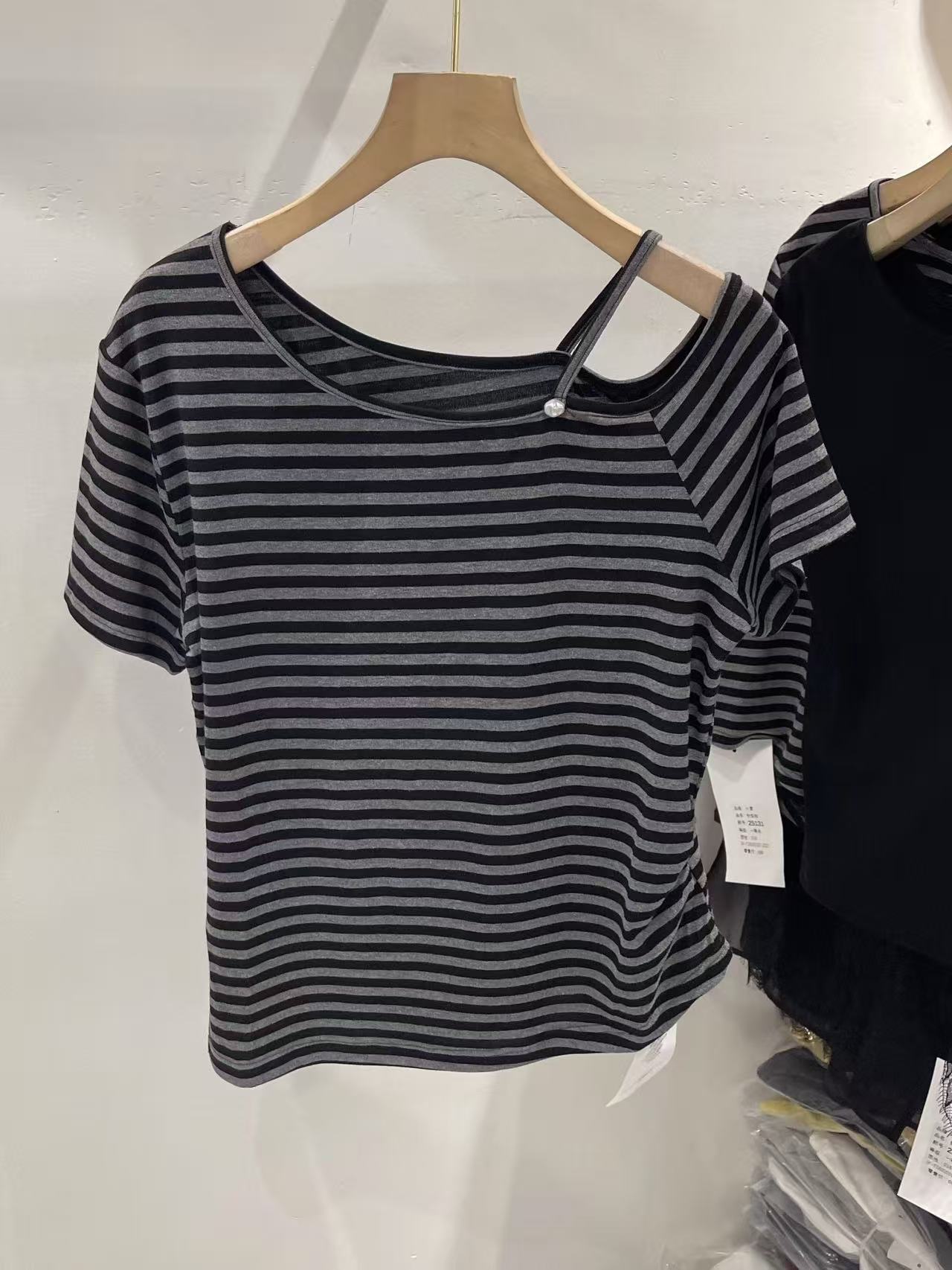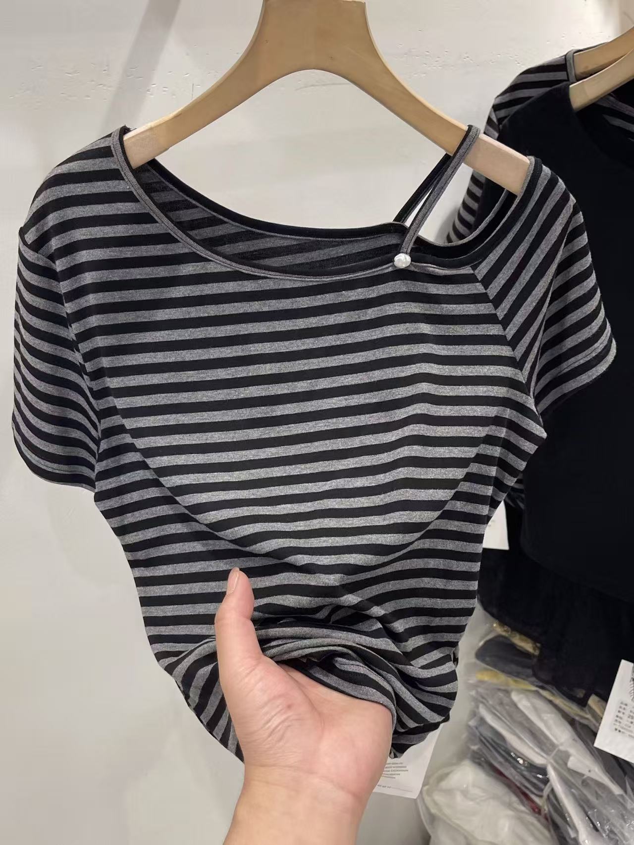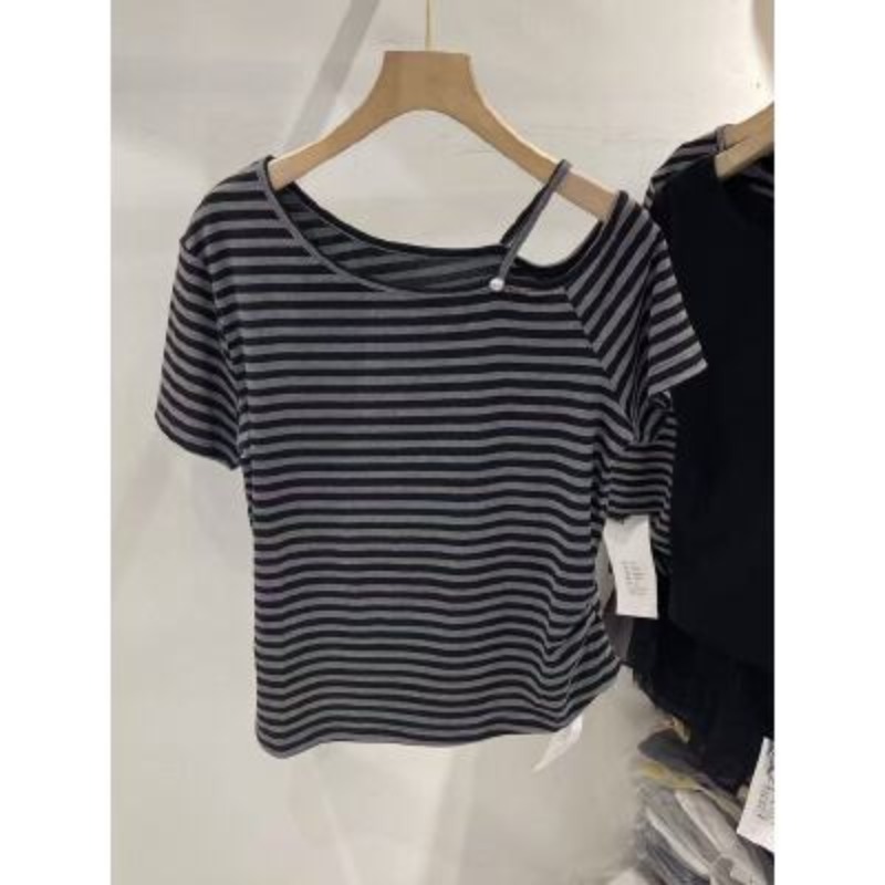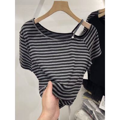 검정색 비스듬한 칼라 오프숄더 반팔 티셔츠 여성 2025 년 여름 새로운 디자인 센스 슬림해 보이는 맨위