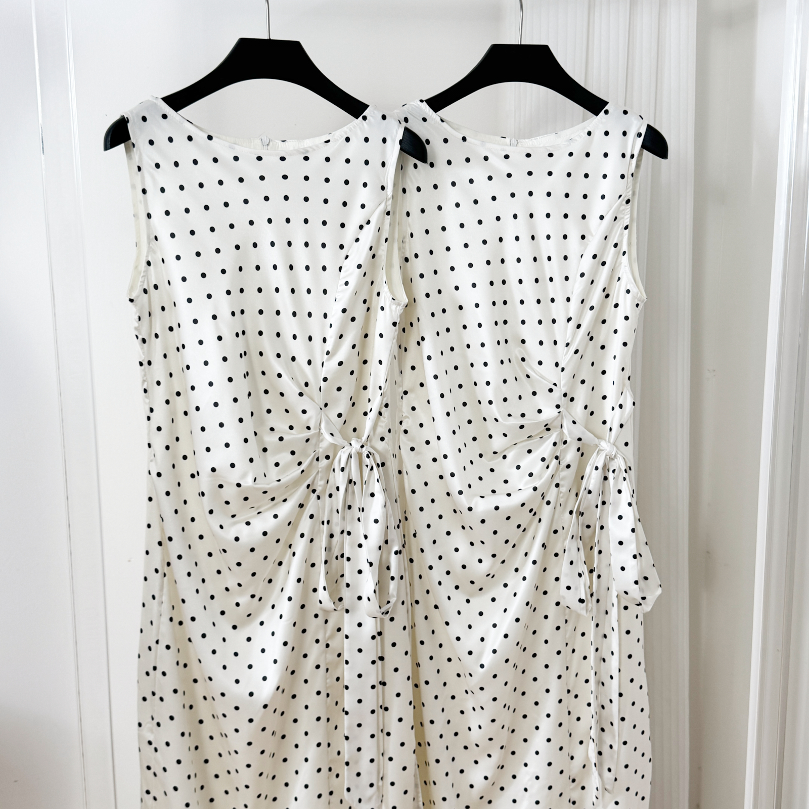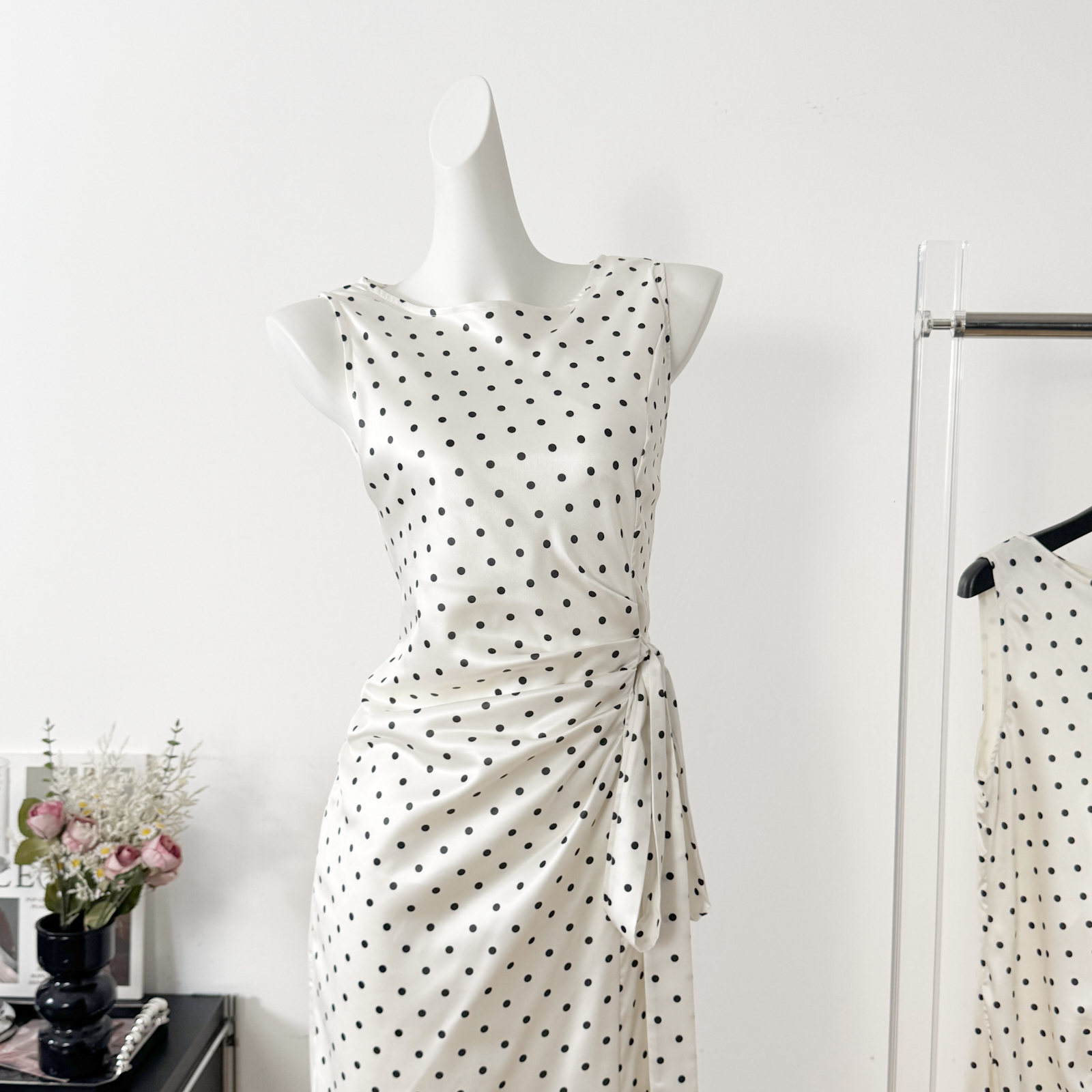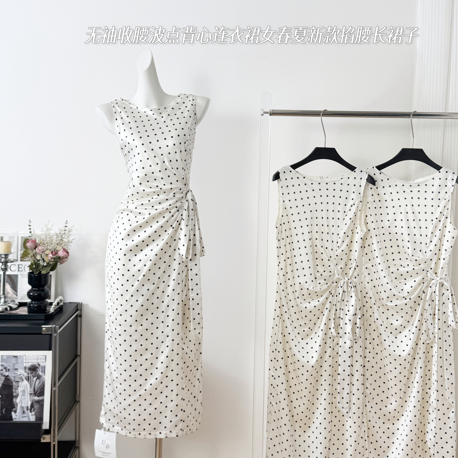 thewangs 아마 민소매 허리 수축 조끼 여성 드레스 2026 여름 특별 아름다운 꼬집기 허리 도트 무늬 치마