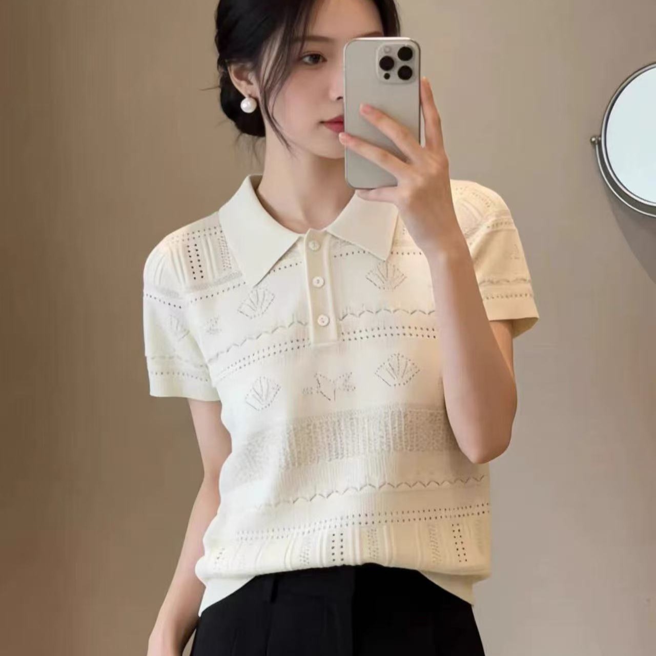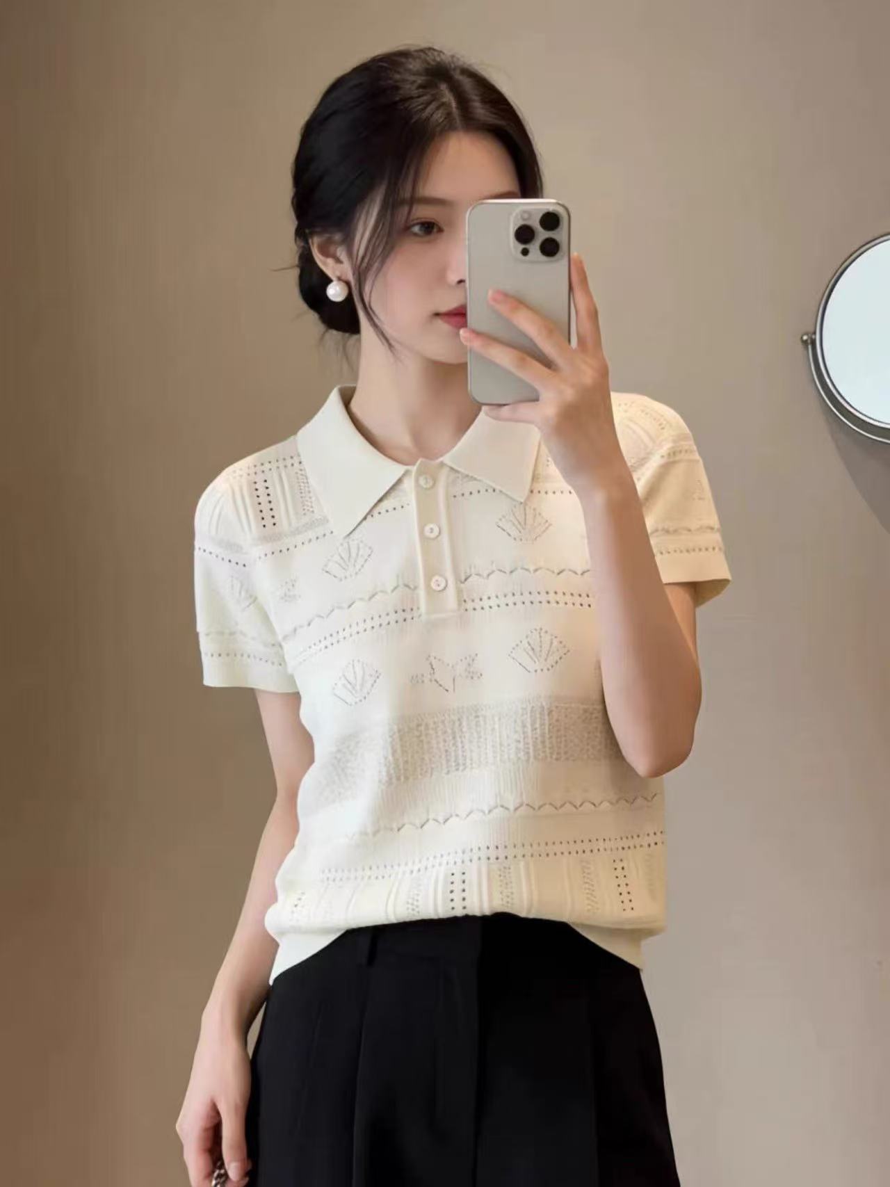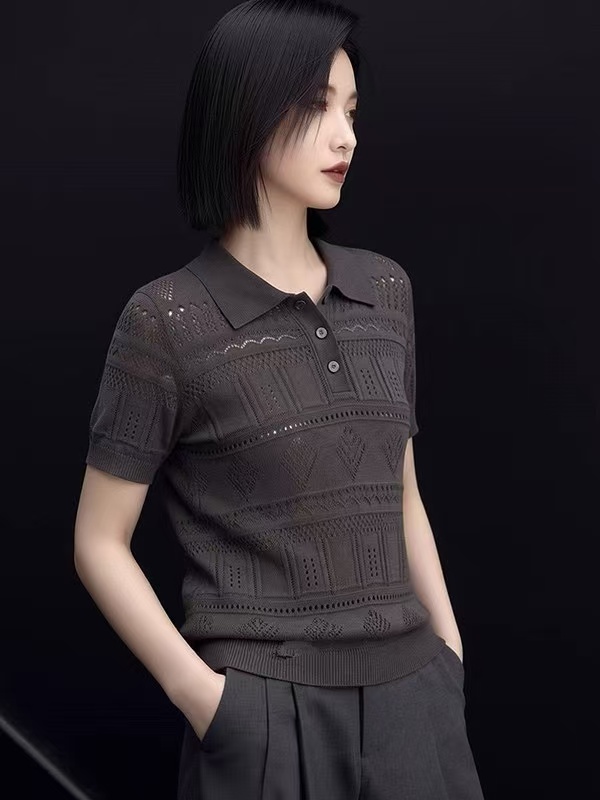 한 부서 자수 홀로우 아웃 폴로 칼라 얼음 실크 니트 반팔 여성 여름 외출용 고급 센스 슬림해 보이는 POLO 셔츠 미니멀리즘 맨위