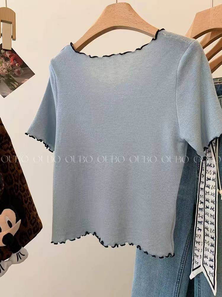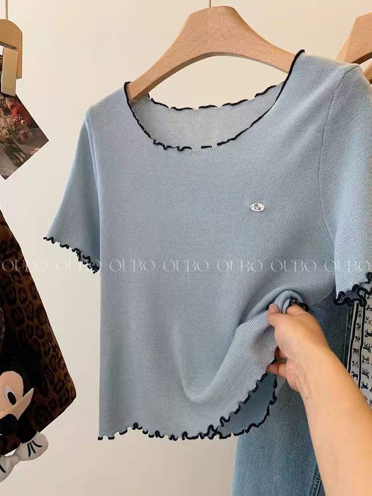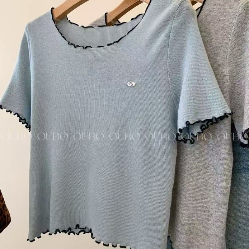 실사 배색 라운드 넥 반팔 티셔츠 나비 매듭 자수 몸매 가꾸기 슬림해 보이는 얼음 실크 니트 스웨터 홀로우 아웃 맨위 chic