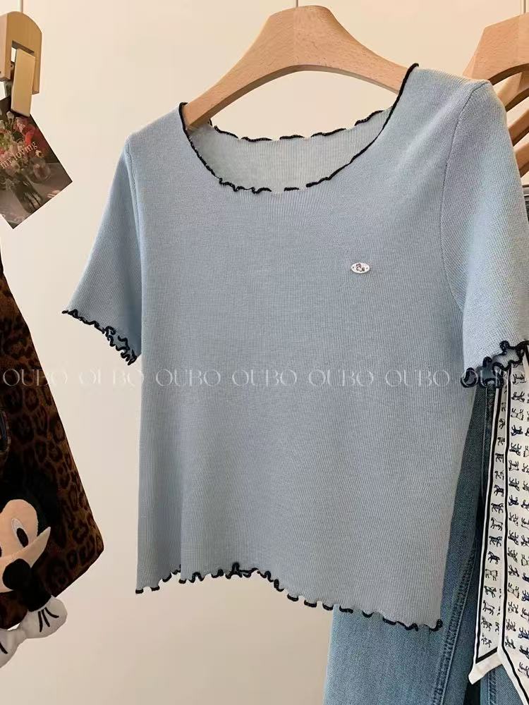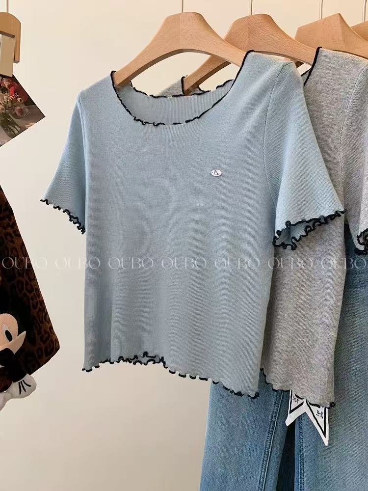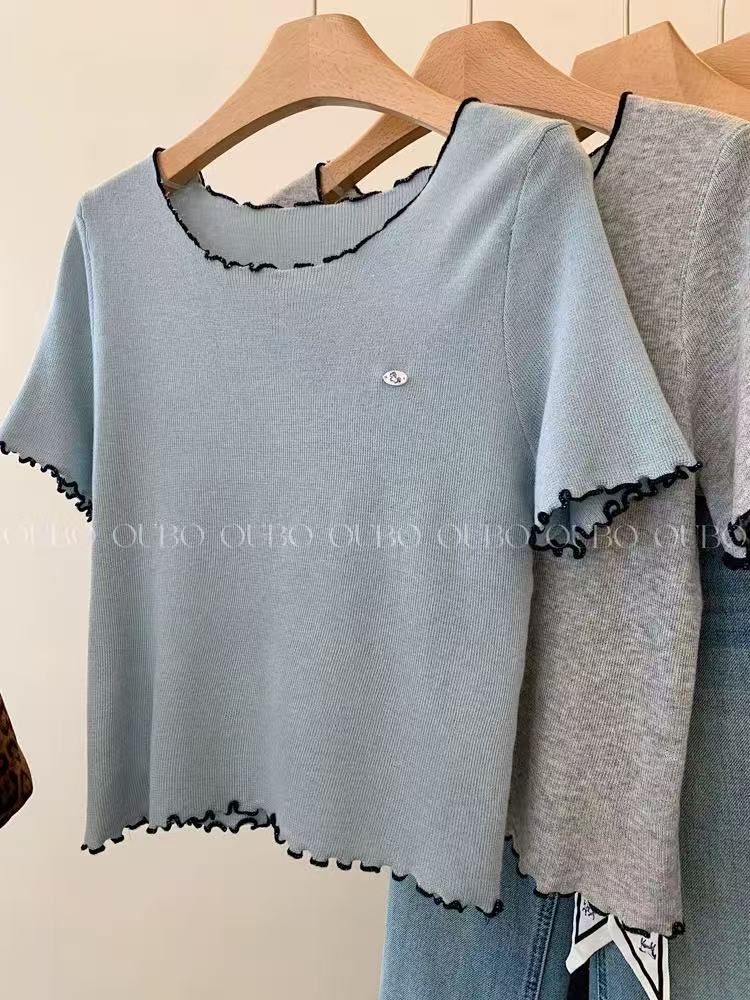 하늘색 라운드 넥 니트 반팔 티셔츠 여성 루즈핏 슬림해 보이는 기본 셔츠 쇼트 스타일 긍정적 인 어깨 작은 맨위 2026 여름