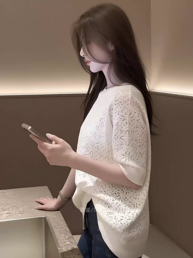 2026 여름 새로운 빛 럭셔리 바람 홀로우 아웃 니트 스웨터 여성 반팔 화이트 루즈핏 슬림해 보이는 빅 사이즈 다용도 맨위