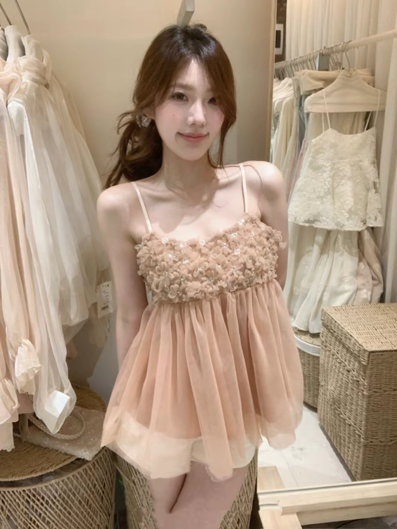 2026 새로운 3 차원 꽃 행침 목 캐미솔 여름 V넥 백리스 부드러운 바람 휴가 민소매 맨위