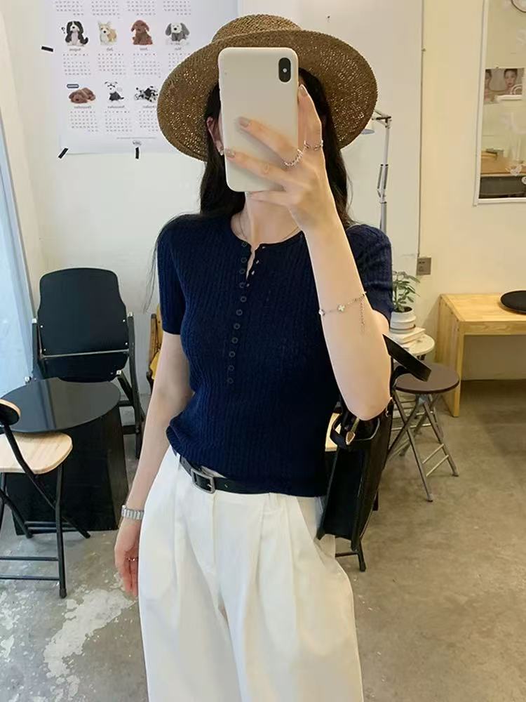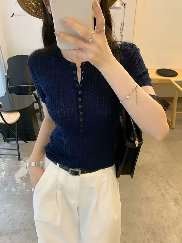 디자인 센스 단색 반팔 니트 스웨터 여성 2026 년 여름 새로운 한국 스타일 싱글 줄 버튼 슬림해 보이는 패션 맨위