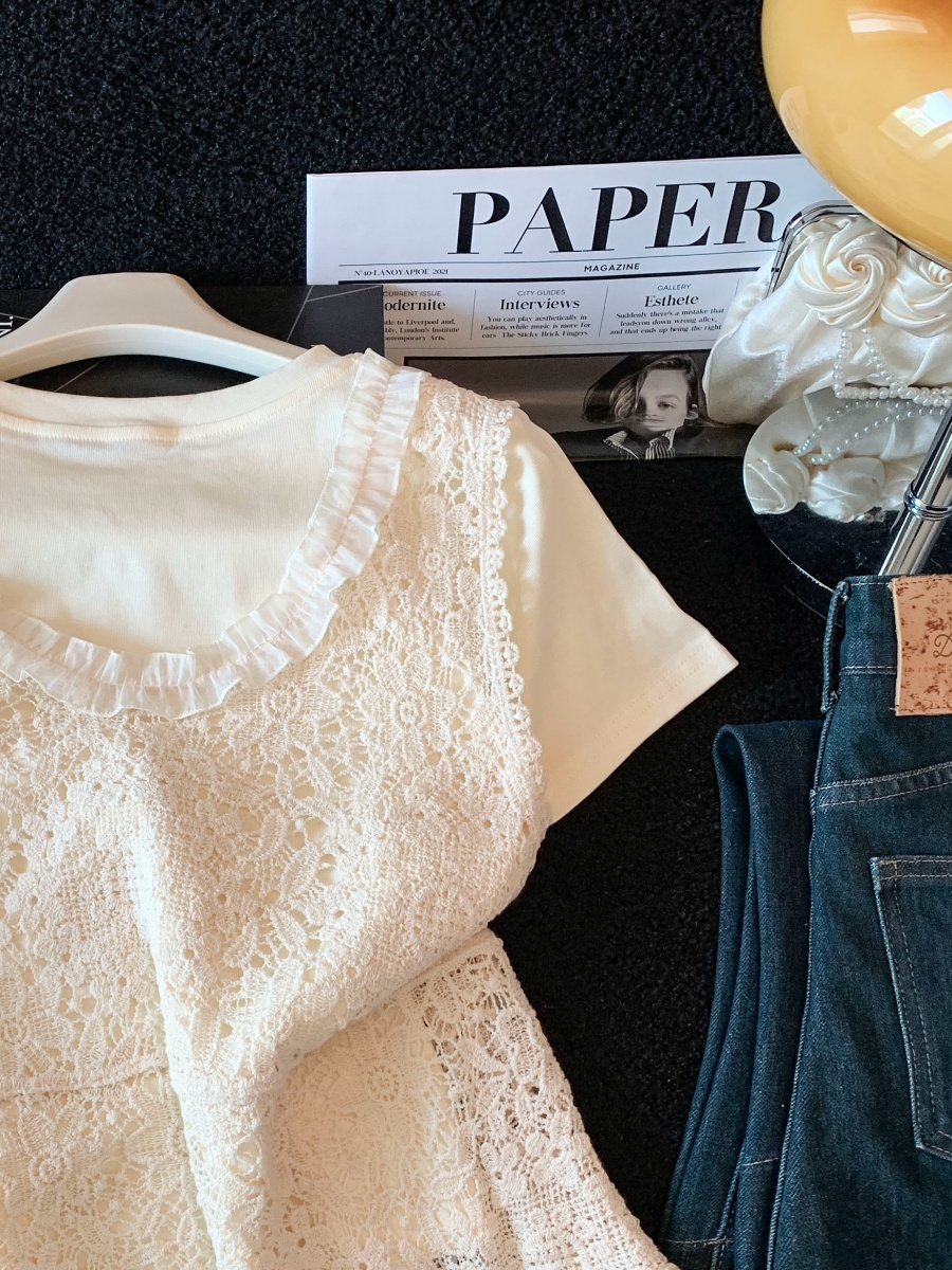실사 작은 청신 프랑스식 패치워크 프릴 레이스 측면 이중 버튼 셔츠 여름 베이비 칼라 연령 감소 맨위