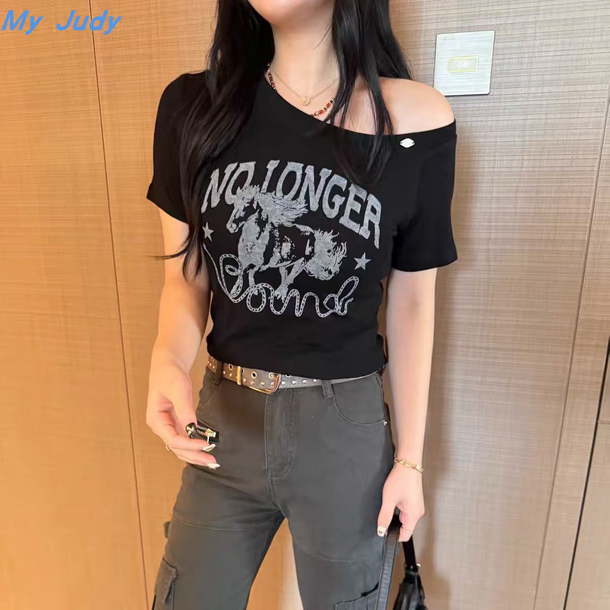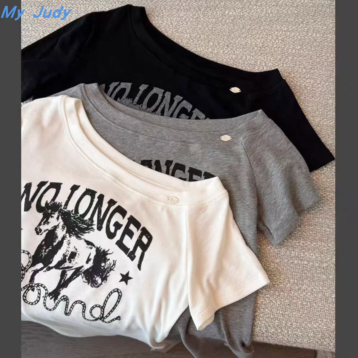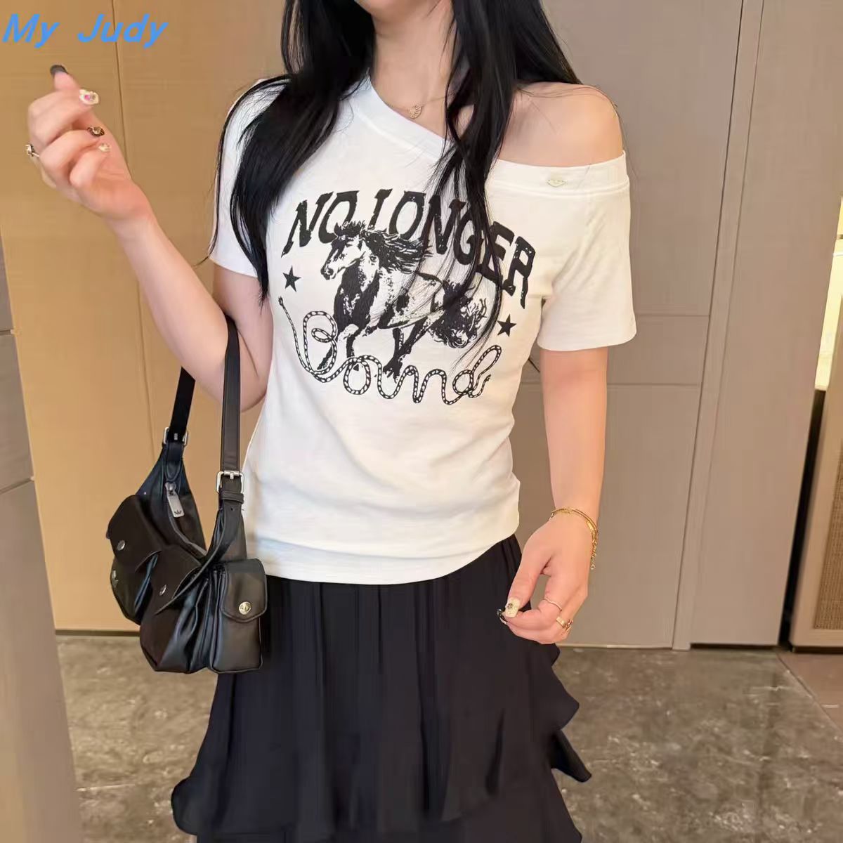 2026 한 부서 디자인 센스 몸매 가꾸기 슬림해 보이는 Chic 패턴 알파벳 프린트 비스듬한 어깨 반팔 티셔츠 여성 여름 새로운