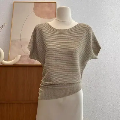 한 부서 chic 부드러운 느긋한 바람 니트 반팔 티셔츠 여성 여름 2025 새로운 품격 허리 수축 고급 센스 맨위