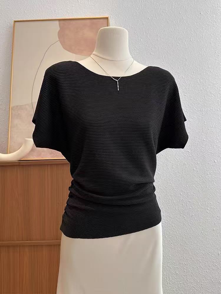 검정색 비스듬한 칼라 오프숄더 반팔 티셔츠 여성 2025 년 여름 새로운 디자인 센스 슬림해 보이는 맨위