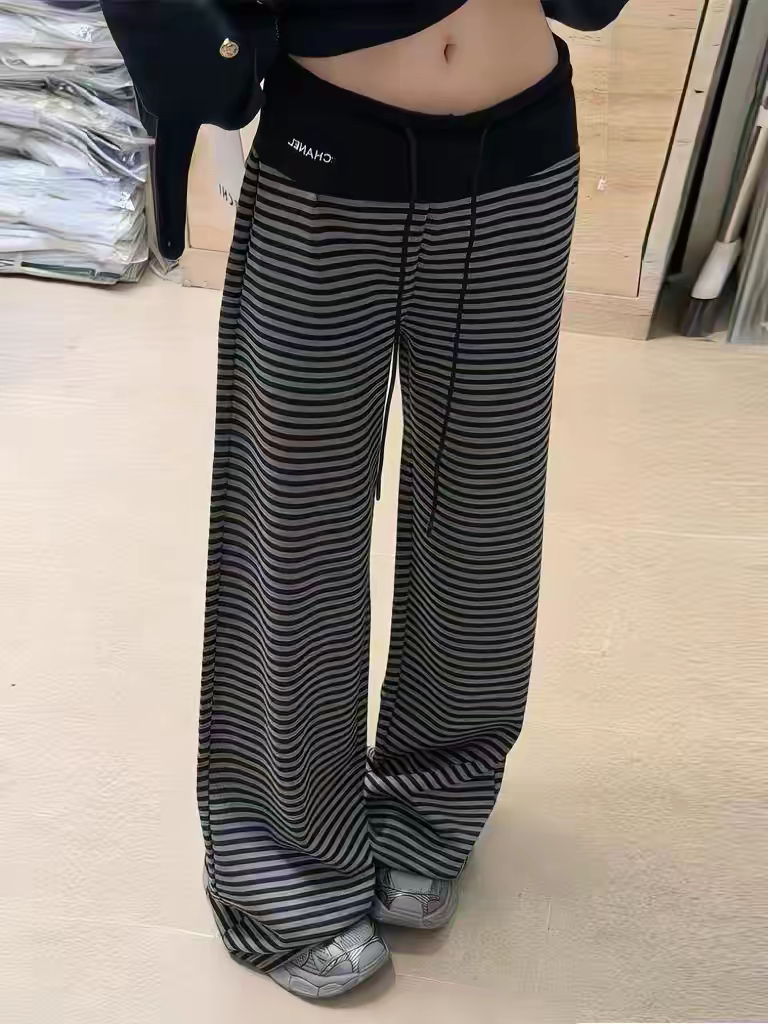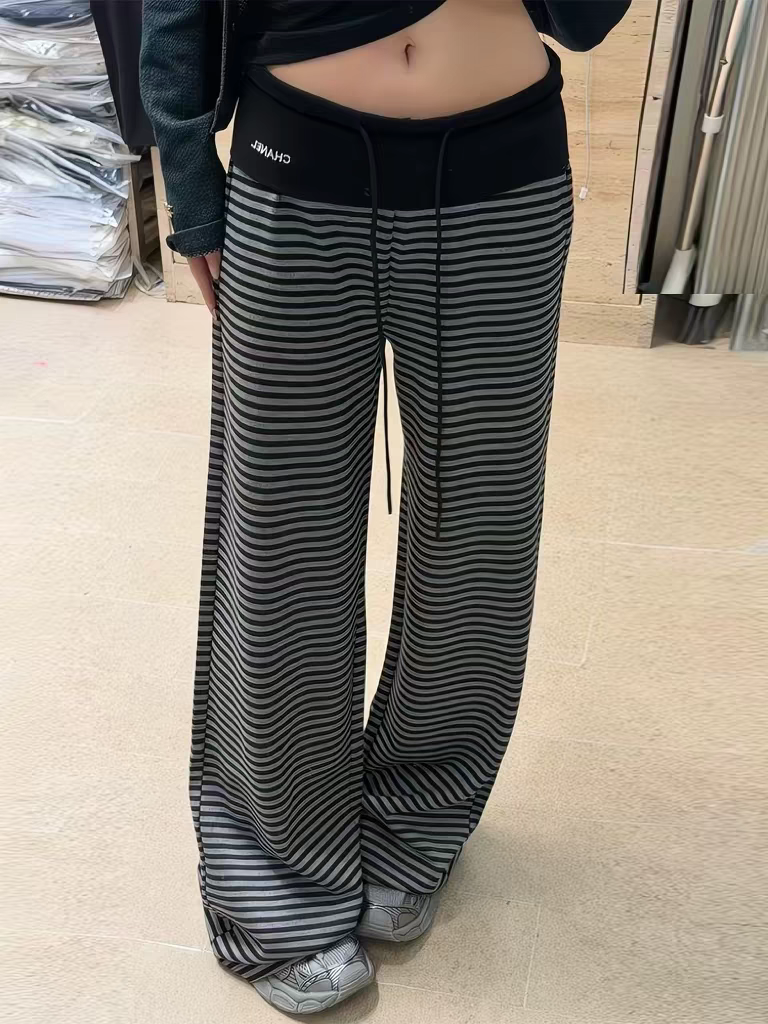 한국 스타일 하이웨이스트 자수 알파벳 스트라이프 와이드 레그 팬츠 느긋한 바람 레이스업 루즈핏 캐주얼 바지 다용도 슬림해 보이는 바지