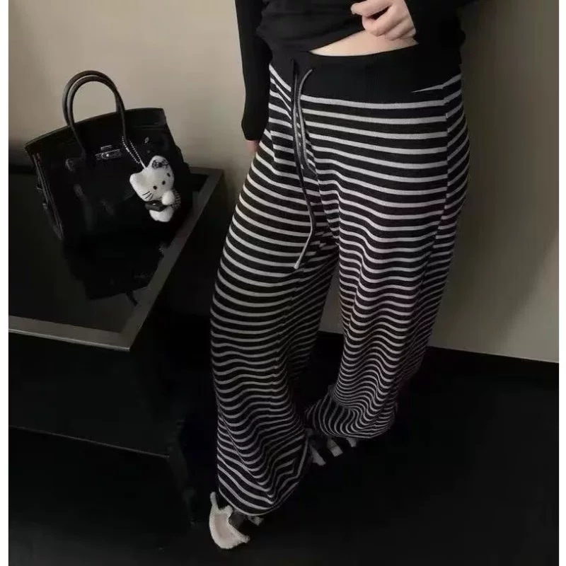 한 바람 chic 허리밴드 흑인과 백인 체크무늬 스트레이트 캐주얼 바지 여성 루즈핏 도루 가을 센스 하이웨이스트 와이드 레그 팬츠