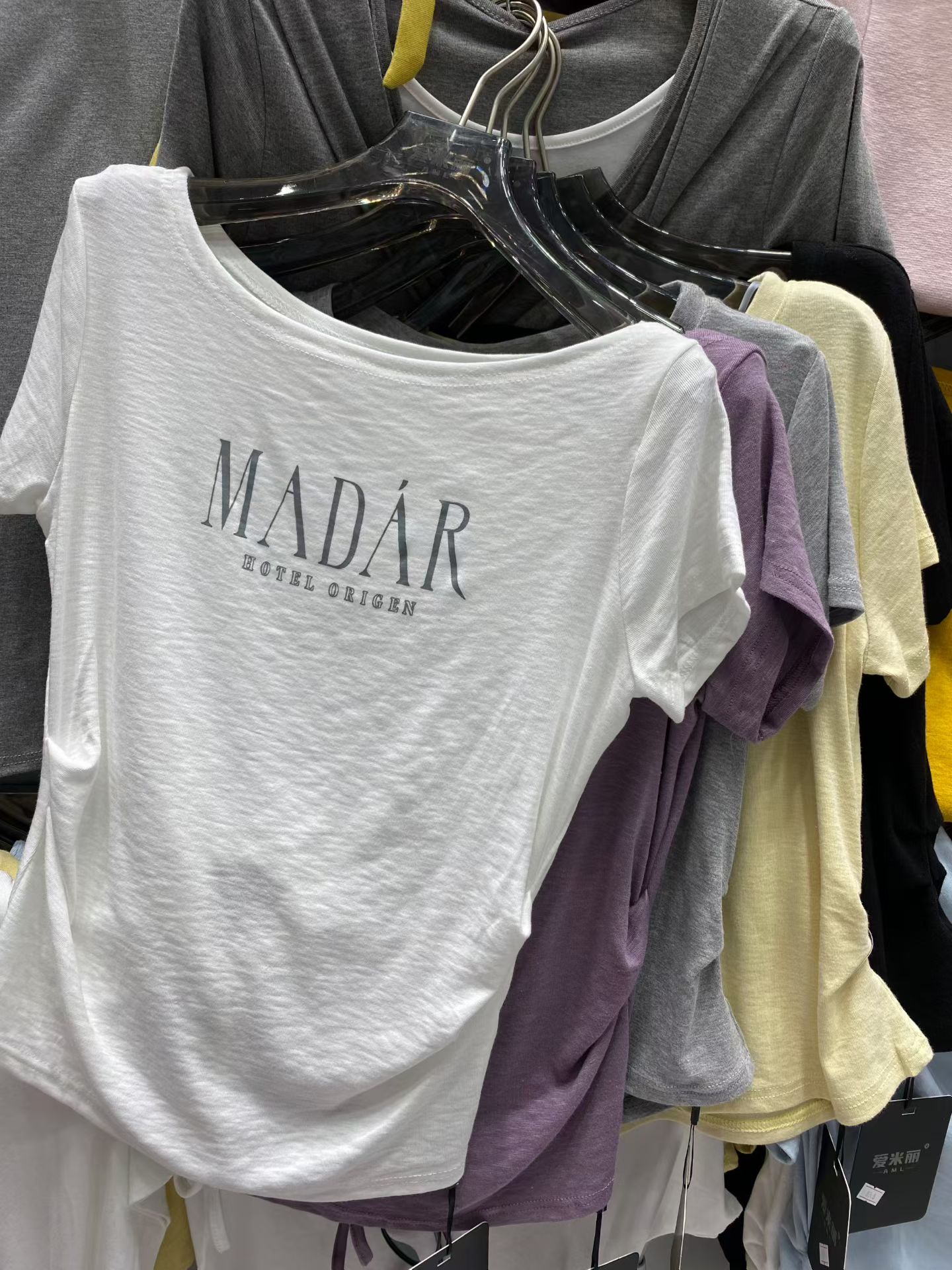 열세 개 여성 의류 아메리칸 고유 한 또한 아주 좋아. 비스듬한 어깨 반팔 티셔츠 여성 여름 섹션 몸매 가꾸기 슬림해 보이는 핫걸 맨위