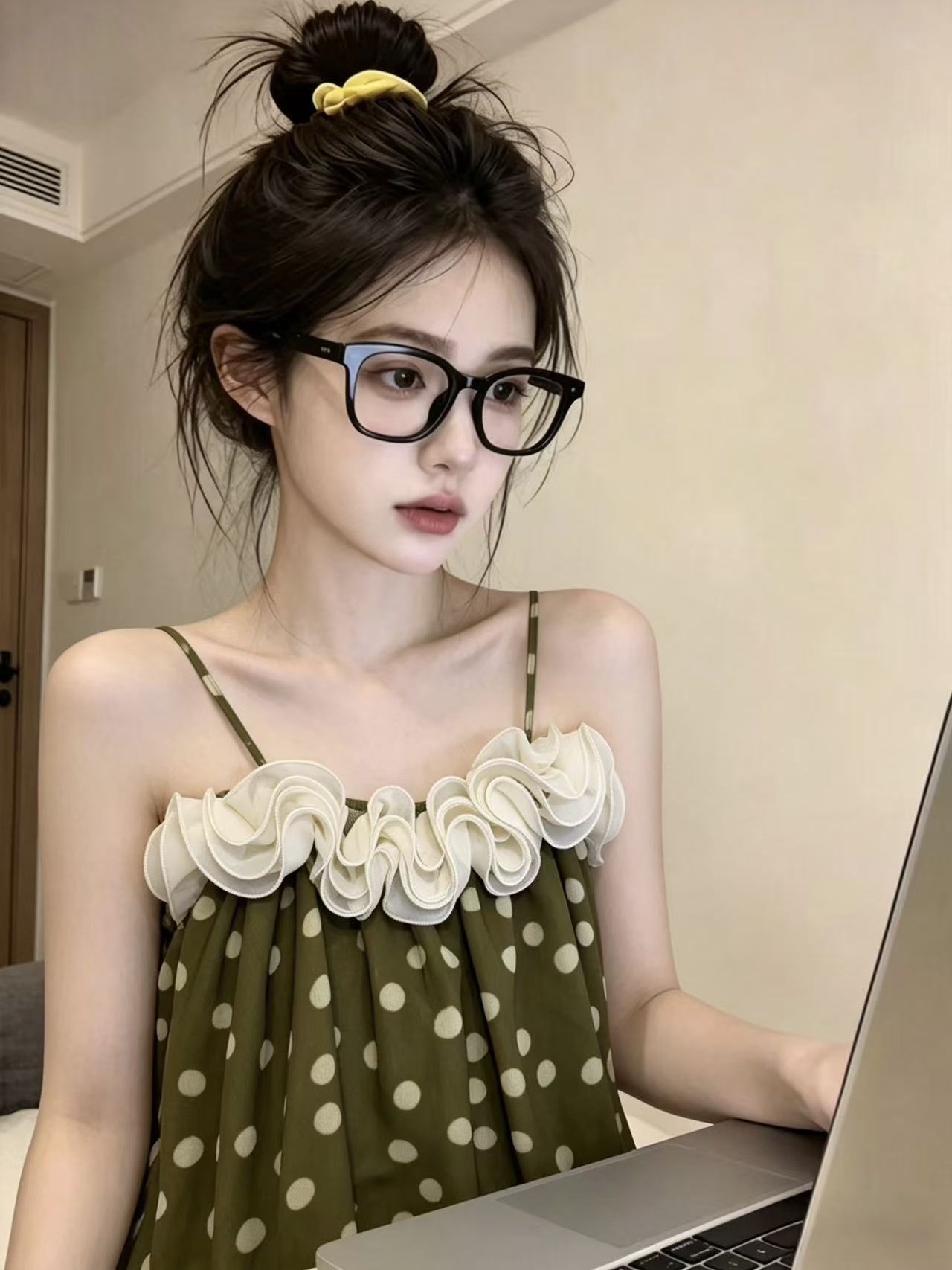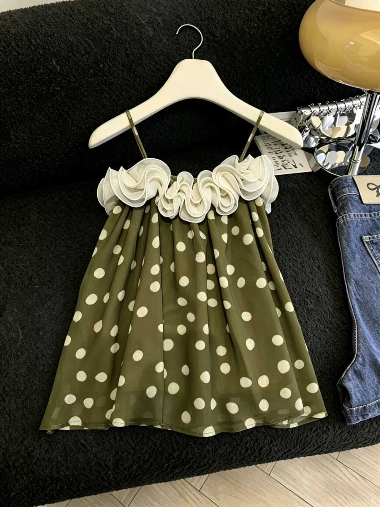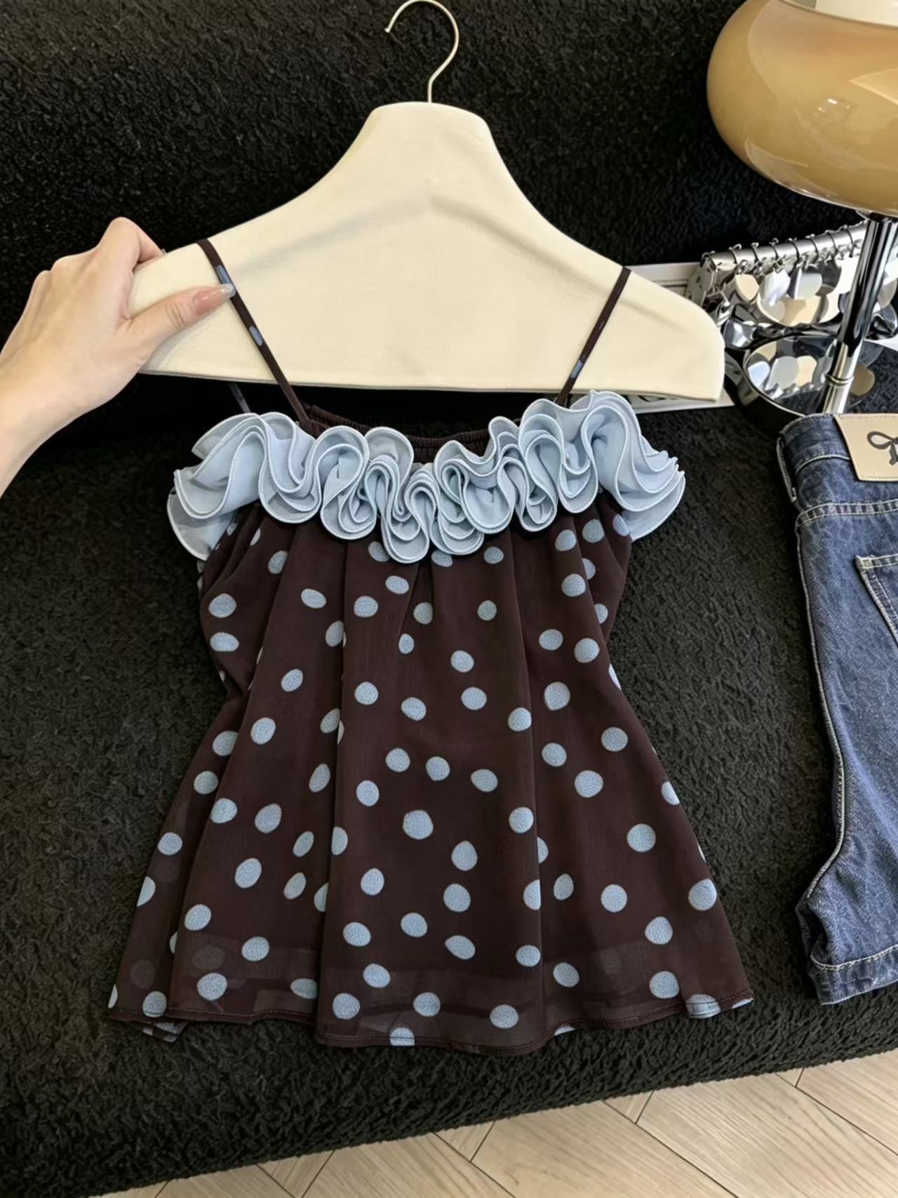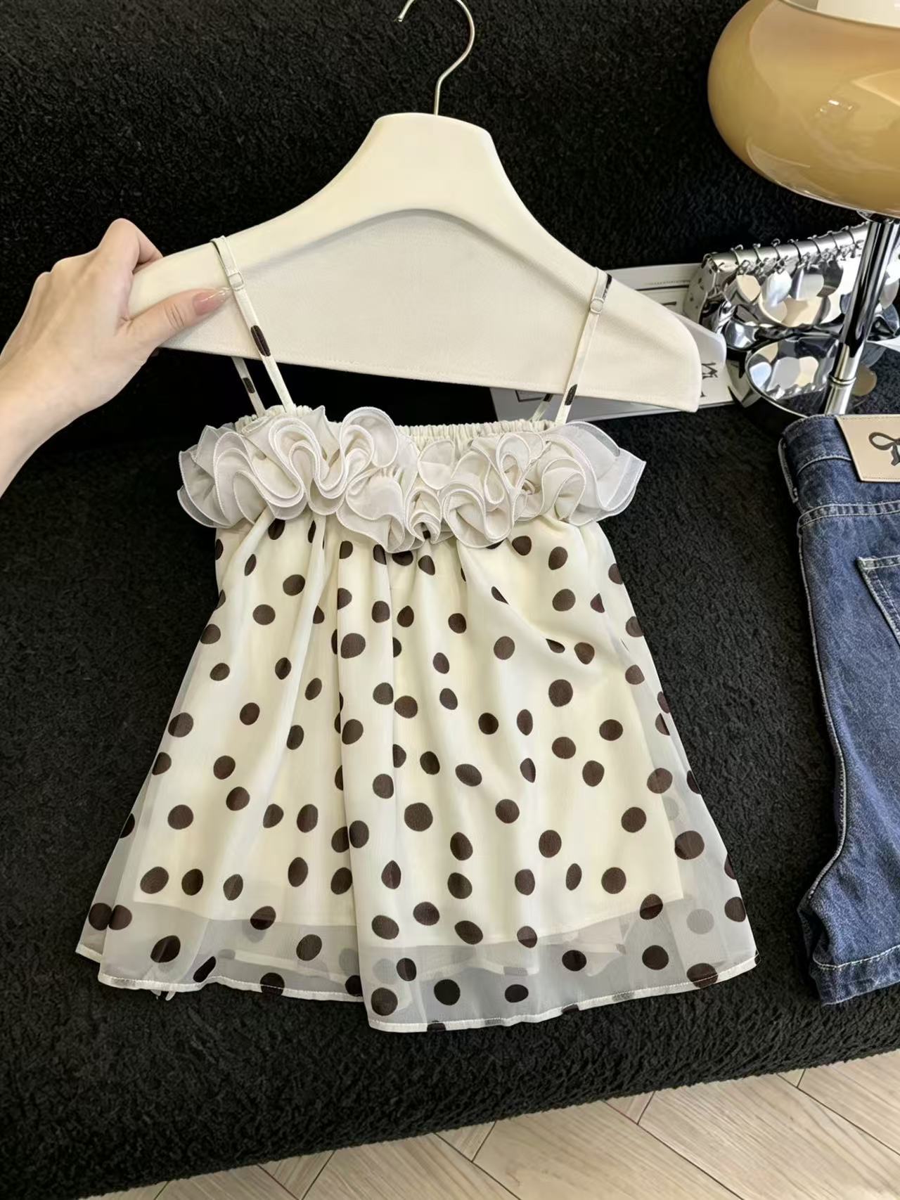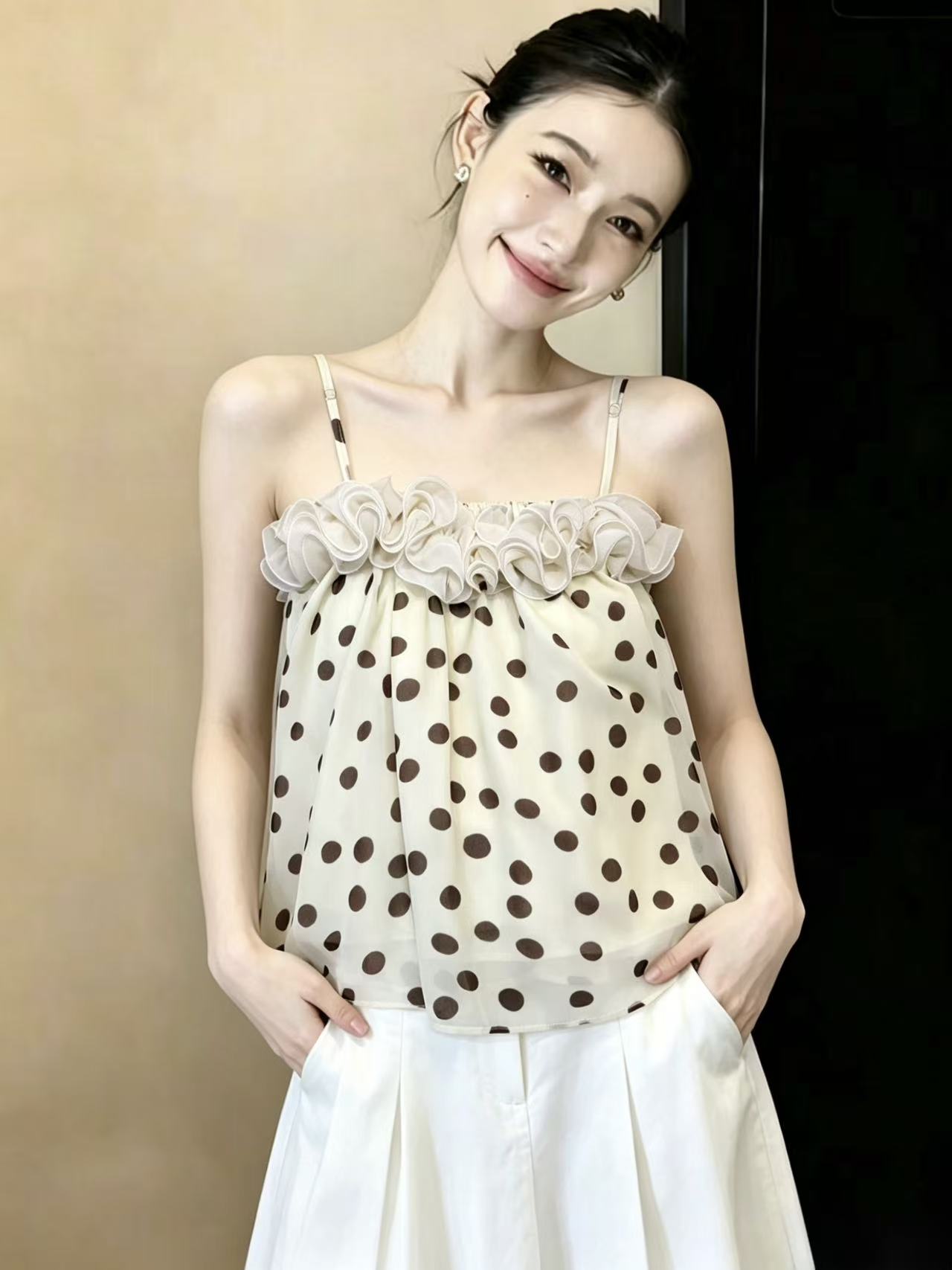 실사 달콤함 소녀 바람 레이스 패치워크 도트 무늬 캐미솔 패션 도루 센스 루즈핏 연령 감소 맨위 chic