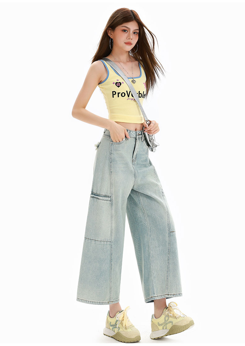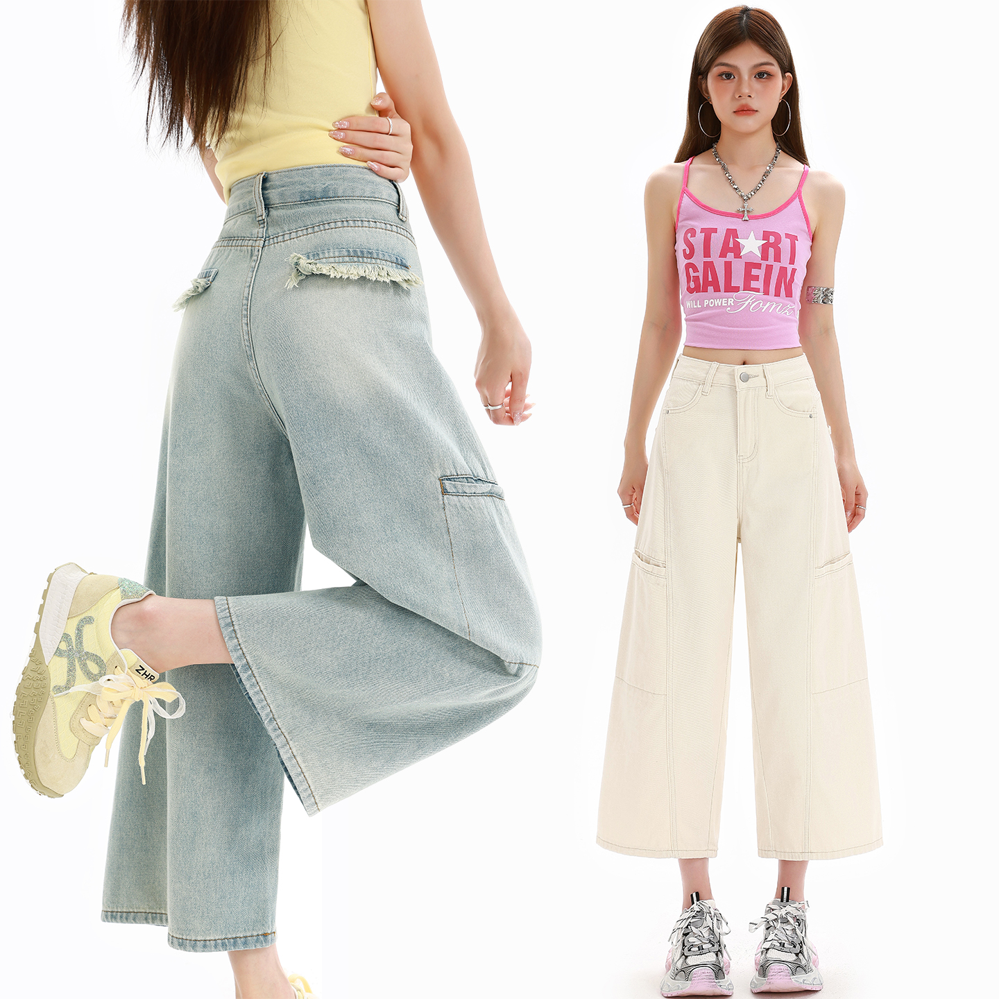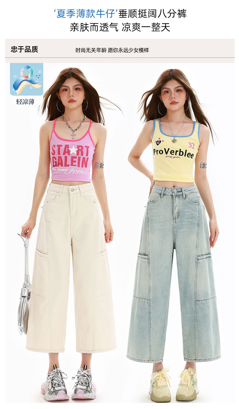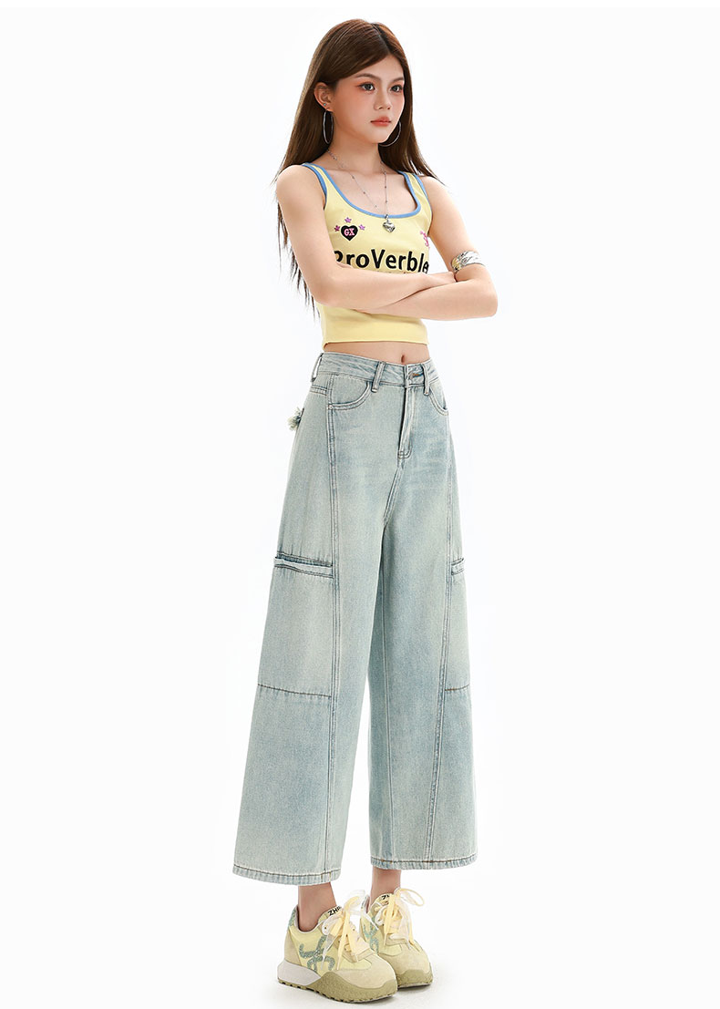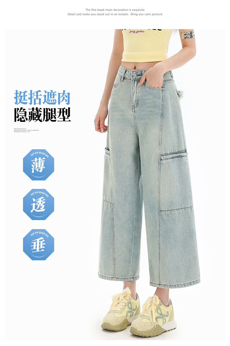 실사 하이웨이스트 하늘색 패치워크 넓은 다리 청바지 여성 여름 새로운 작은 키 워크웨어 바람 바지 슬림해 보이는 바지