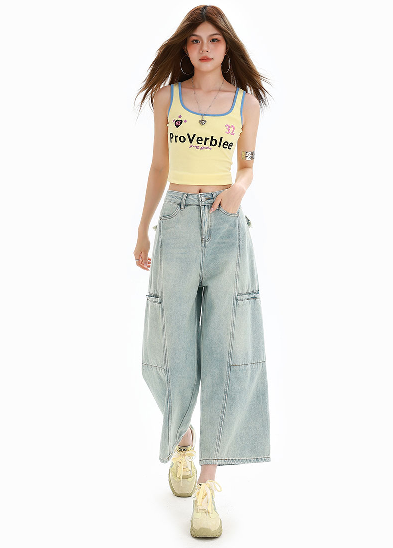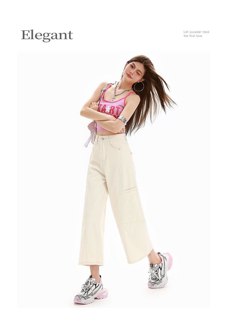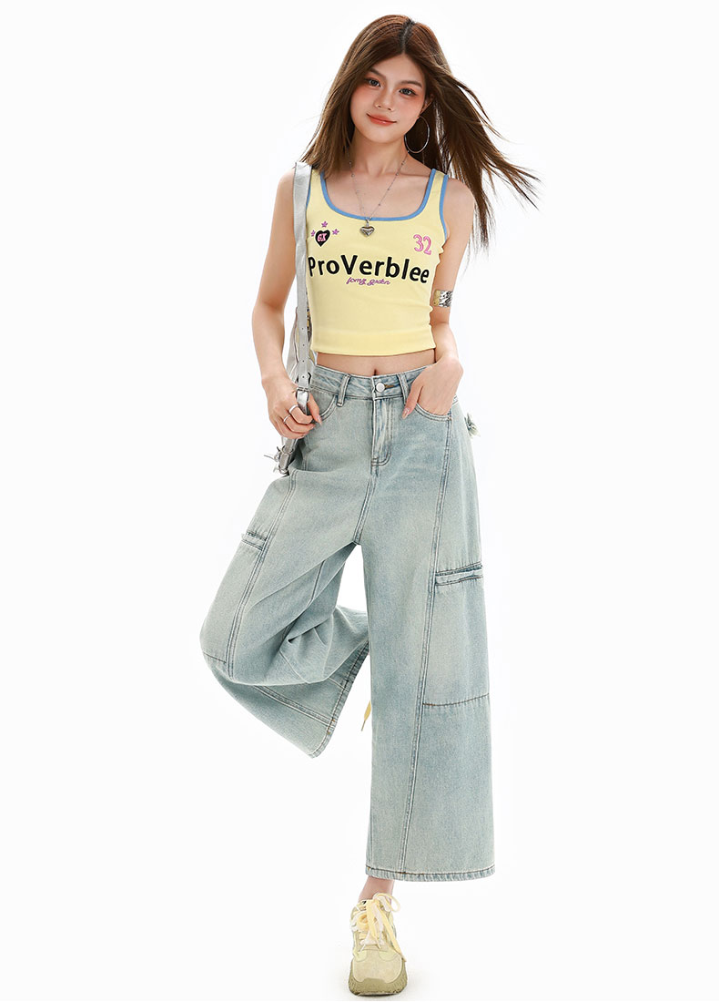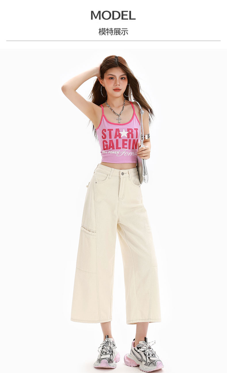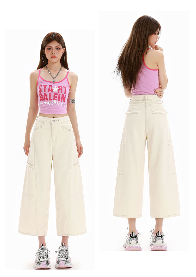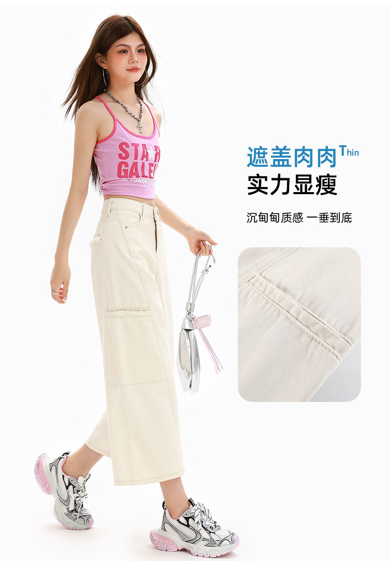 실사 하이웨이스트 하늘색 패치워크 넓은 다리 청바지 여성 여름 새로운 작은 키 워크웨어 바람 바지 슬림해 보이는 바지
