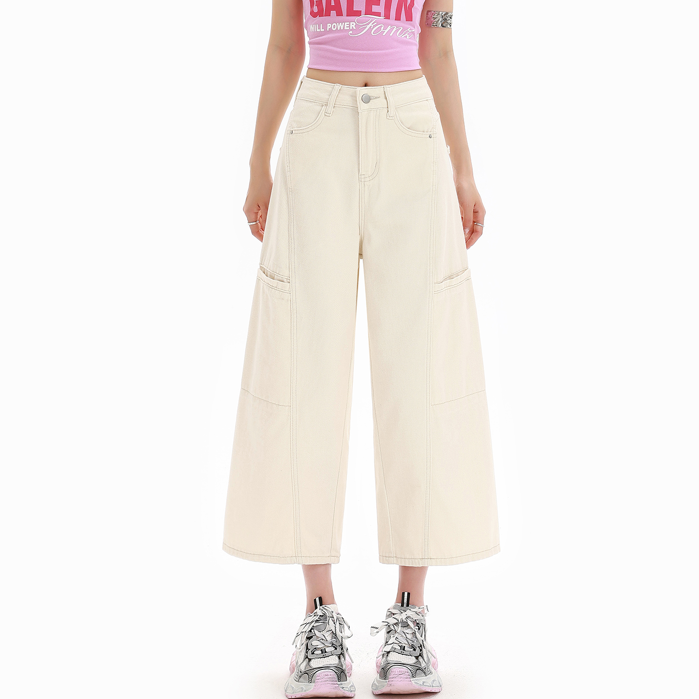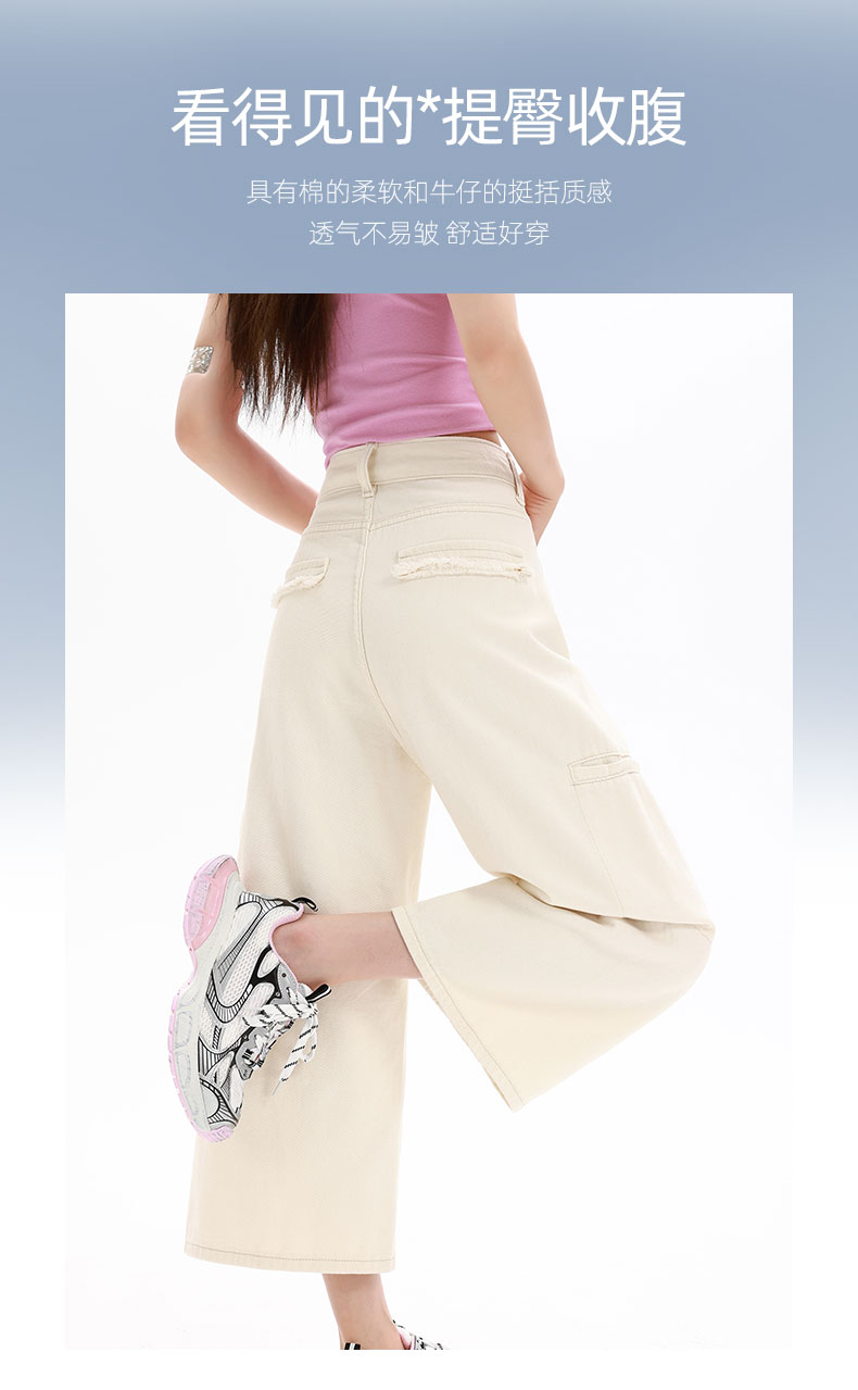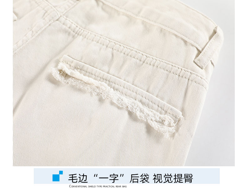 실사 베이지 색 5 점 데님 반바지 여성 여름 얇은 스타일 하이웨이스트 슬림해 보이는 볼륨 측면 루즈핏 넓은 다리 스트레이트 바지