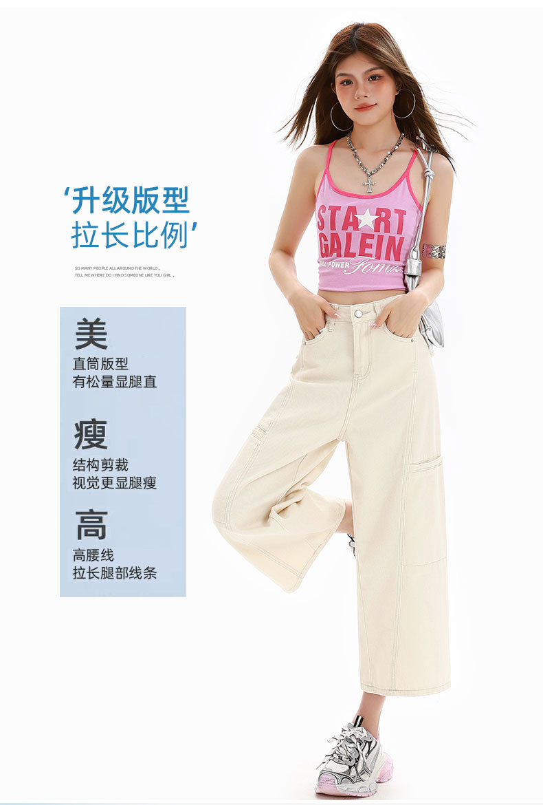 실사 레이스 레이스 스트레이트 청바지 여성 작은 키 여름 새로운 7 점 와이드 레그 팬츠 하이웨이스트 루즈핏 바지