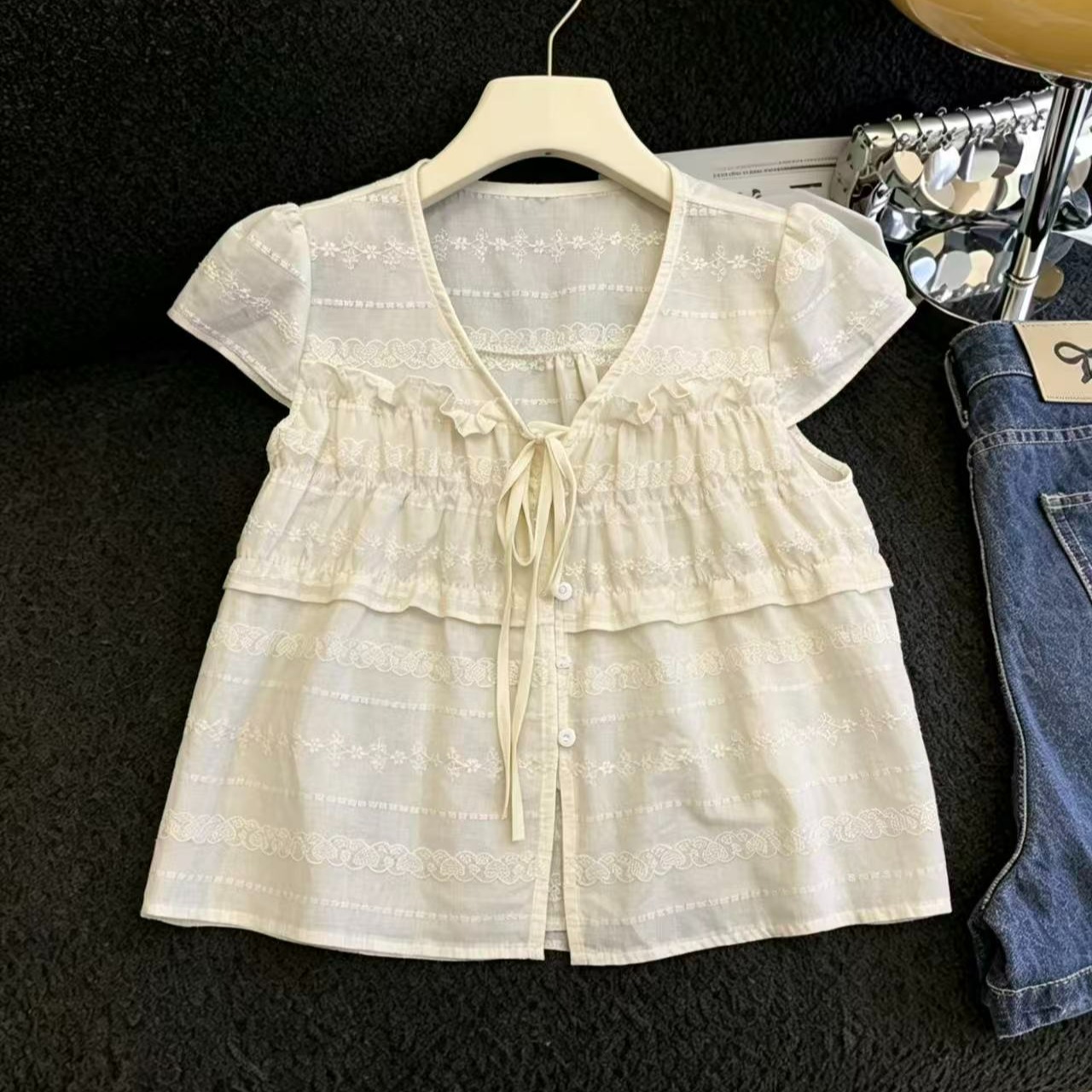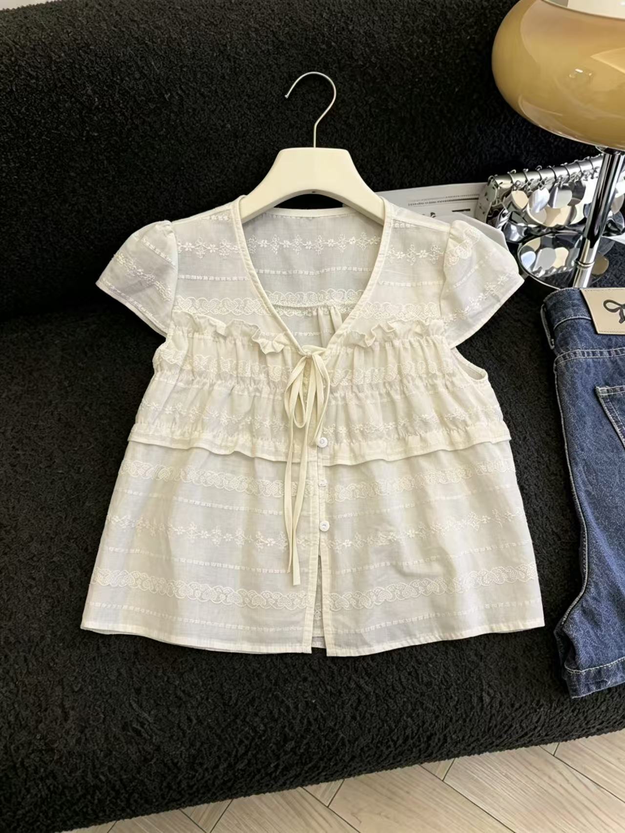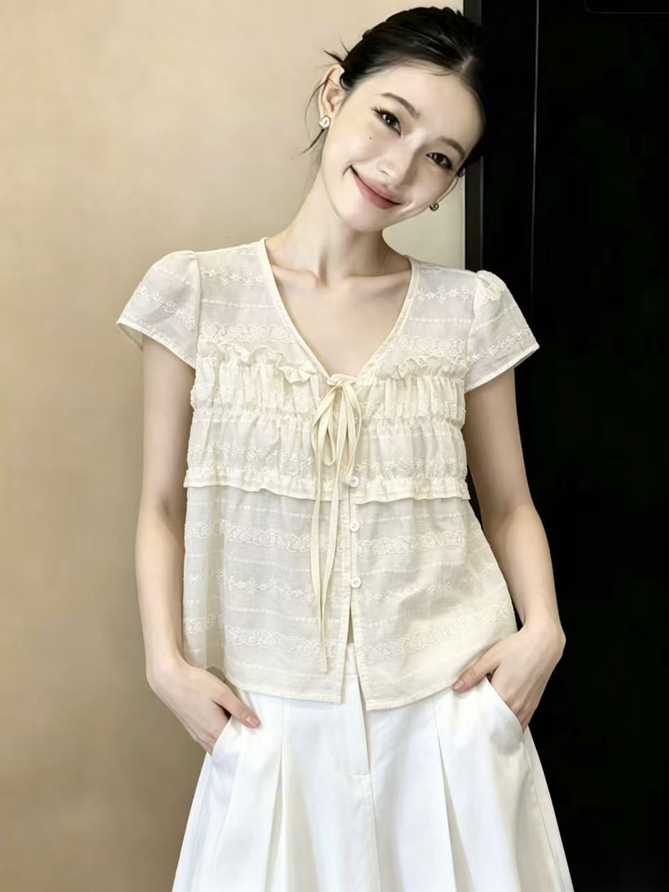 실사 달콤한 자매 작은 날다 소매 레이스 측면 거즈 작은 셔츠 여성 여름 미니멀리즘 다용도 풀오버 슬림해 보이는 캐주얼 맨위 chic
