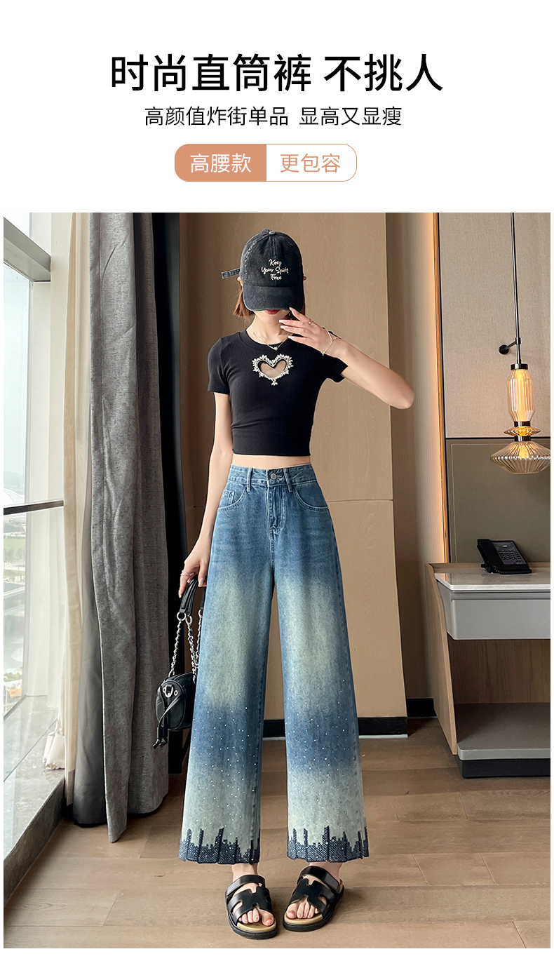실사 찢어진 부분 핫픽스 넓은 다리 청바지 여성 2026 여름 새로운 하이웨이스트 슬림해 보이는 디자인 센스 스트레이트 바닥 청소 바지